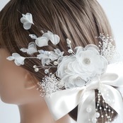 オーガンジーフラワーとクリスタルのアクセサリーパーツとサテンリボンやかすみ草を組み合わせた