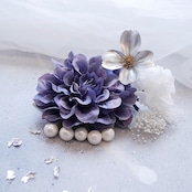 大きめのダリアとドライフラワー、流行りのパールを組み合わせた髪飾りです。