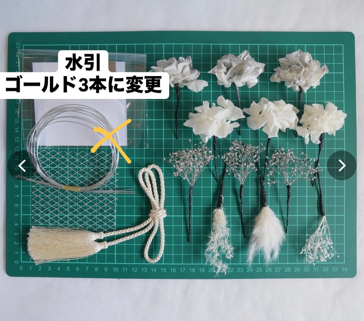 ドライフラワーと水引 シルバーメッシュ 白タッセルを組み合わせた華やかなセットです。