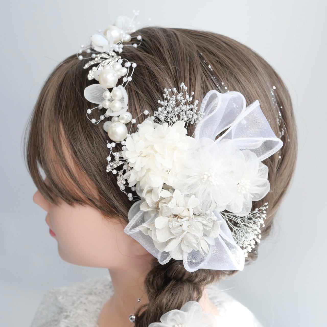 繊細でロマンチックな印象を与える髪飾りで、特別な日の装いをより引き立ててくれます。
