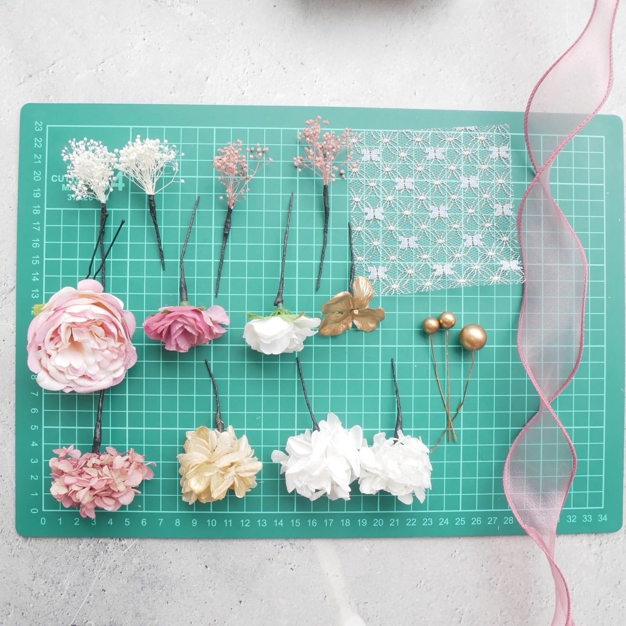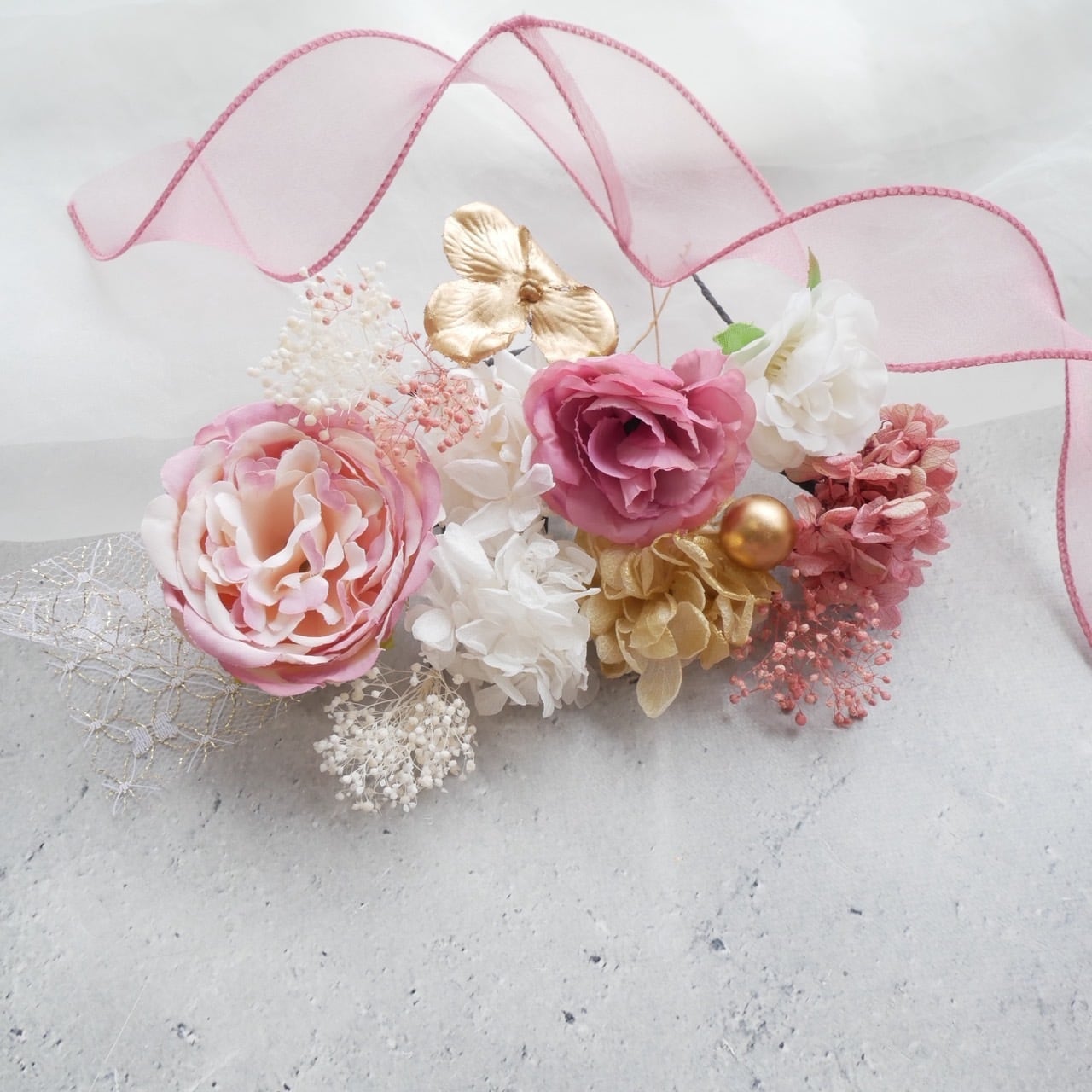 アーティシャルフラワーのローズと、ドライフラワー、カーリーリボンを使用しました。