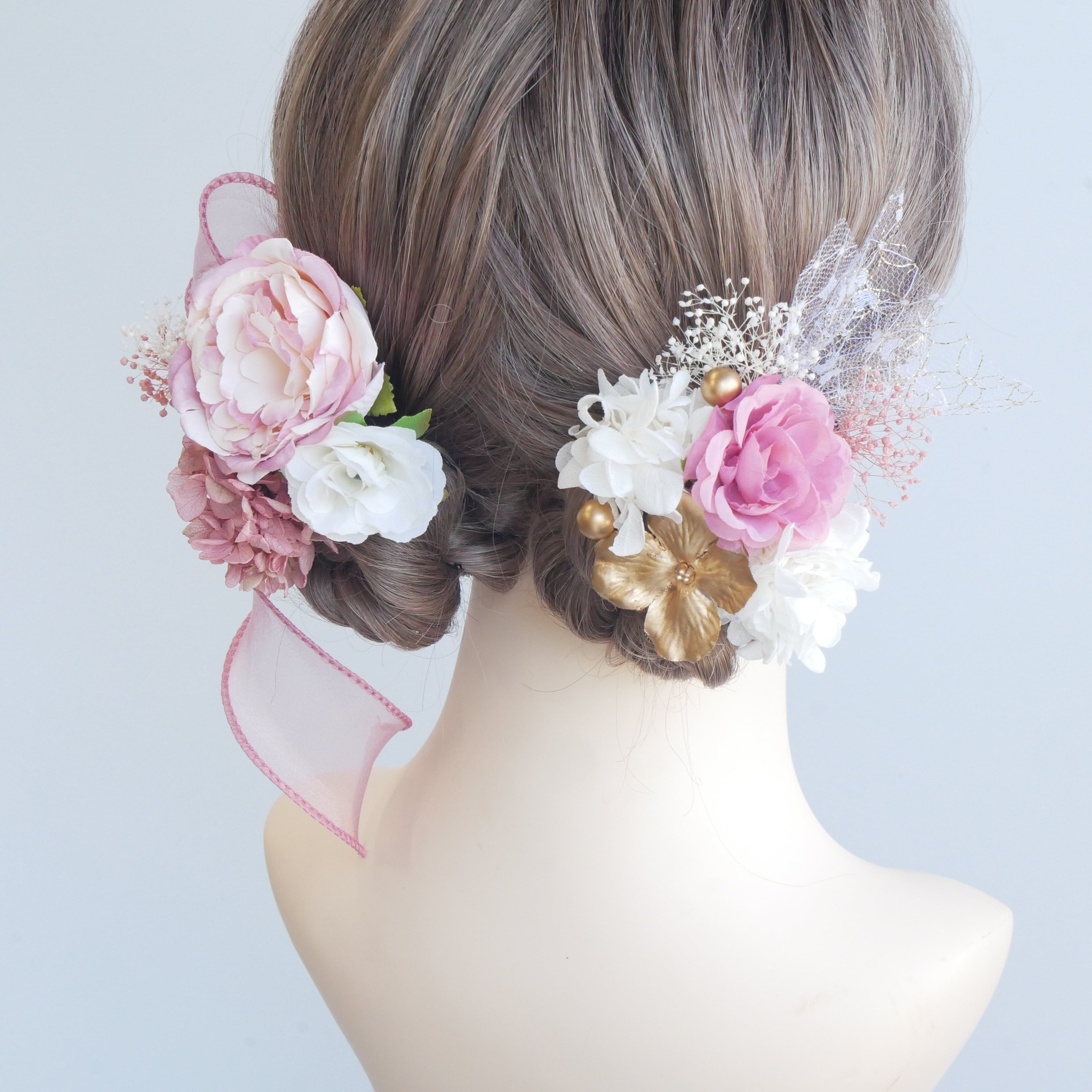 A234 ピンク ツイン ローズ ドライフラワー髪飾り リボン 卒業式 袴 成人式 振袖 結婚式