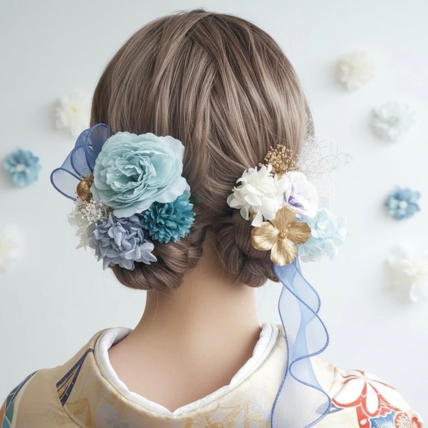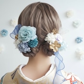 A235 水色 ツイン ローズ ドライフラワー髪飾り リボン 卒業式 袴 成人式 振袖 結婚式