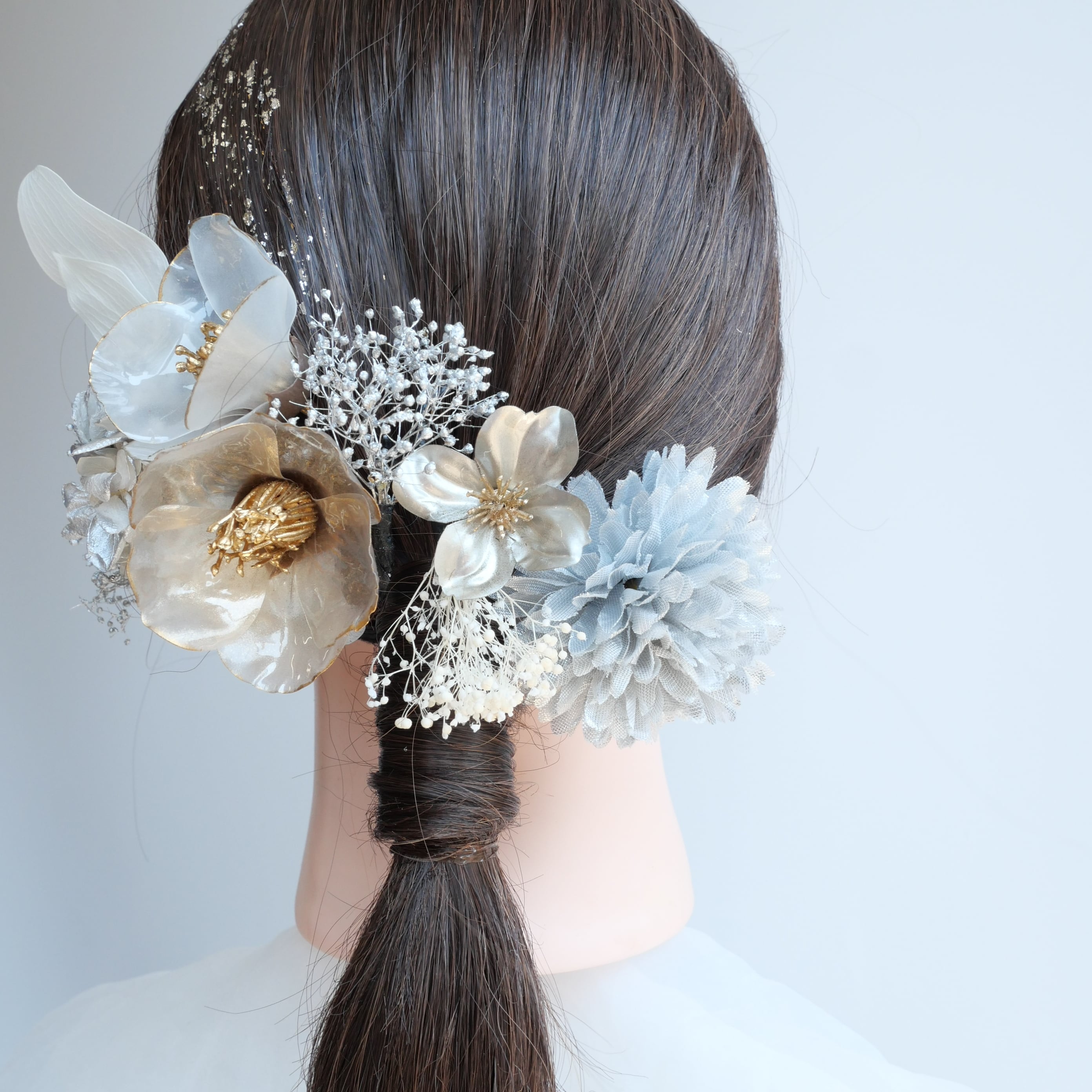 シルバーの花々と白のアクセントで、後ろ姿までぐっと華やかに。