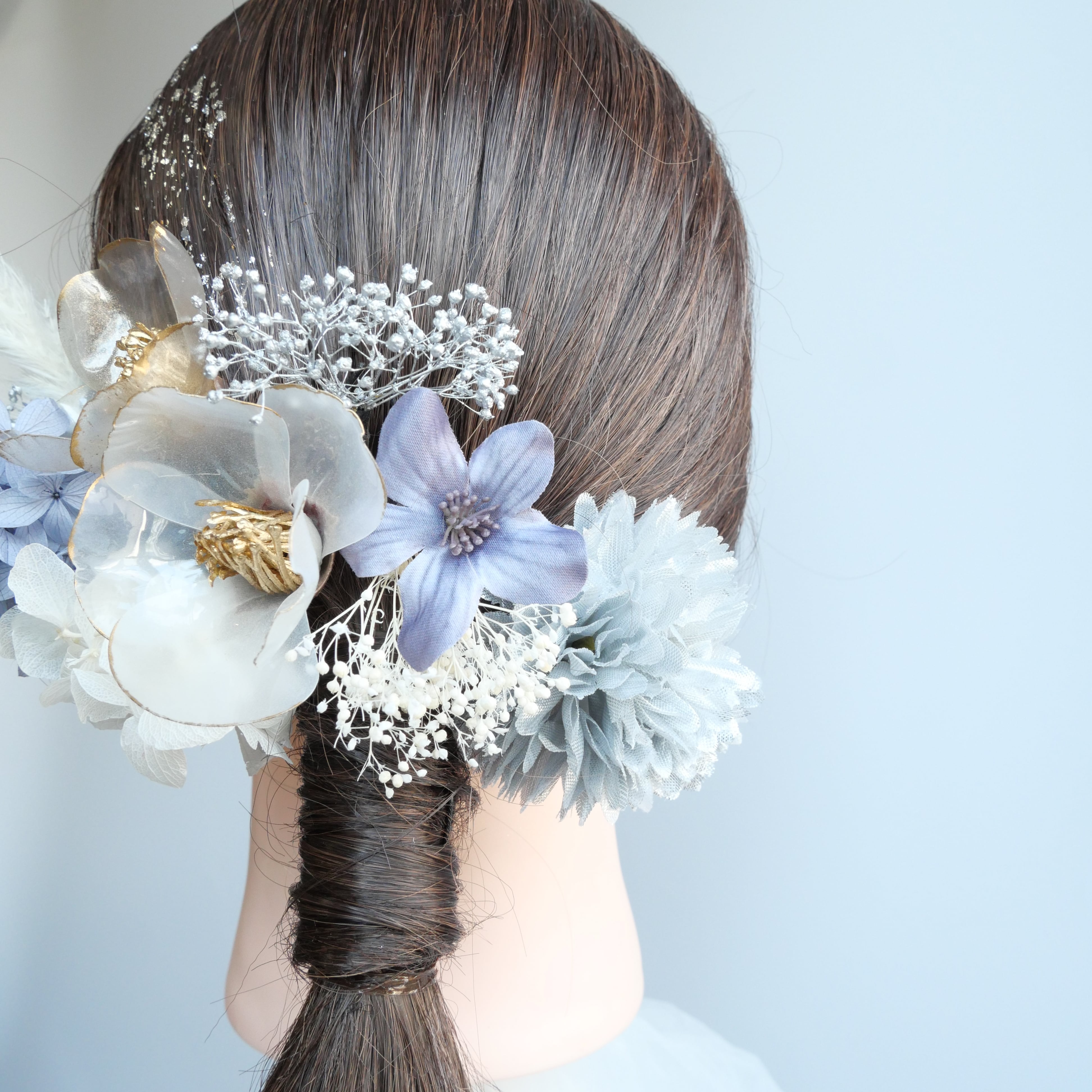 シルバーと白の花々とブルーのアクセントで、後ろ姿までぐっと華やかに。