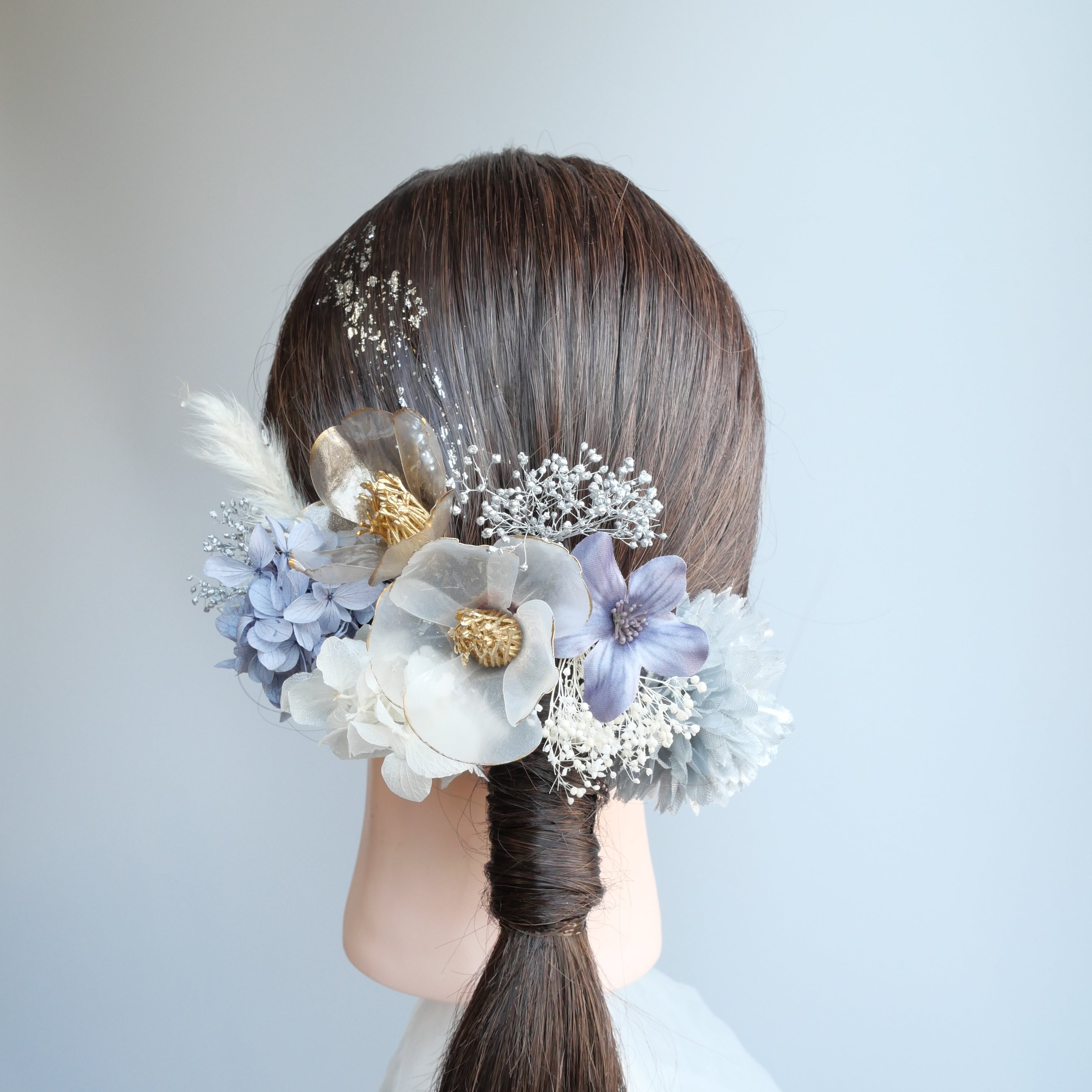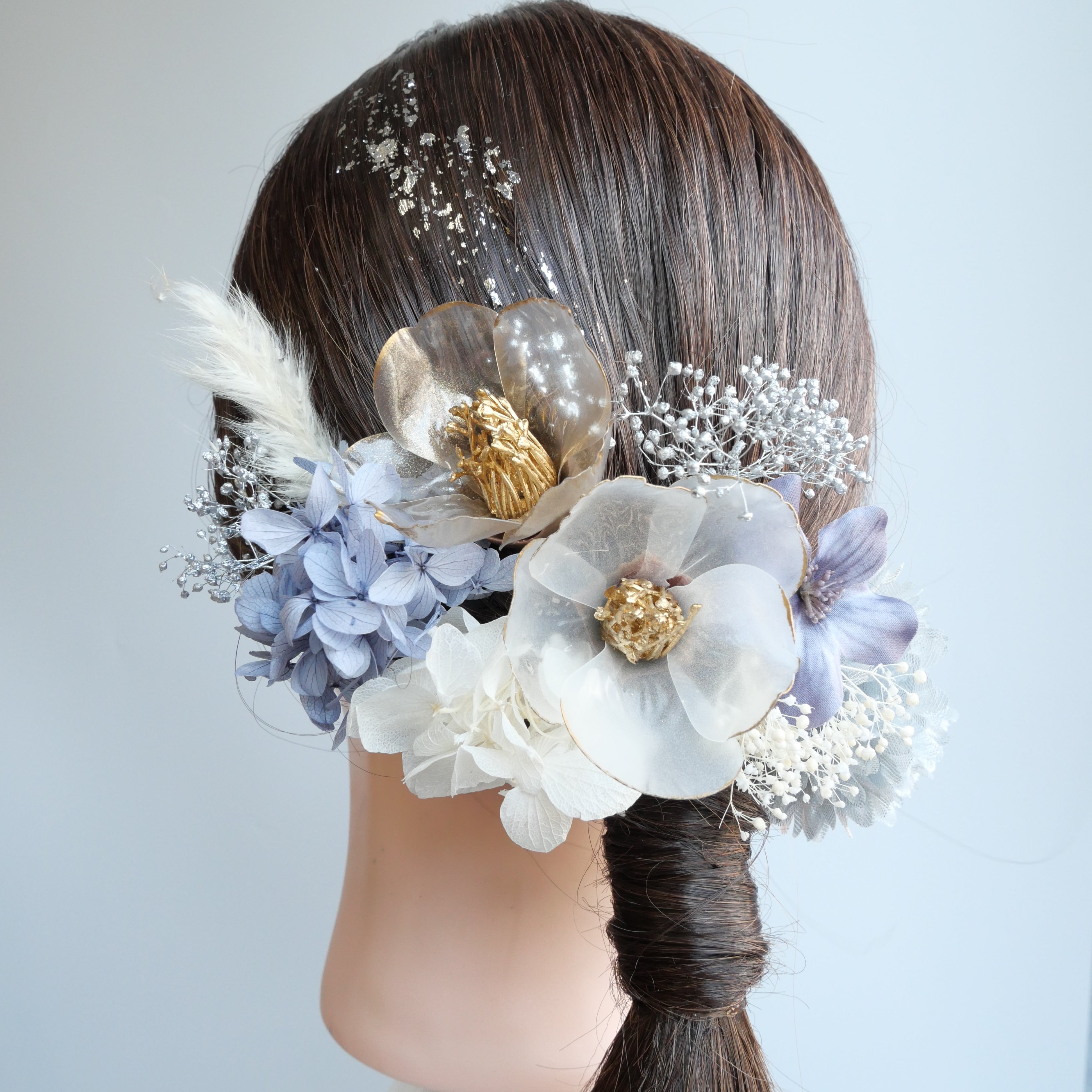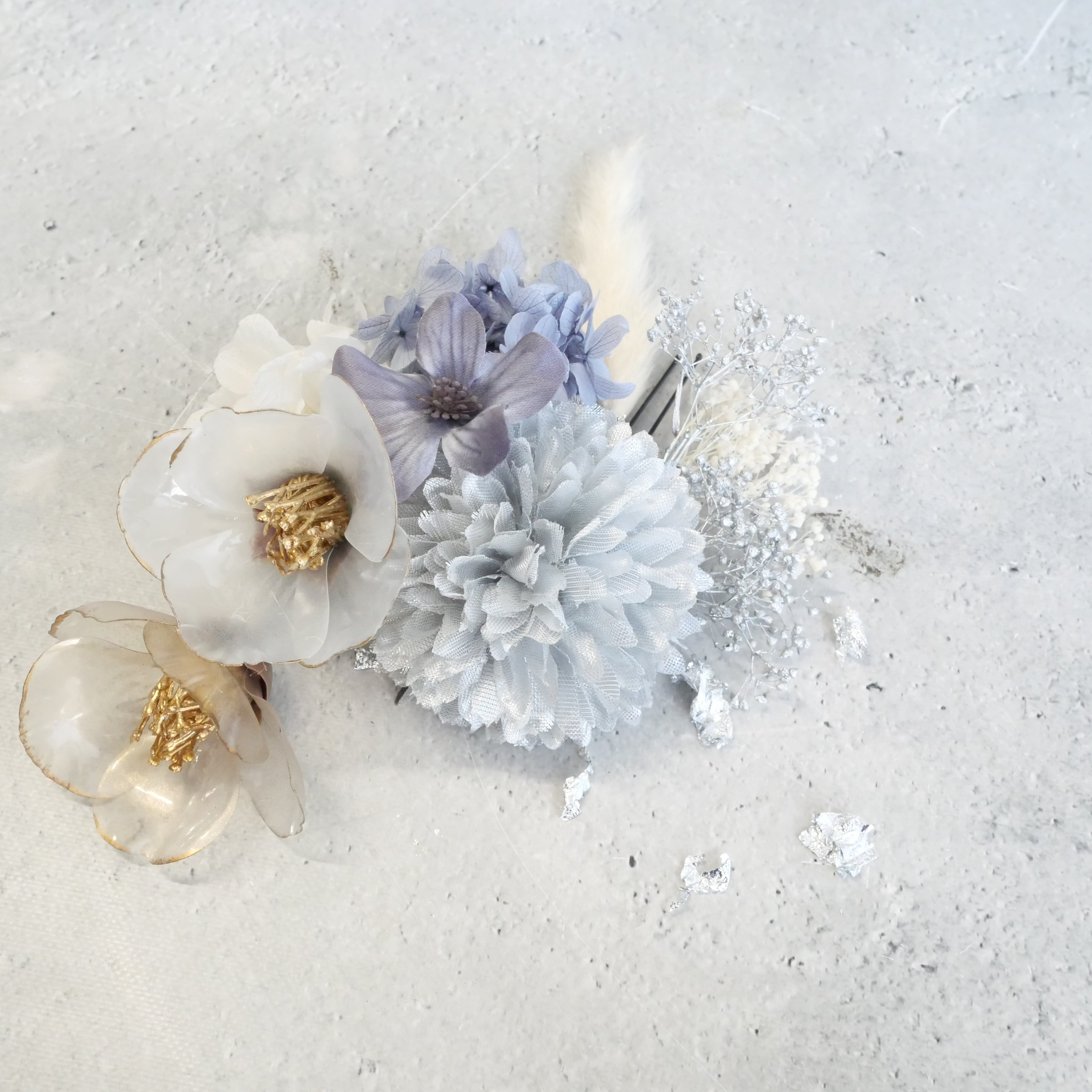 A155 ブルー クリア椿 ドライフラワー 髪飾り 成人式 卒業式 振袖 結婚式 袴