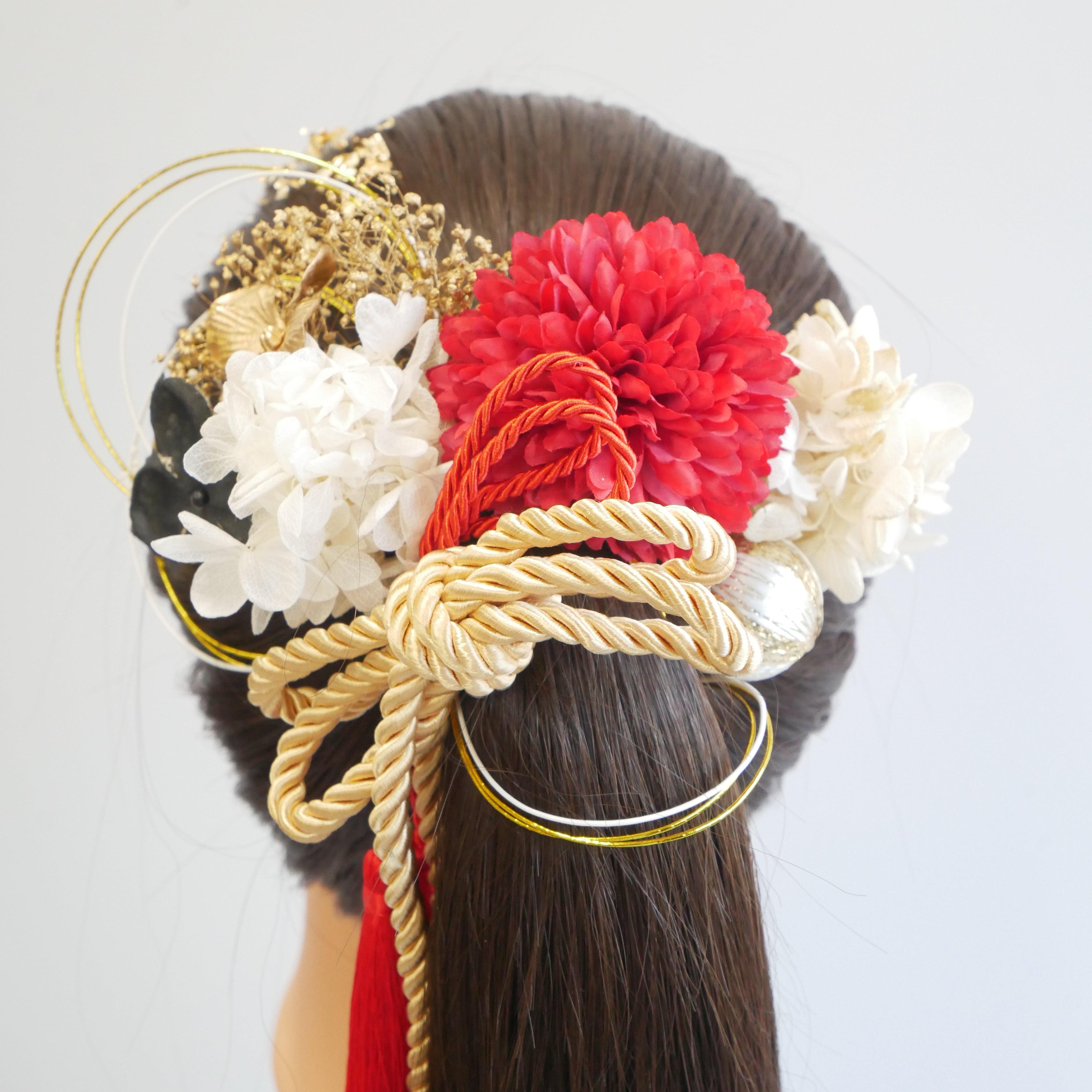 【ご専用 水引追加】F5 赤ゴールド タッセル 組紐 ドライフラワー ポニーテール 髪飾り 成人式 卒業式 振袖 結婚式 和装