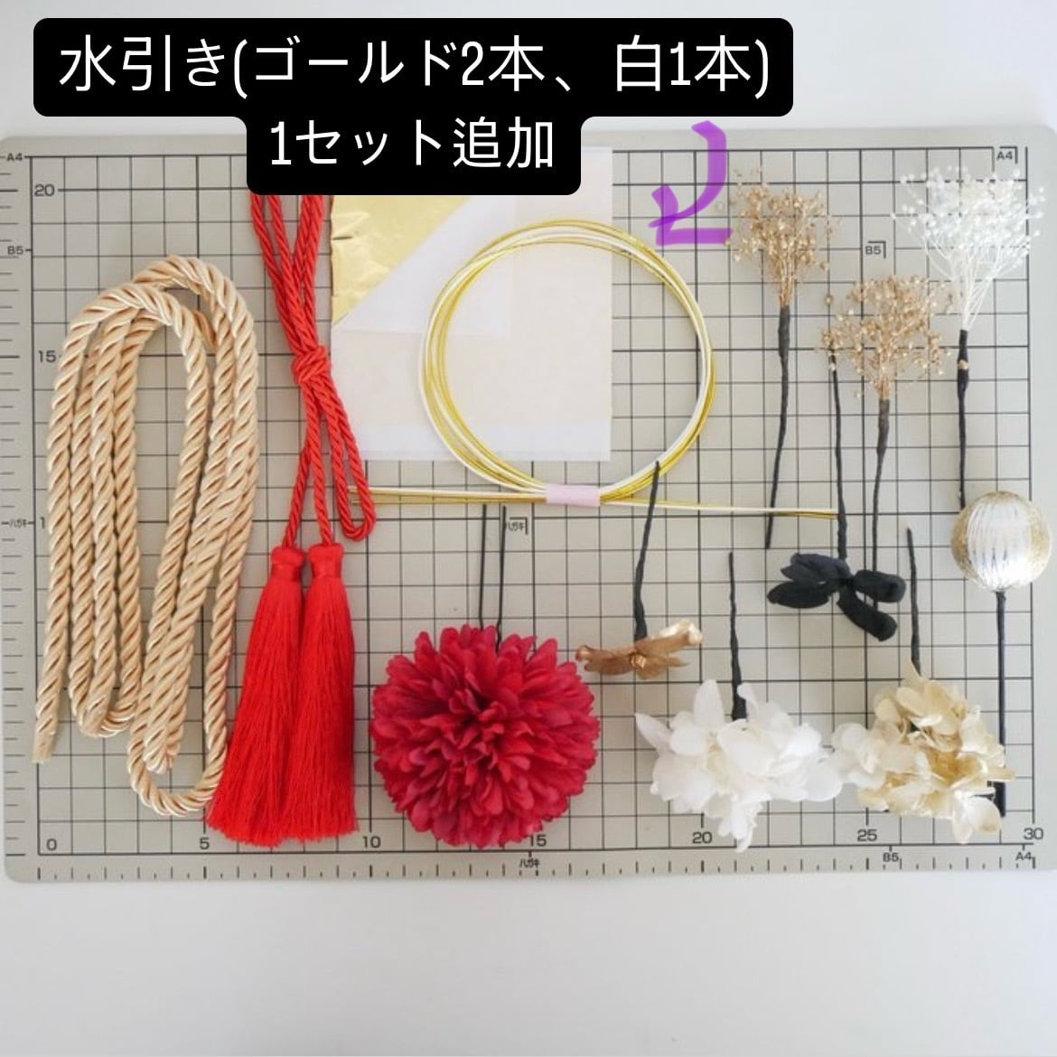大きめのタッセルが目を引くデザインで、ドライフラワーや造花、水引金箔もセットになっております。