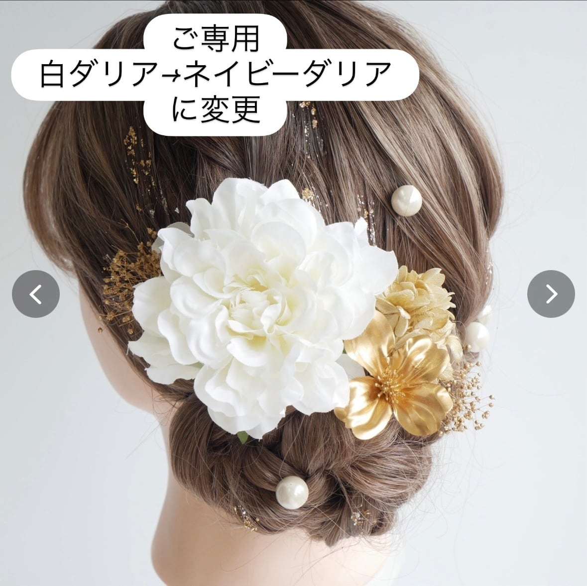 大きめのダリアとドライフラワー、流行りのパールを組み合わせた髪飾りです。