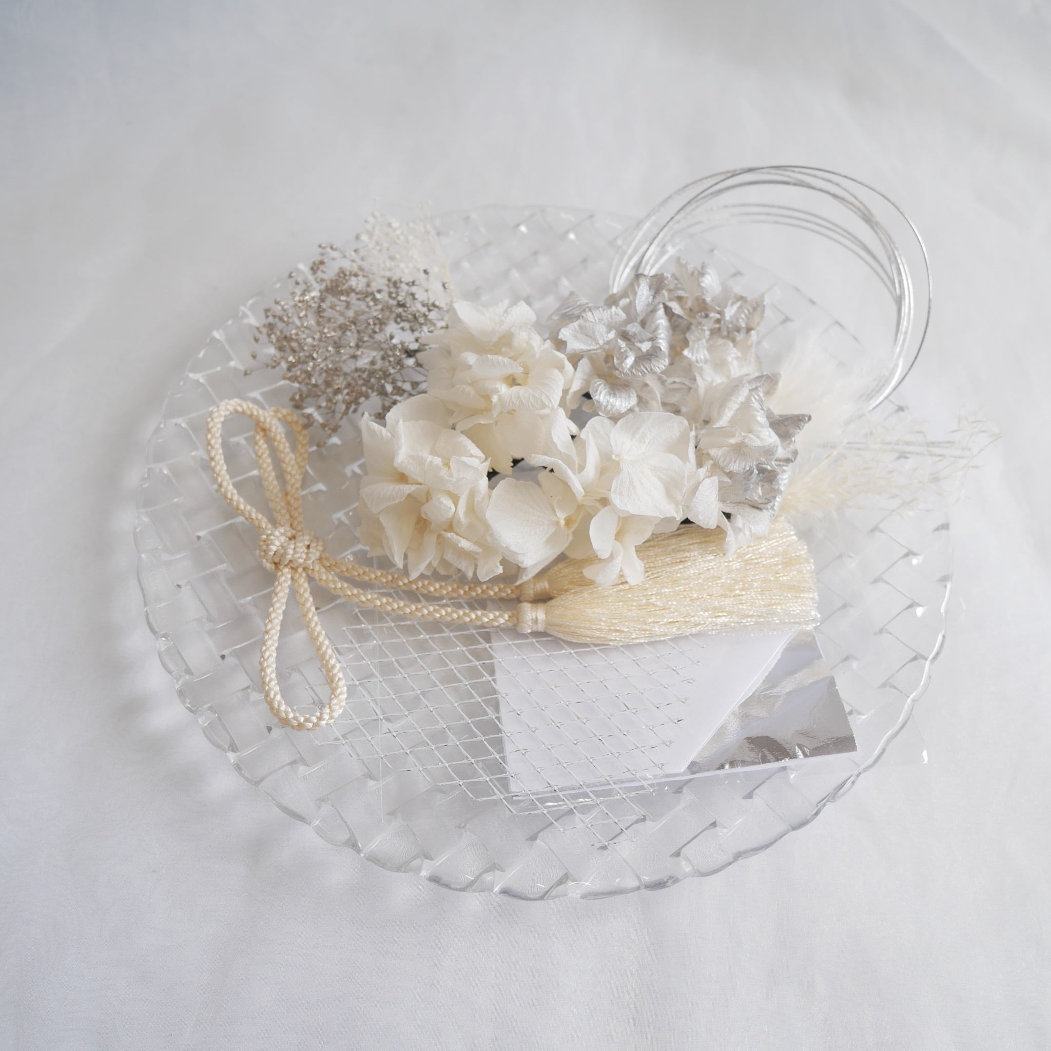 ドライフラワーと水引 シルバーメッシュ 白タッセルを組み合わせた華やかなセットです。