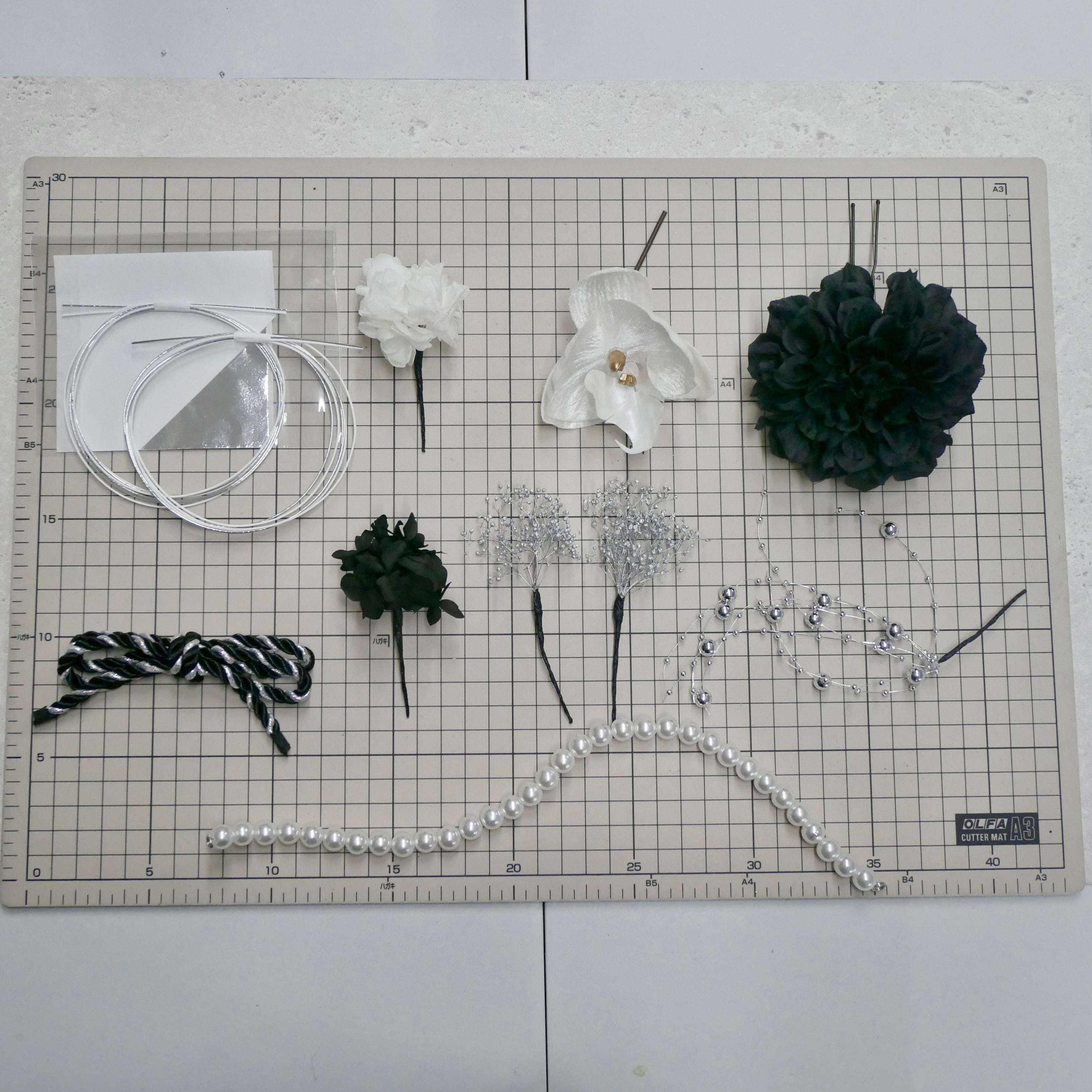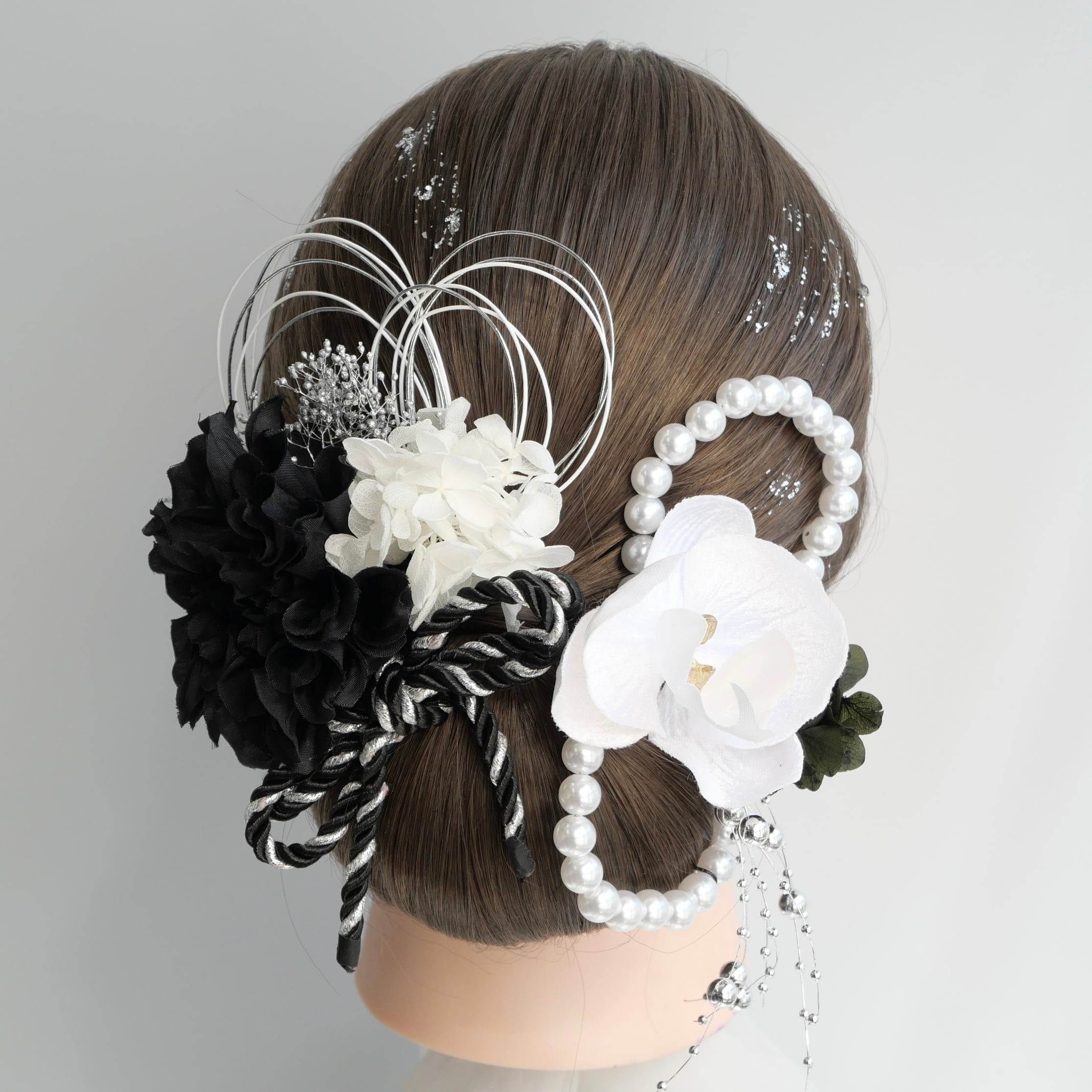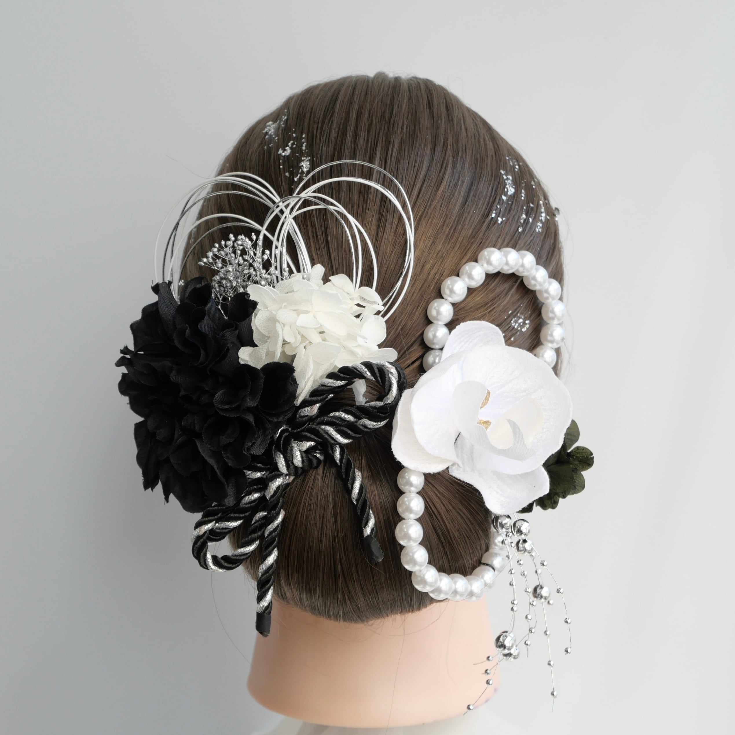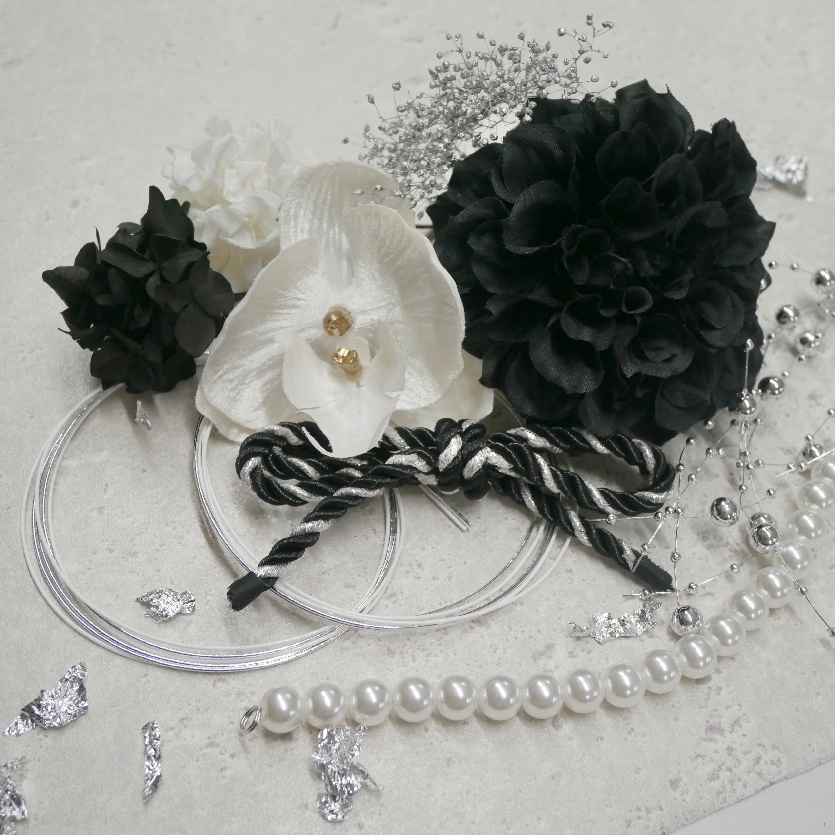 黒×白シルバーでクールでもあり可愛いらしい雰囲気の髪飾りです。