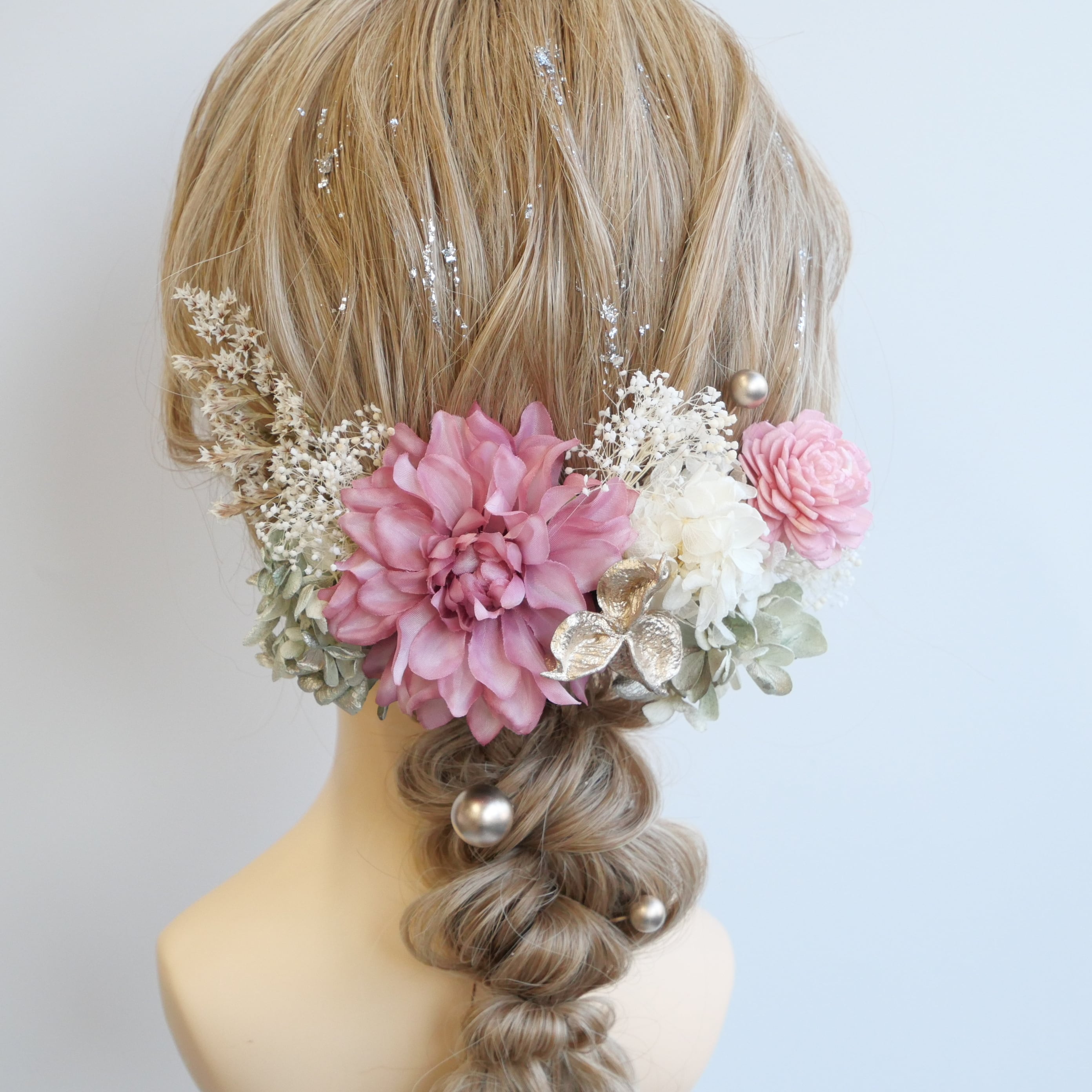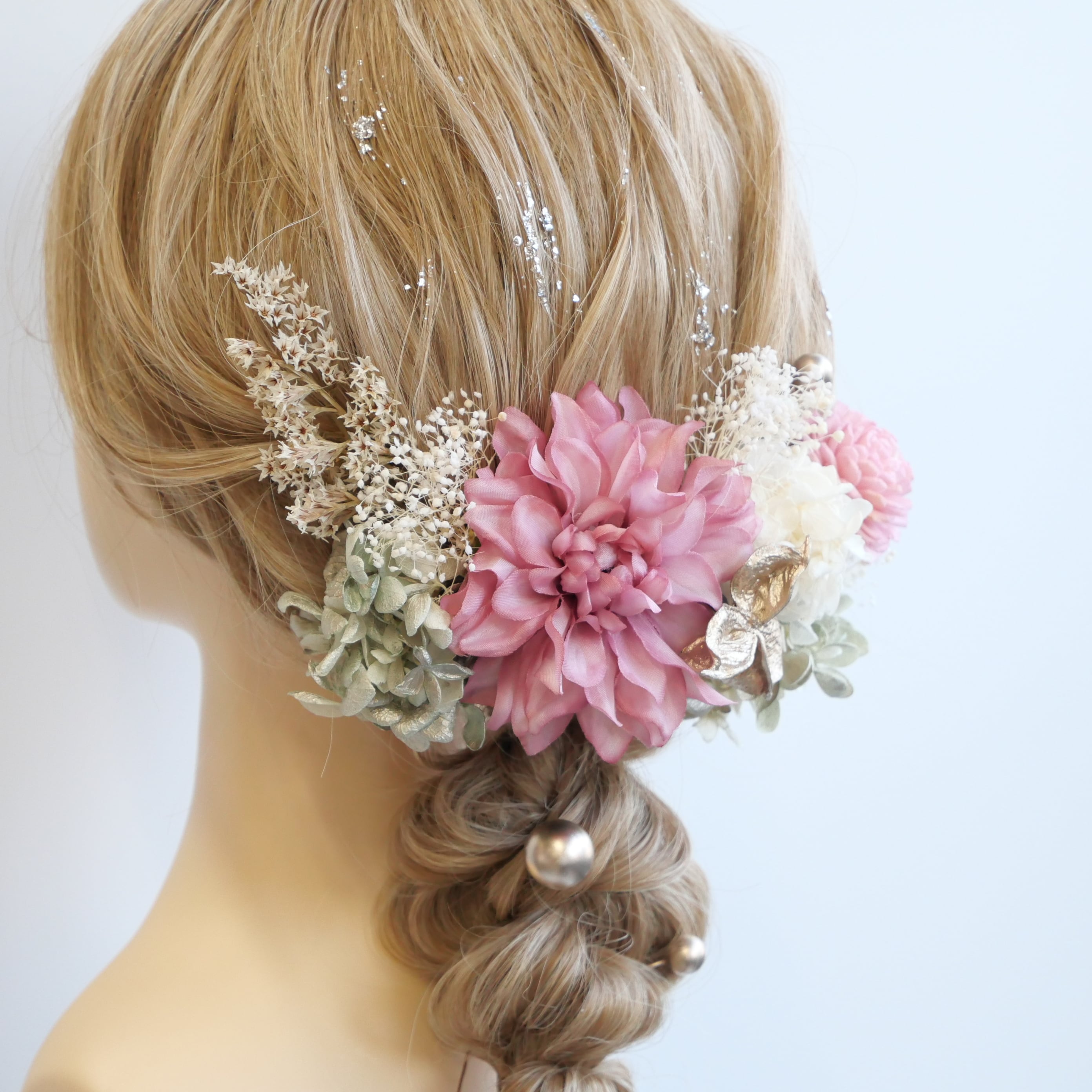 ダリアとドライフラワーを組み合わせた華やかで可愛いらしい雰囲気の髪飾りです。