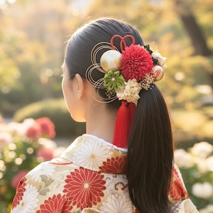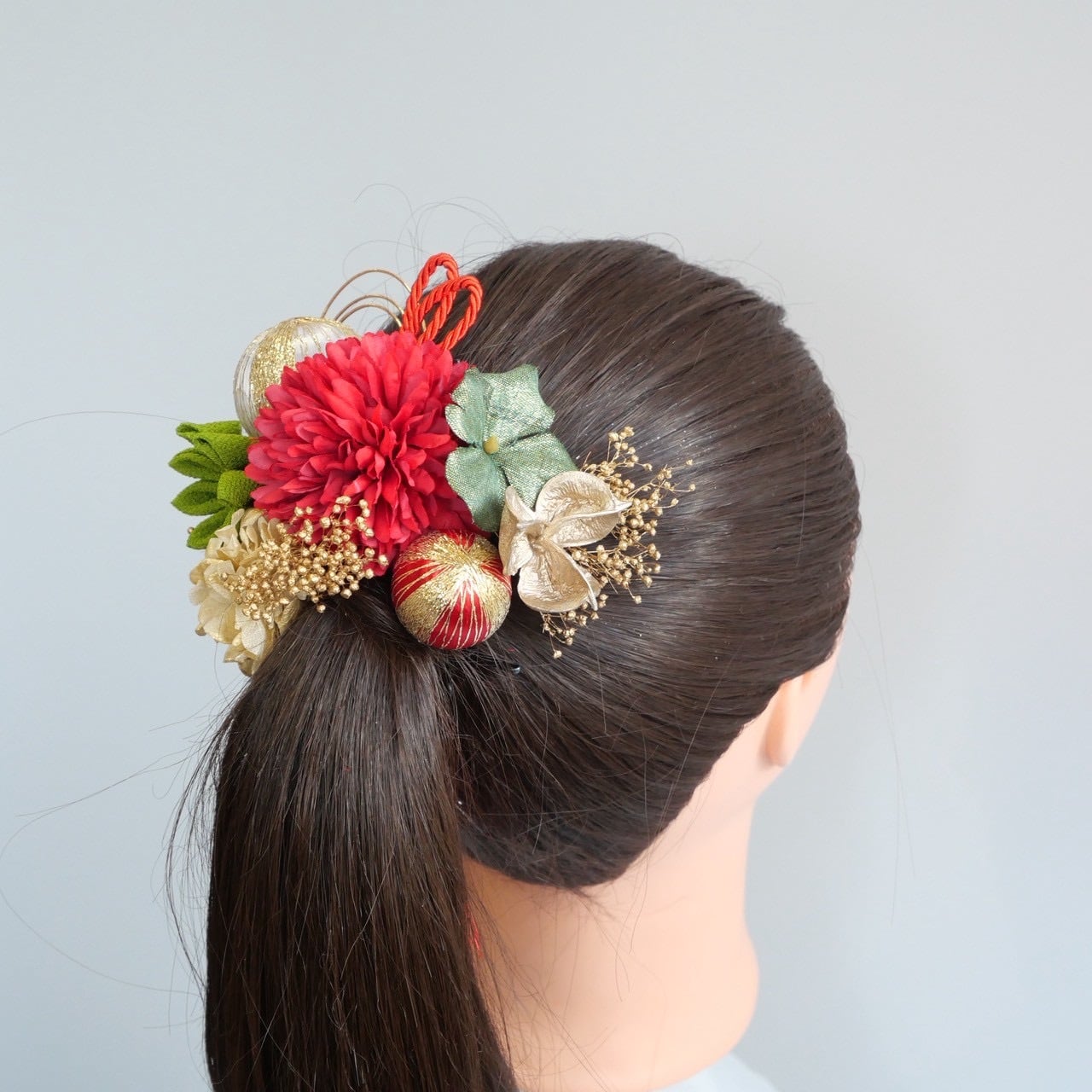 存在感のある赤マムを中心に、水引やゴールドパーツを散りばめた和モダン髪飾りです。