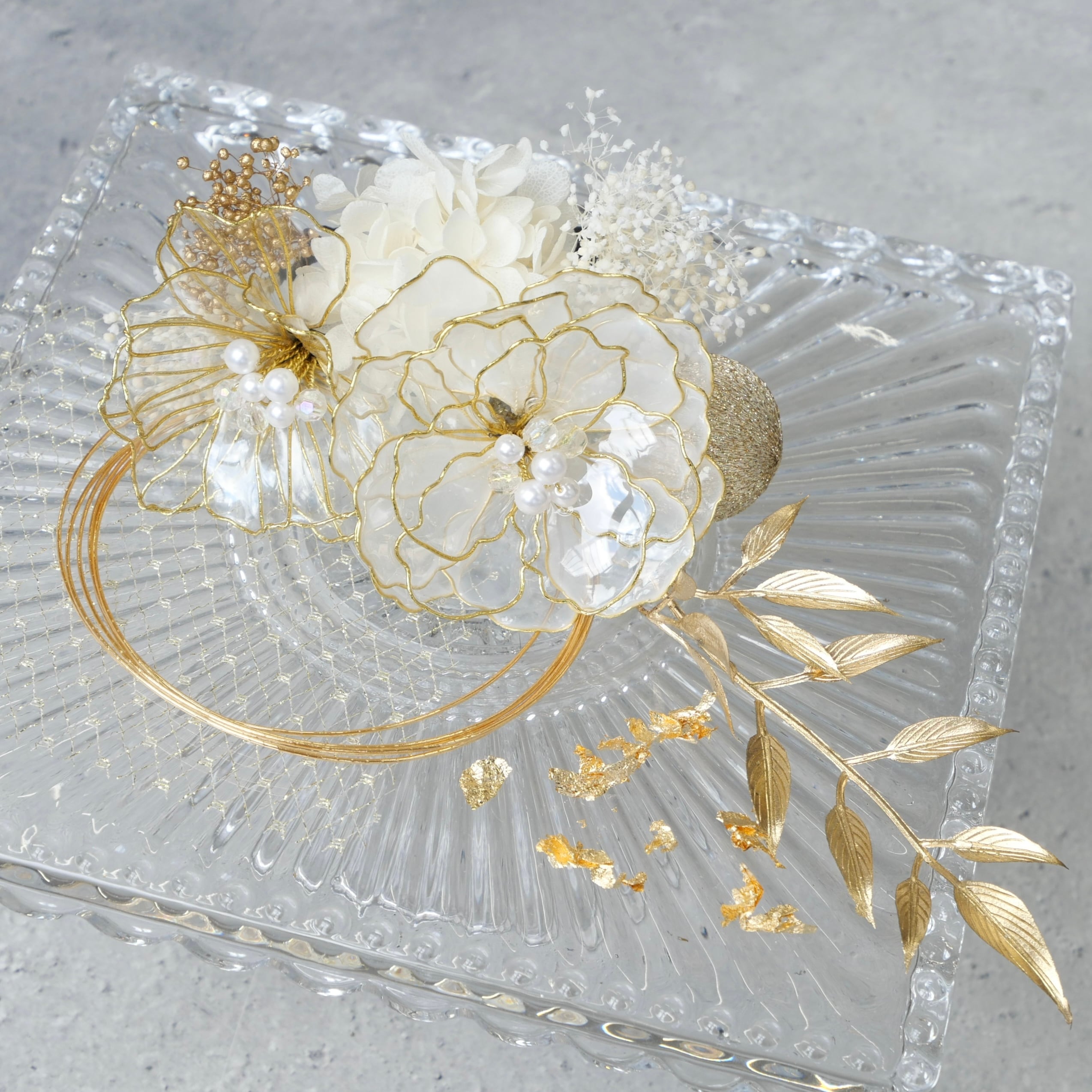 A010 アメリカンフラワー髪飾り ゴールド 卒業式 袴 成人式 振袖 結婚式 和装