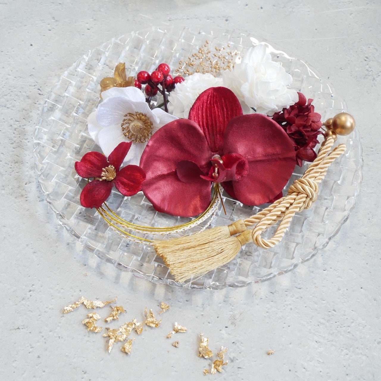 深紅の胡蝶蘭と、ふわりと重なる白花が印象的な和装ヘアアクセサリー。