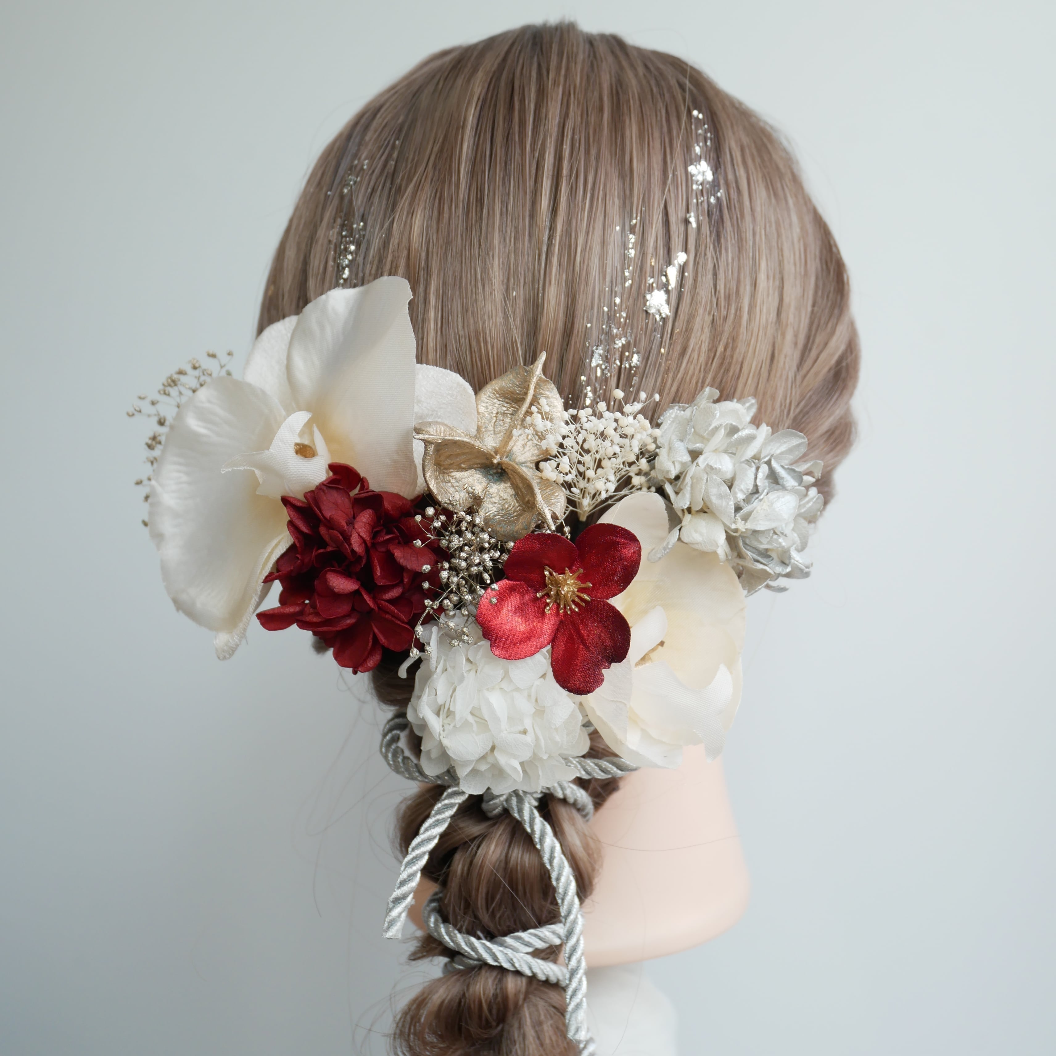 A502 ドライフラワー 髪飾り 白 赤 シルバー 卒業式 袴 成人式 振袖 結婚式 和装