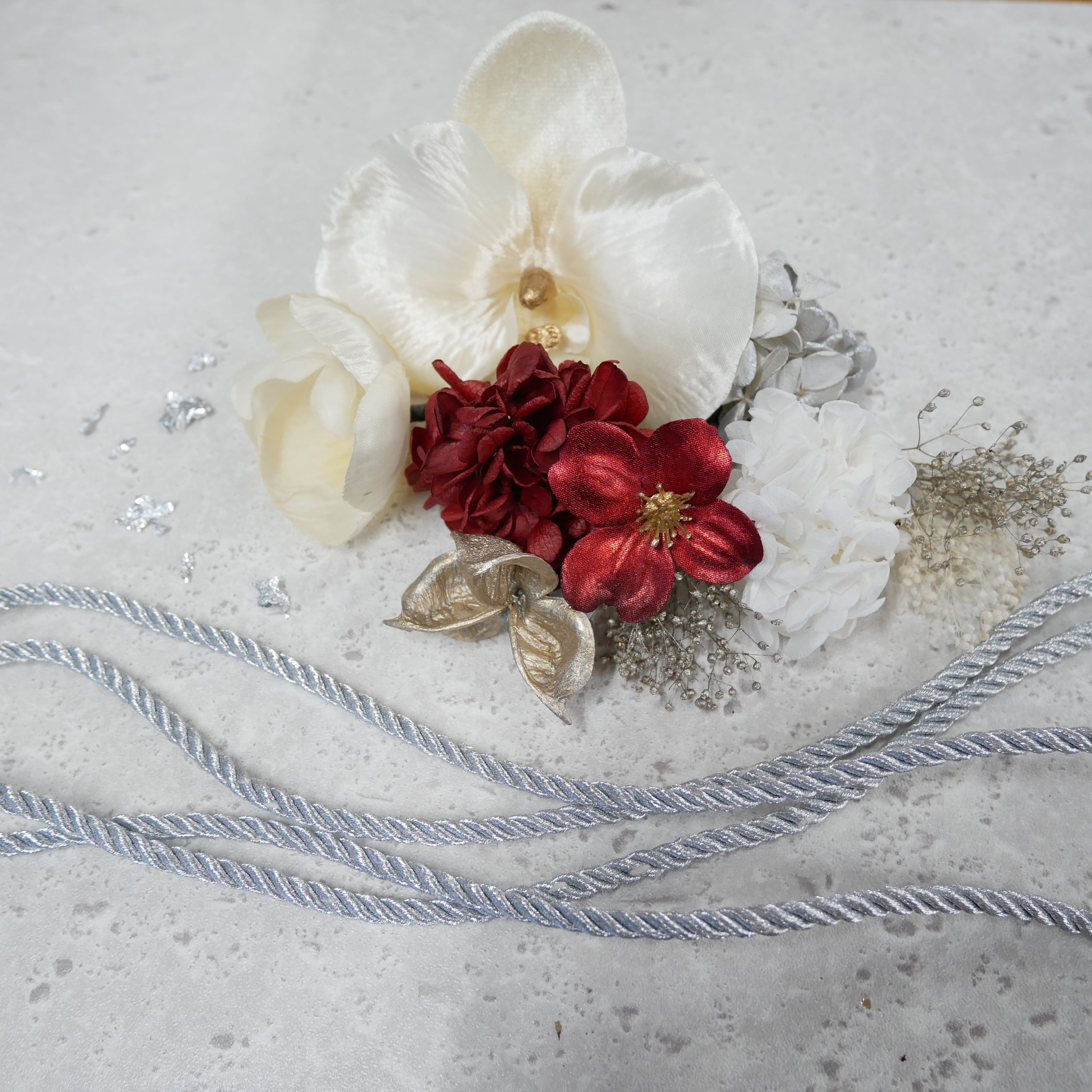 大ぶりのホワイトフラワーを中心に、華やかな赤花、ふんわりとしたホワイトの小花を組み合わせ、特別な日にふさわしい華やかさを演出します。