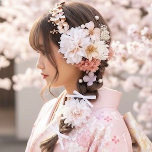 柔らかなピンクと白のお花をたっぷり使った、可愛らしさ溢れるガーリー系髪飾りセット。