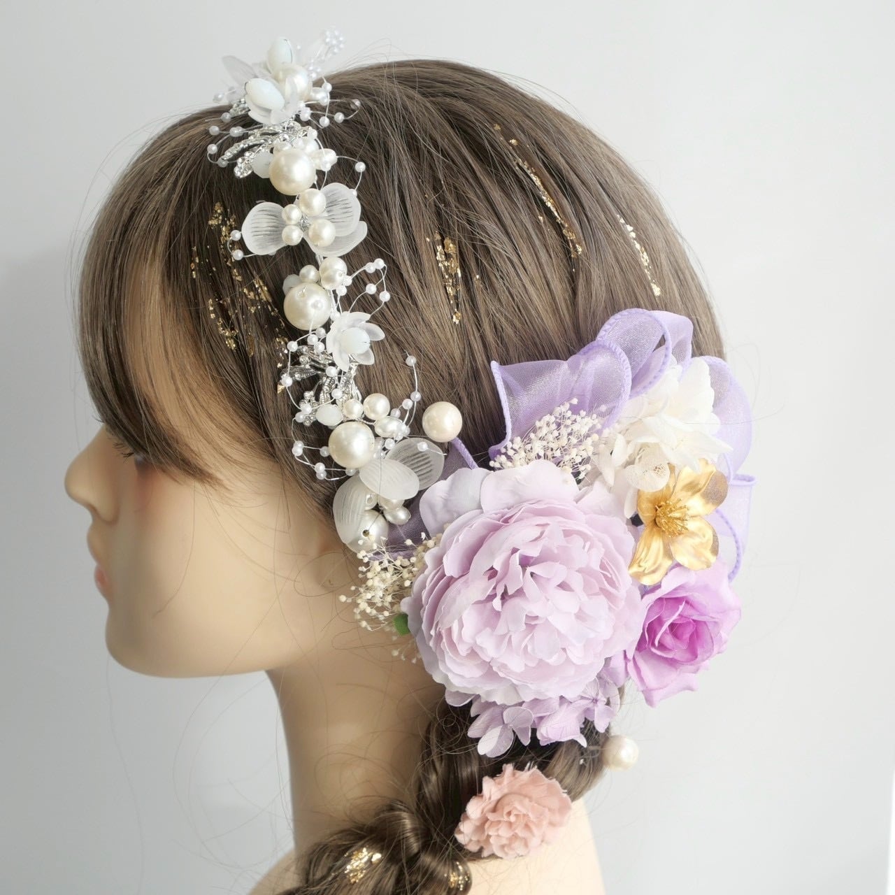 淡いラベンダーを中心に、柔らかな色合いのお花とパールカチューシャを組み合わせた、優しく華やかな髪飾りセットです。