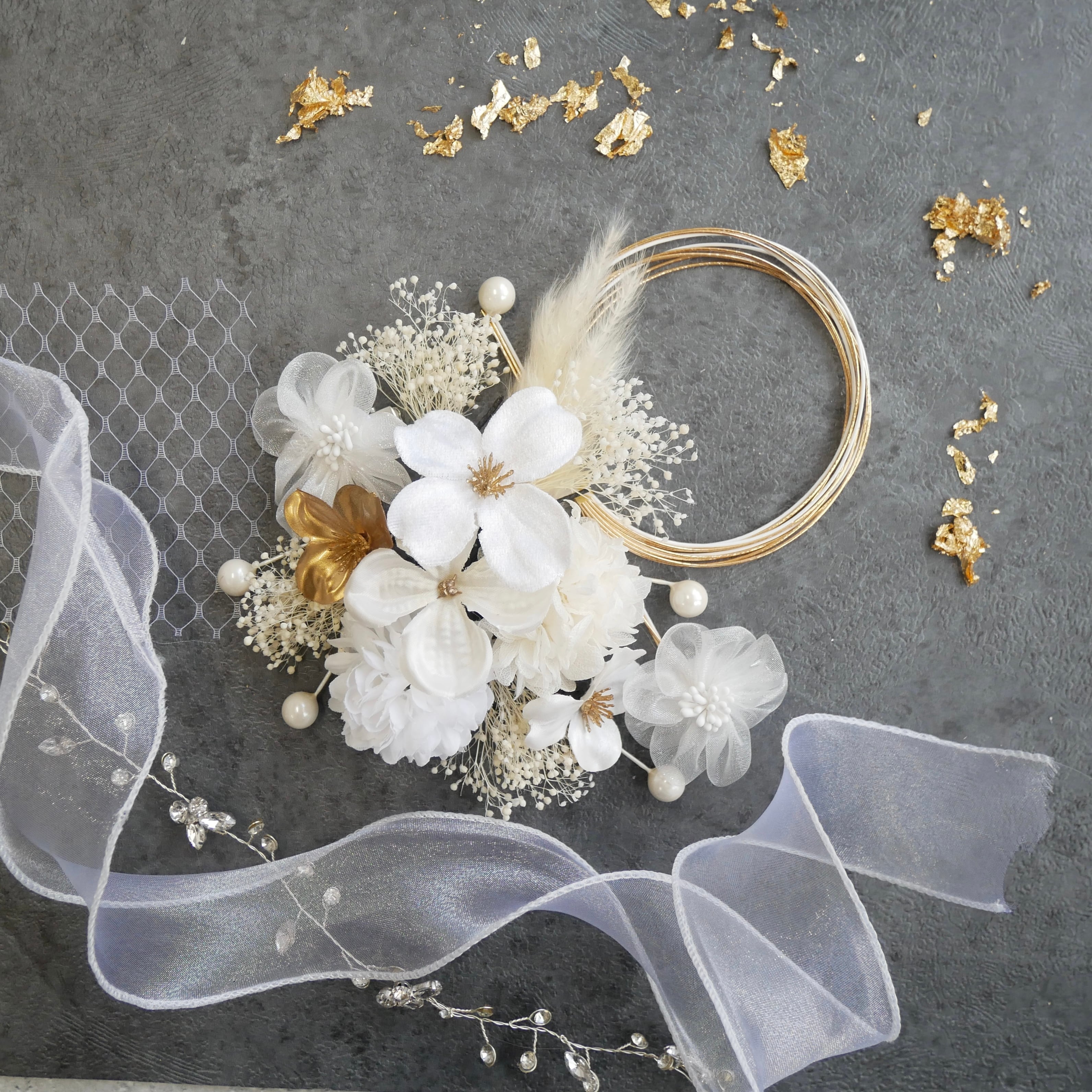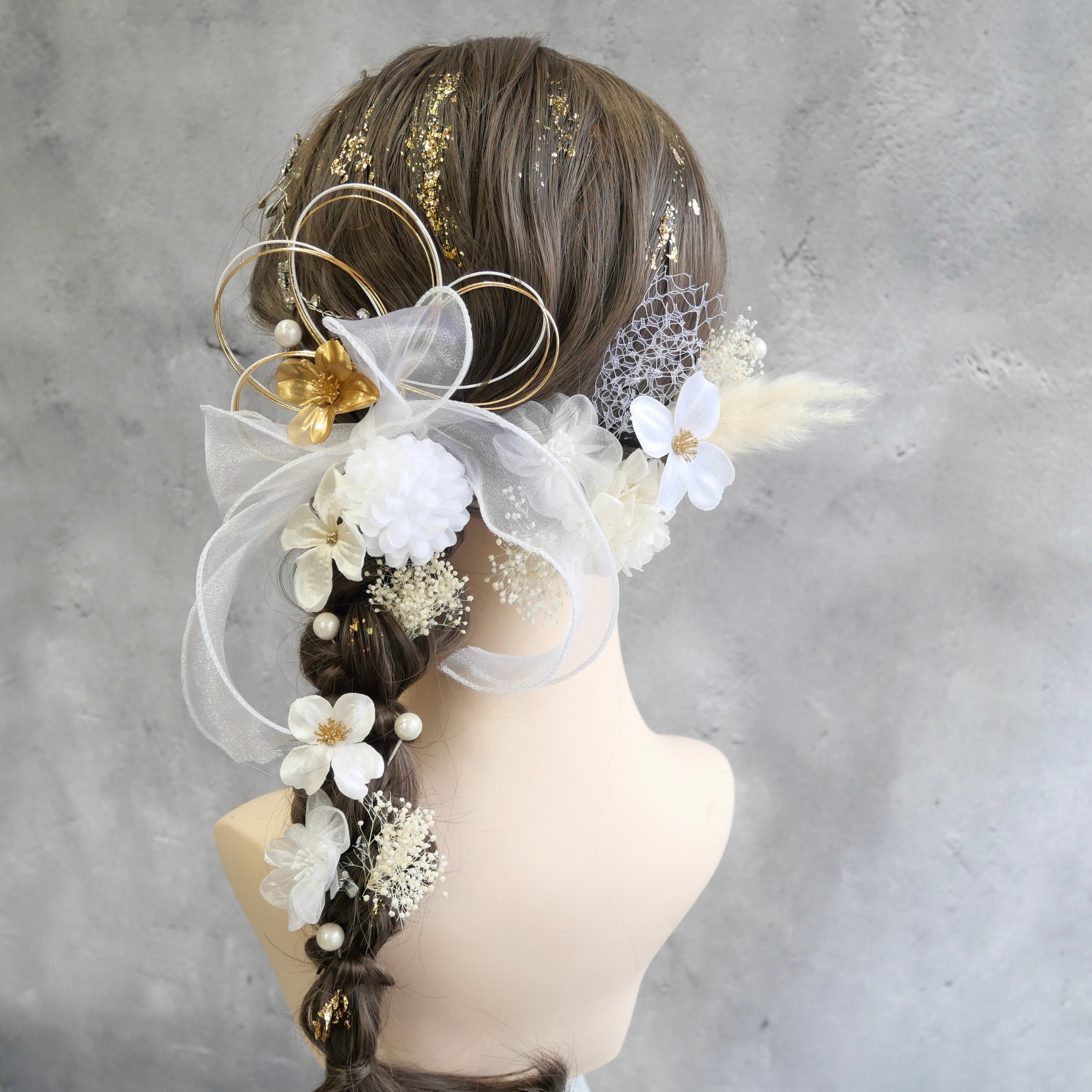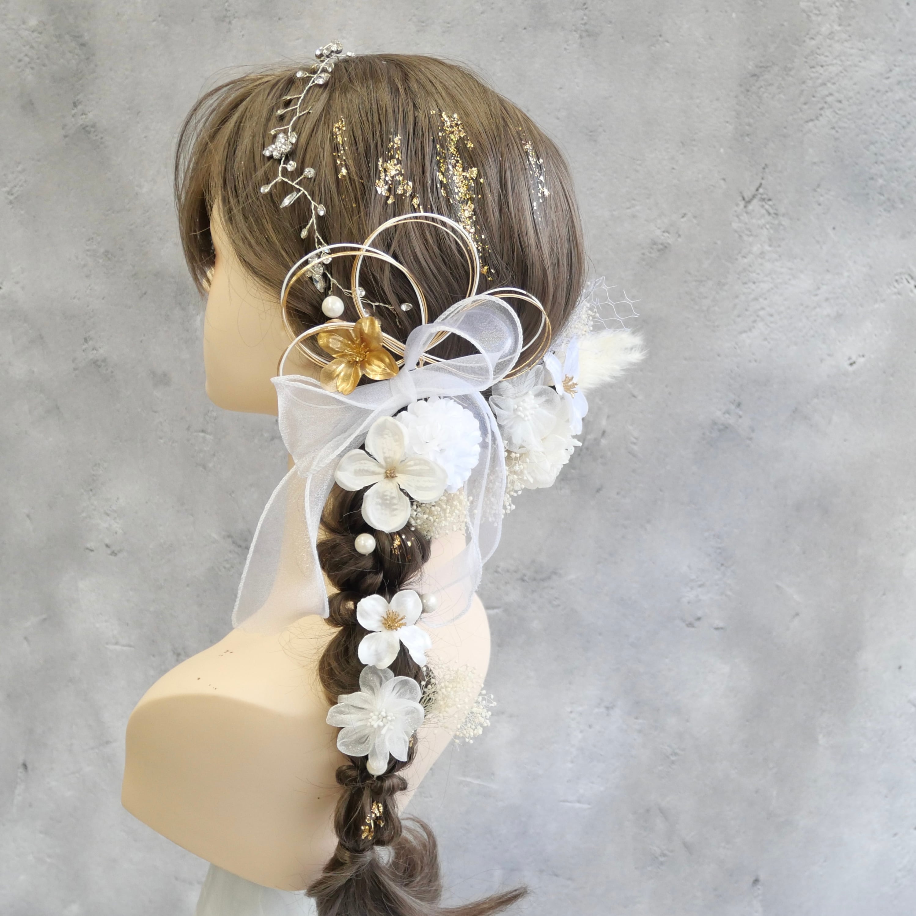 ホワイトを基調に、ゴールドのアクセントを効かせた上品な髪飾りセットです。