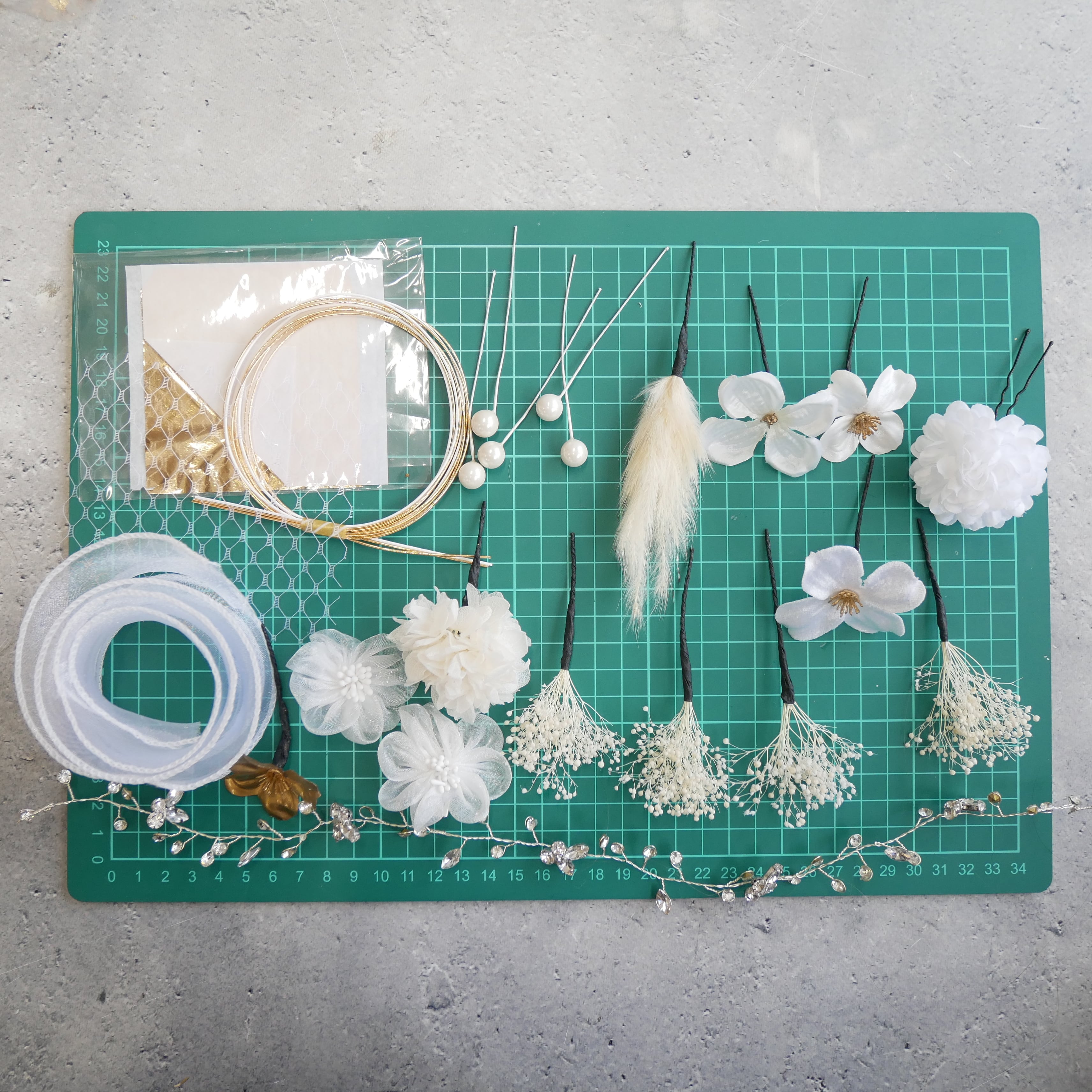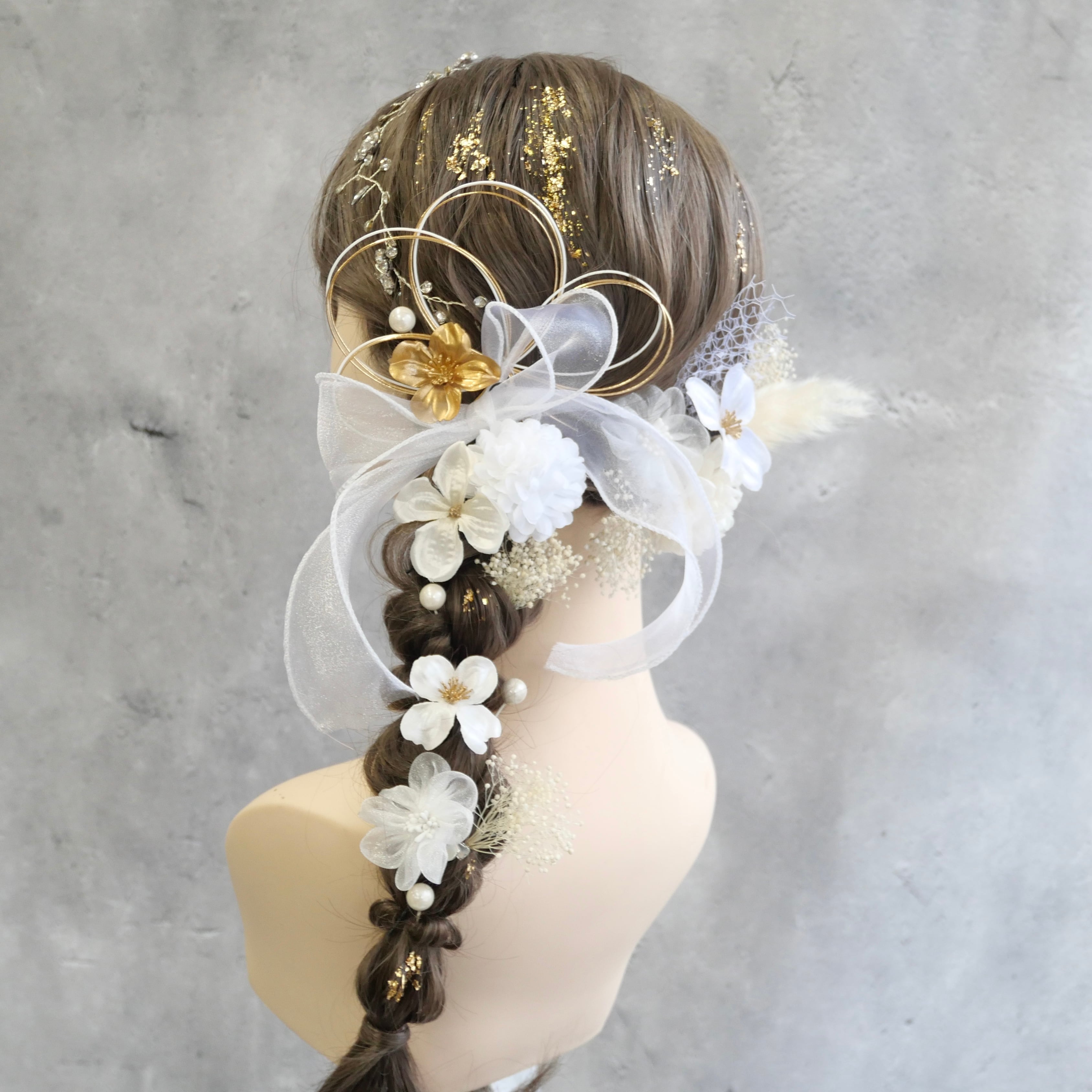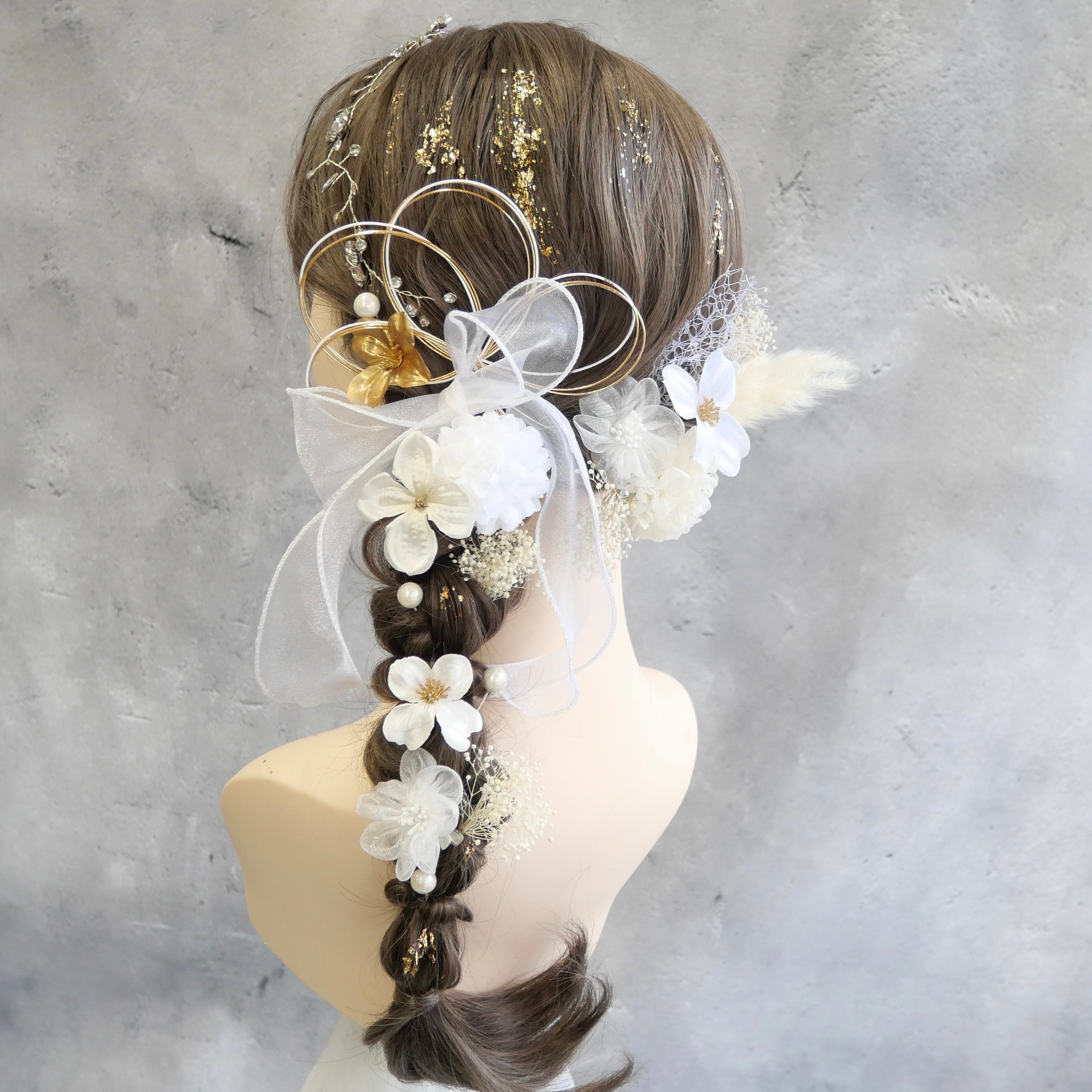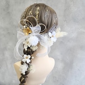 ホワイトを基調に、ゴールドのアクセントを効かせた上品な髪飾りセットです。