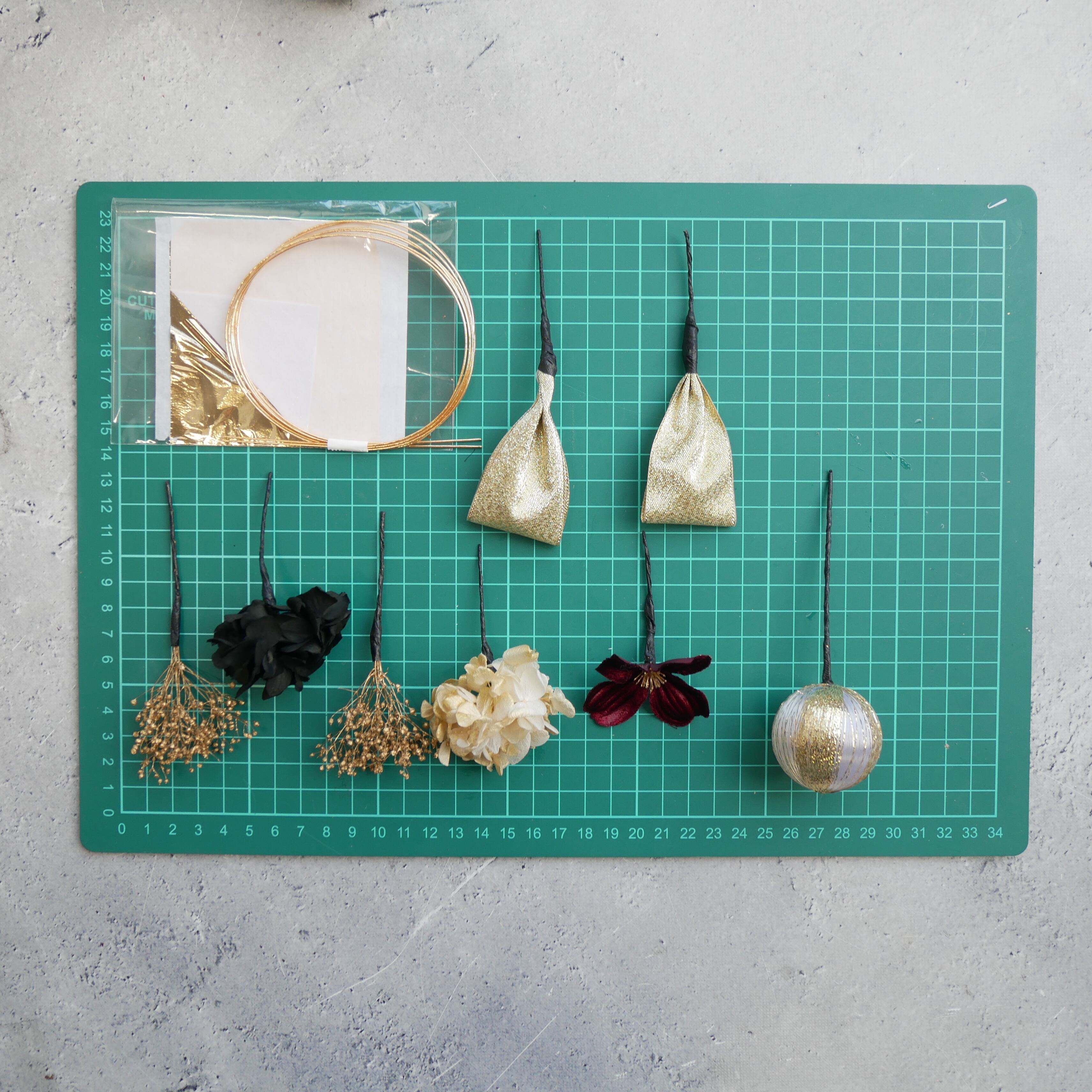 落ち着いたボルドーのお花をポイントに、黒ゴールドでまとめた髪飾りセットです。