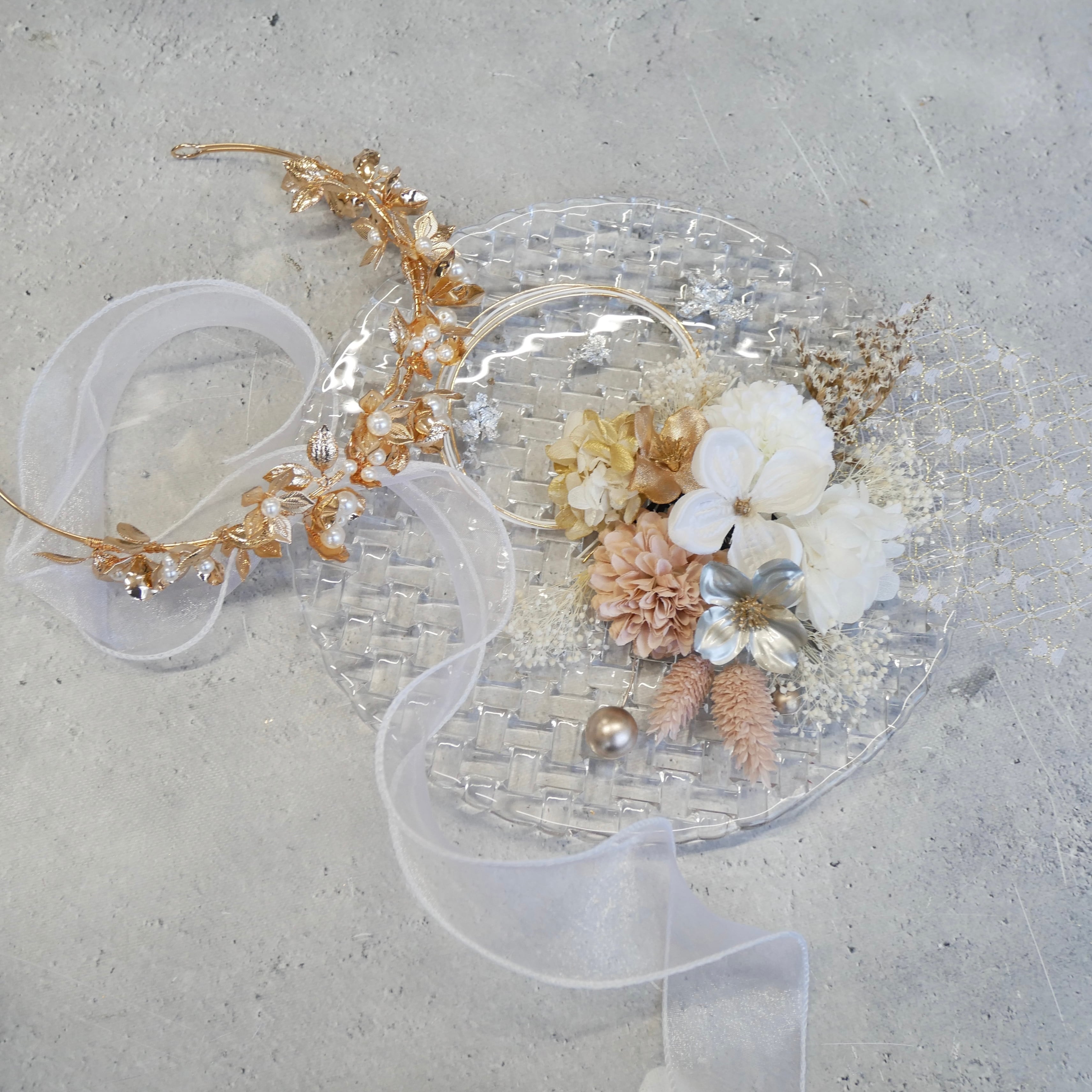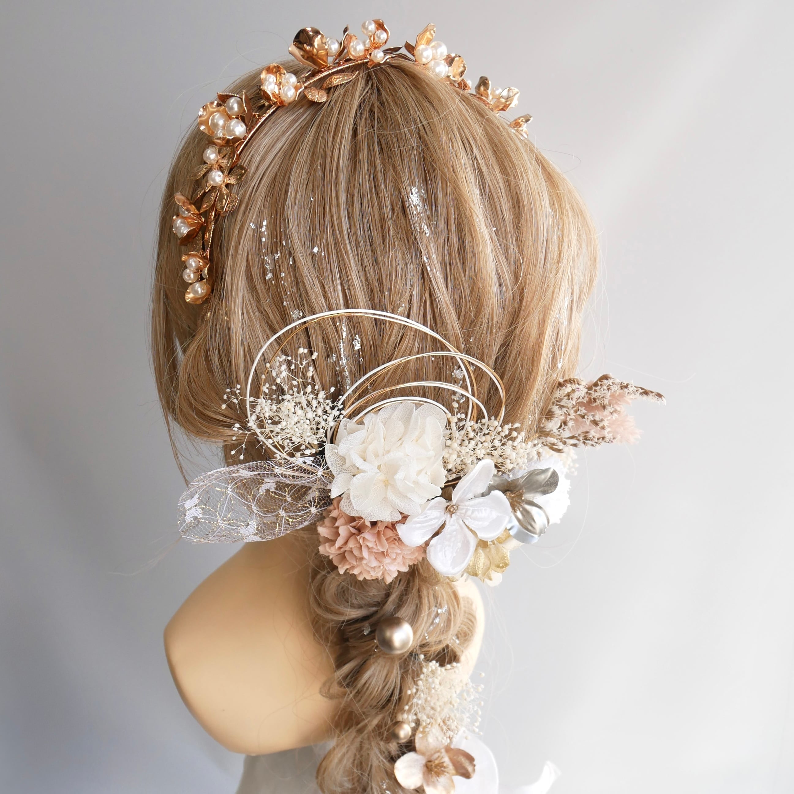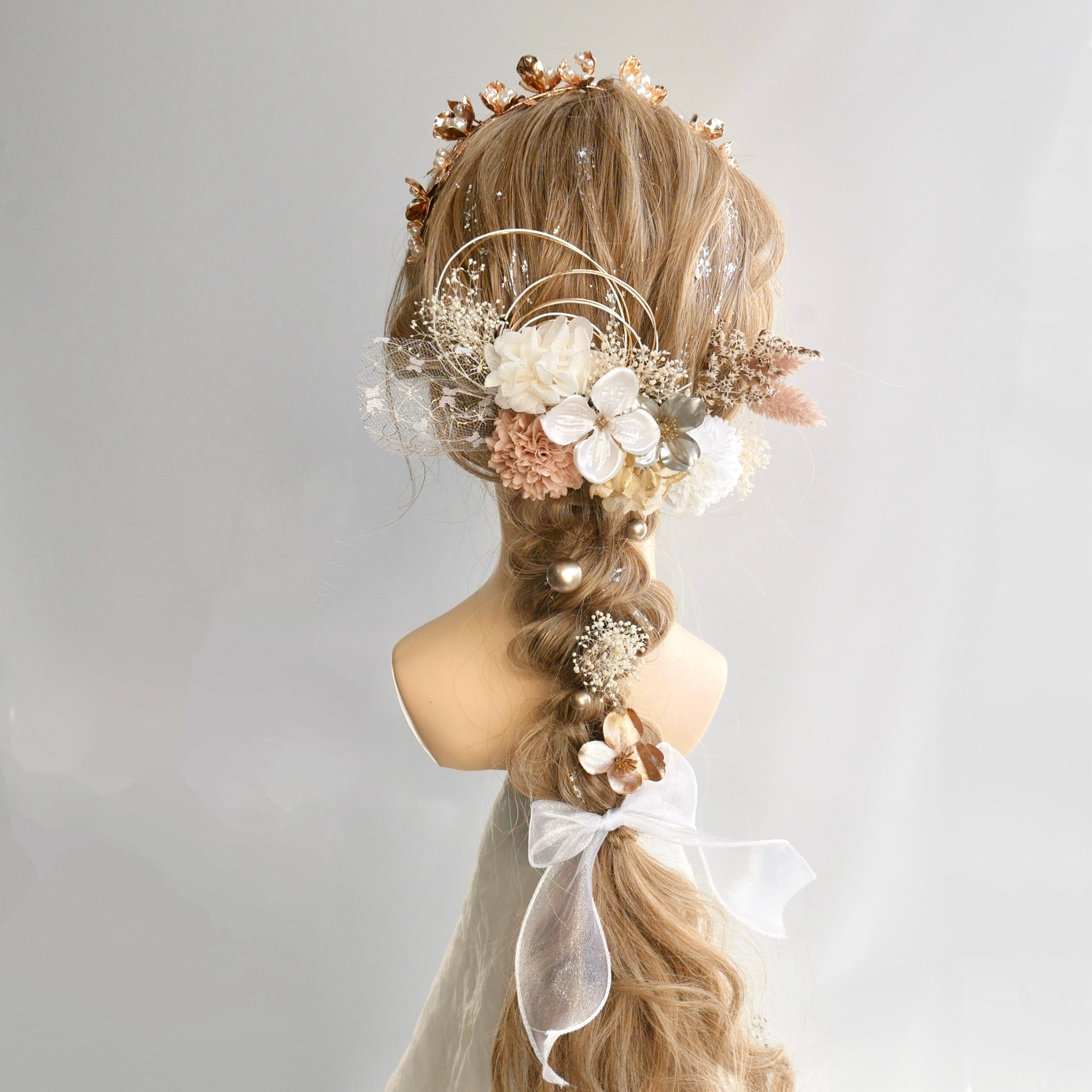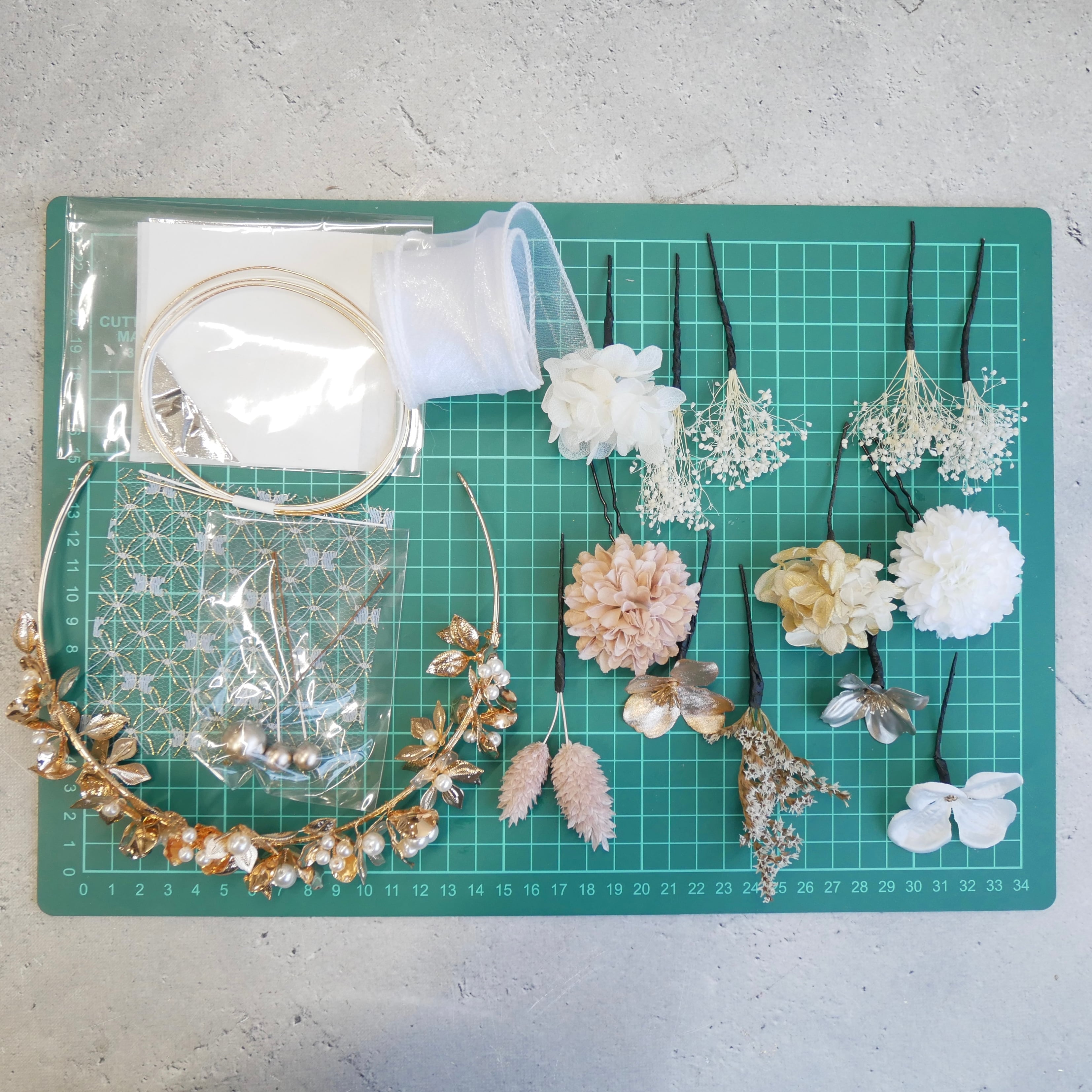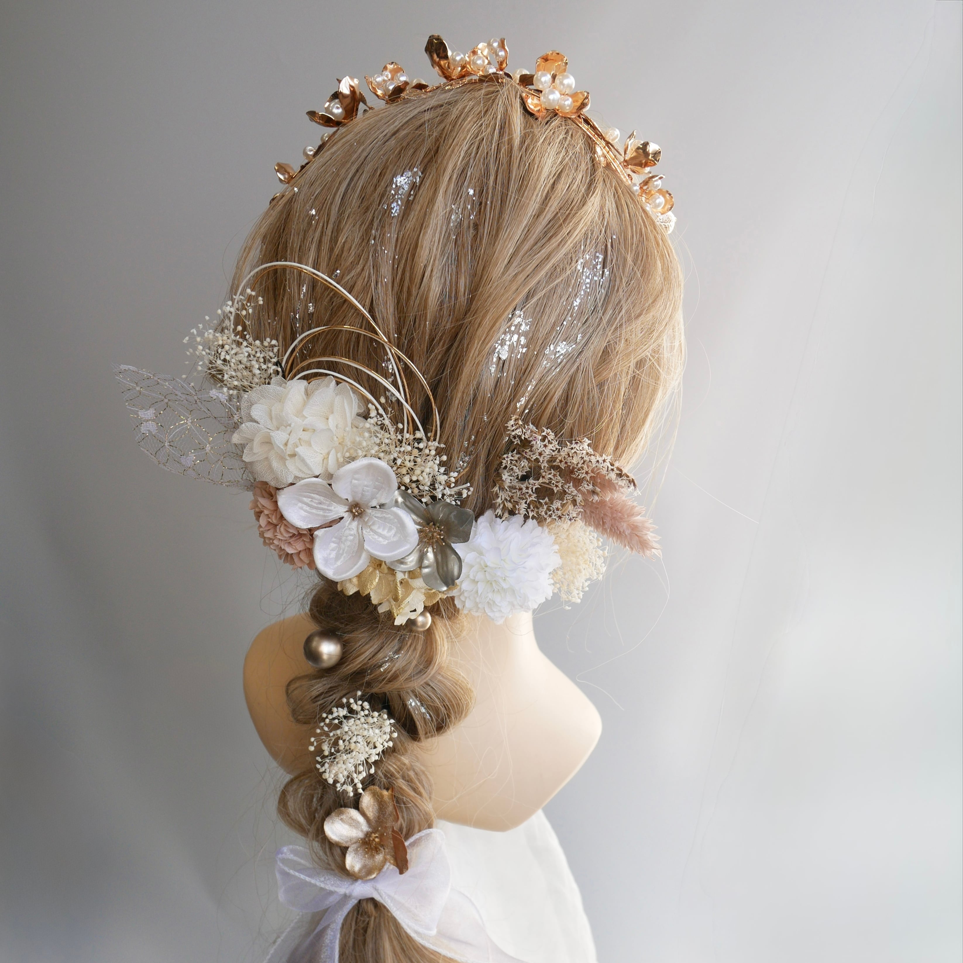 ホワイトやベージュのお花をたっぷり使い、ゴールドとシルバーのきらめきを重ねた華やかな髪飾りセットです。