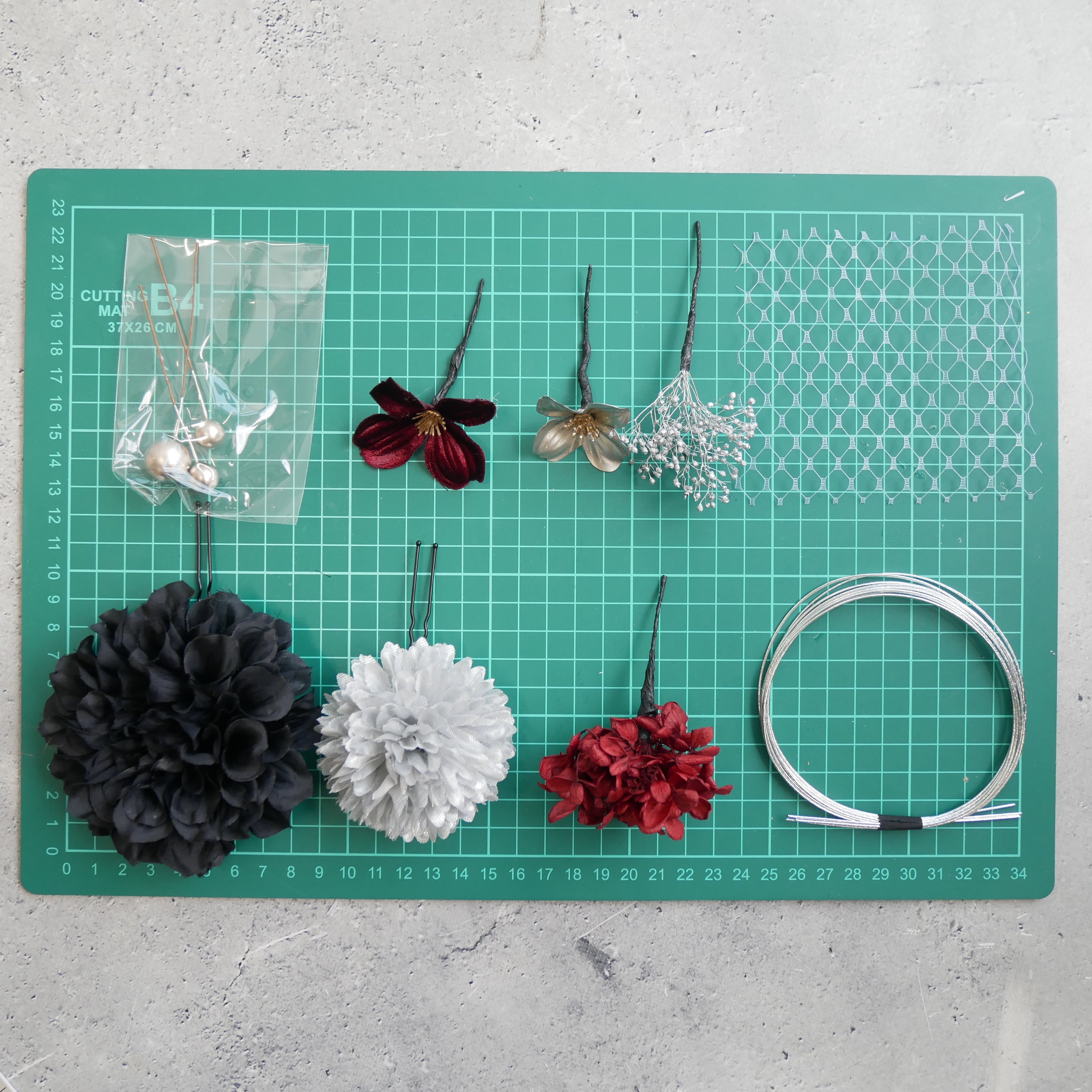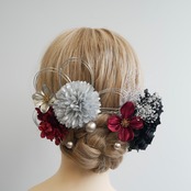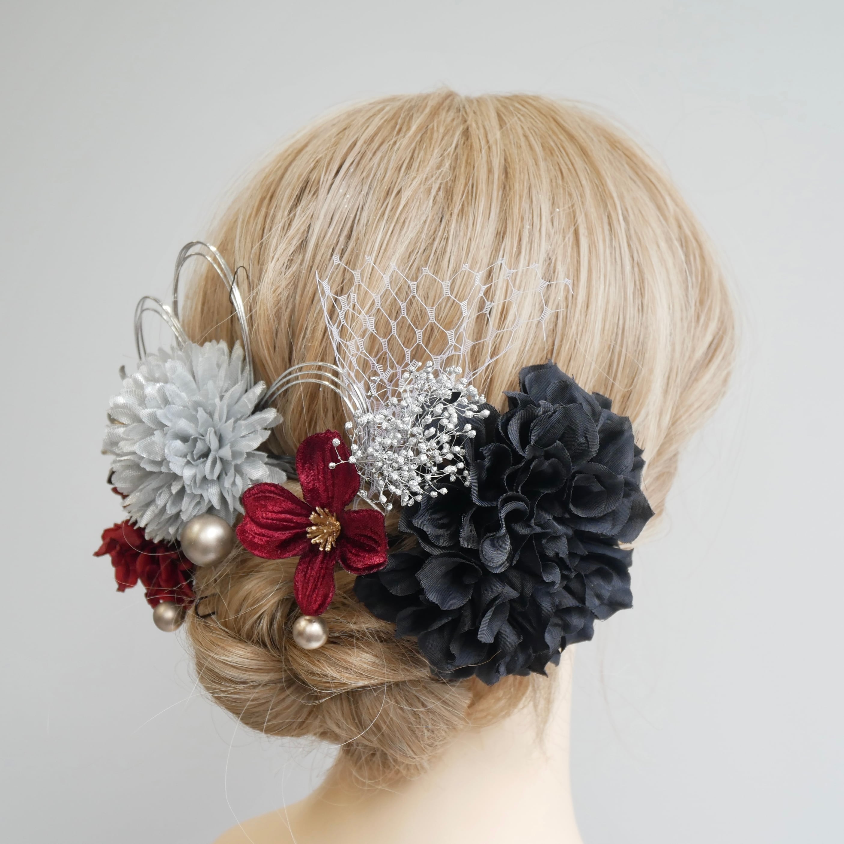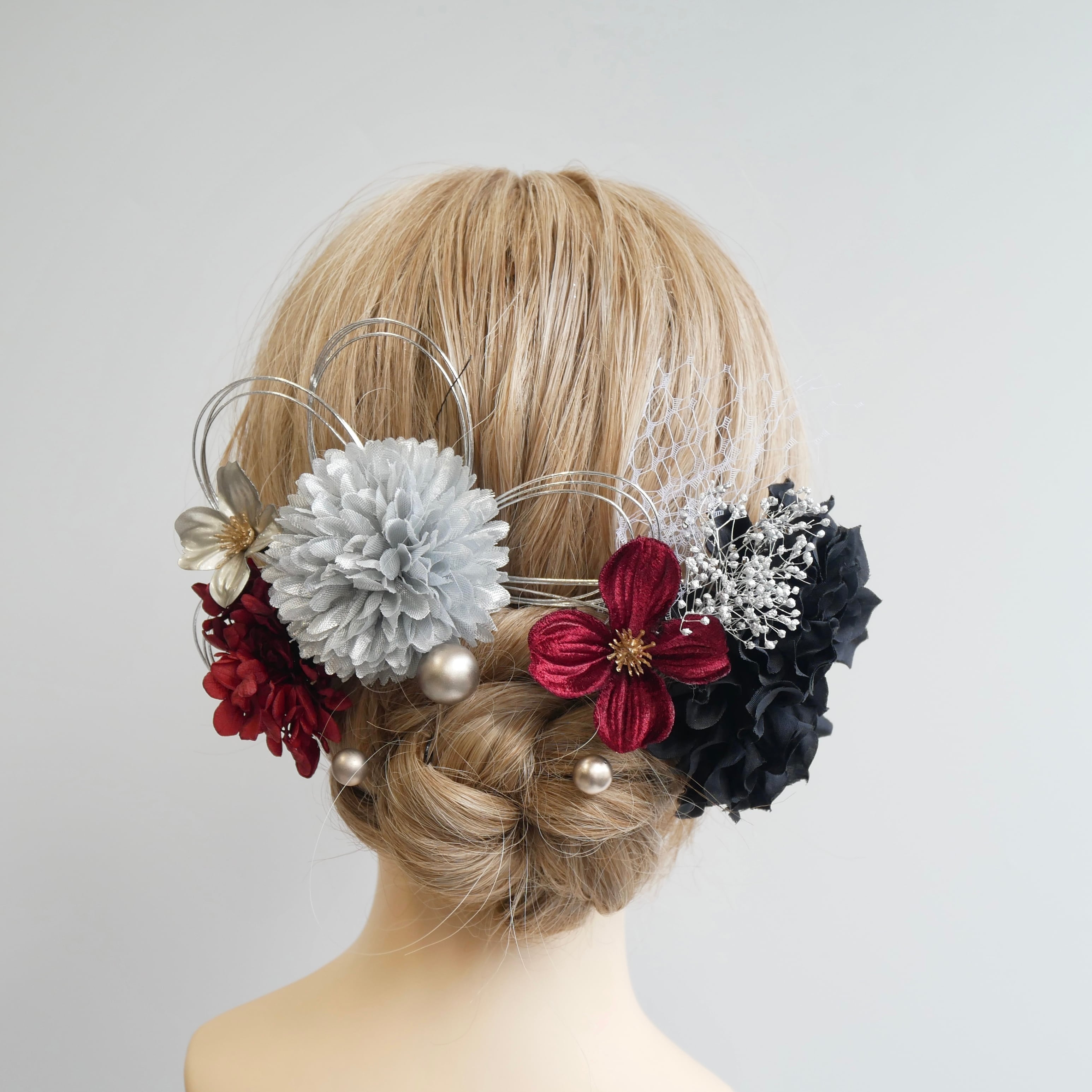 シルバーをベースに、ボルドーやブラックを組み合わせた存在感のある髪飾りセットです。
