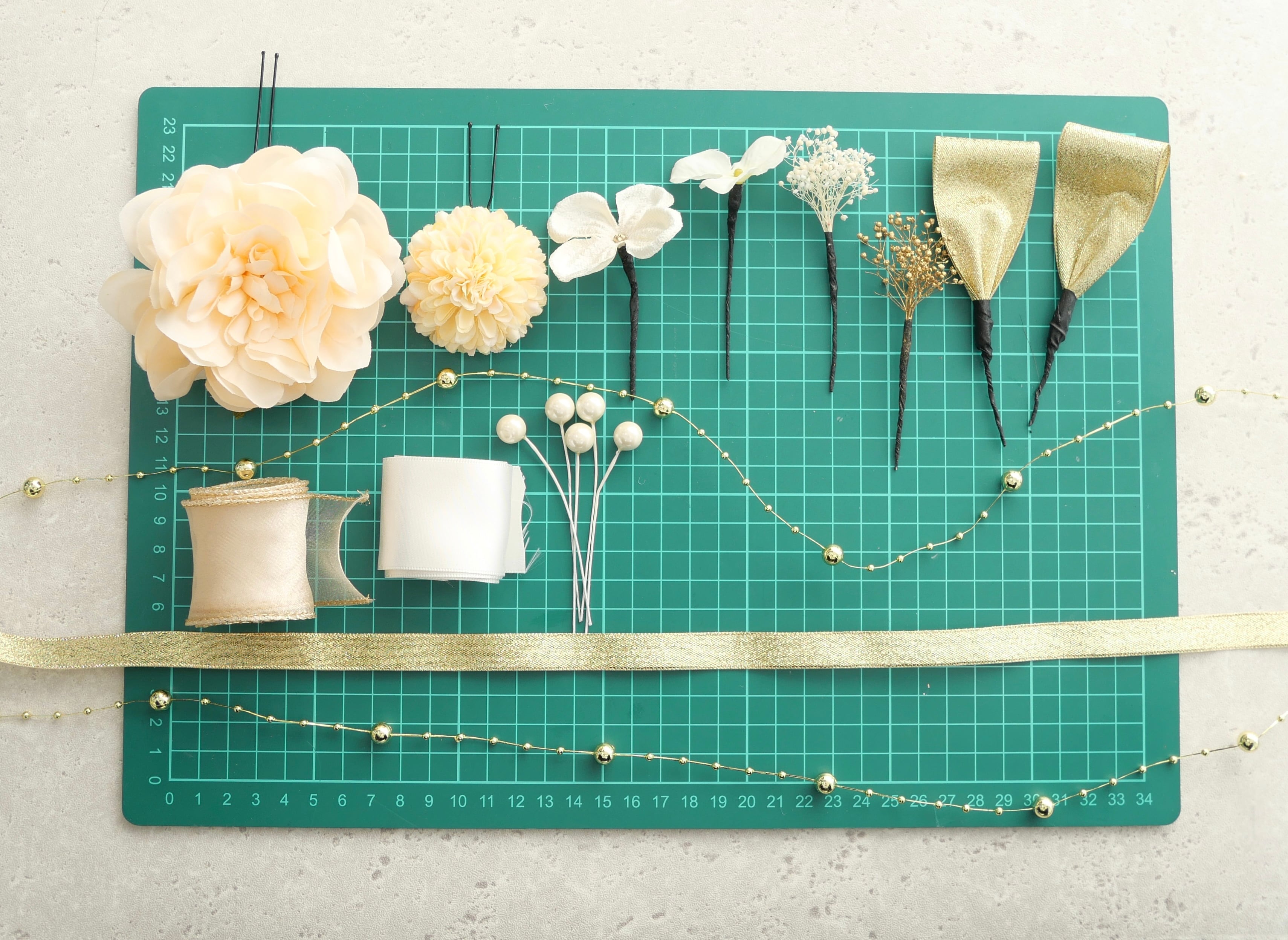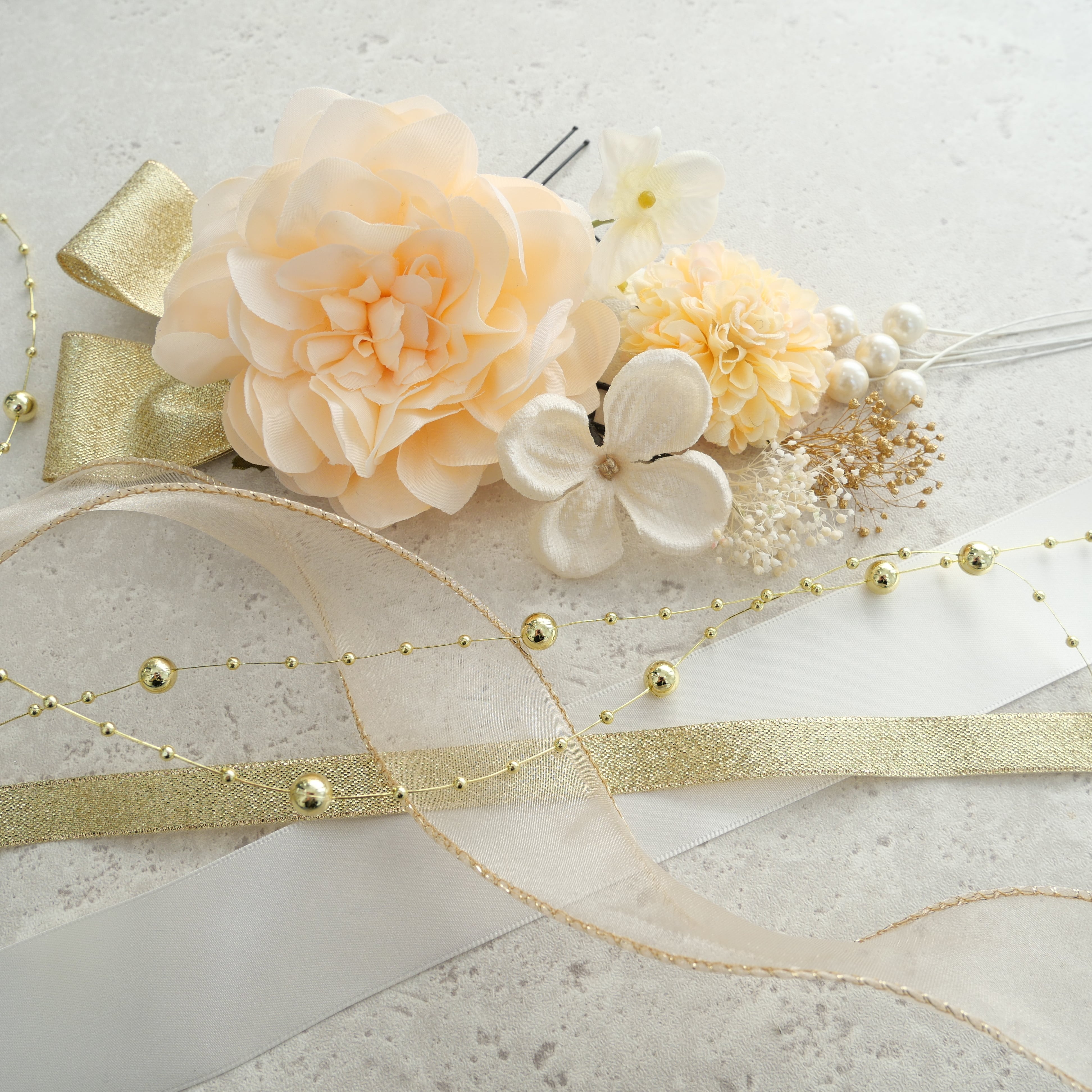 ダリアと上品なゴールドを組み合わせた、特別感あふれる髪飾りセットです。