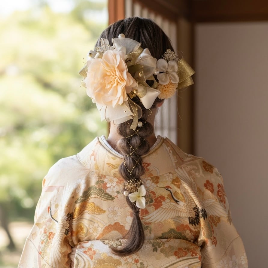 編み下ろしとの相性が抜群で、パールシャワーを編み込みに沿わせることで、一気に写真映えするスタイルに仕上がります。