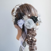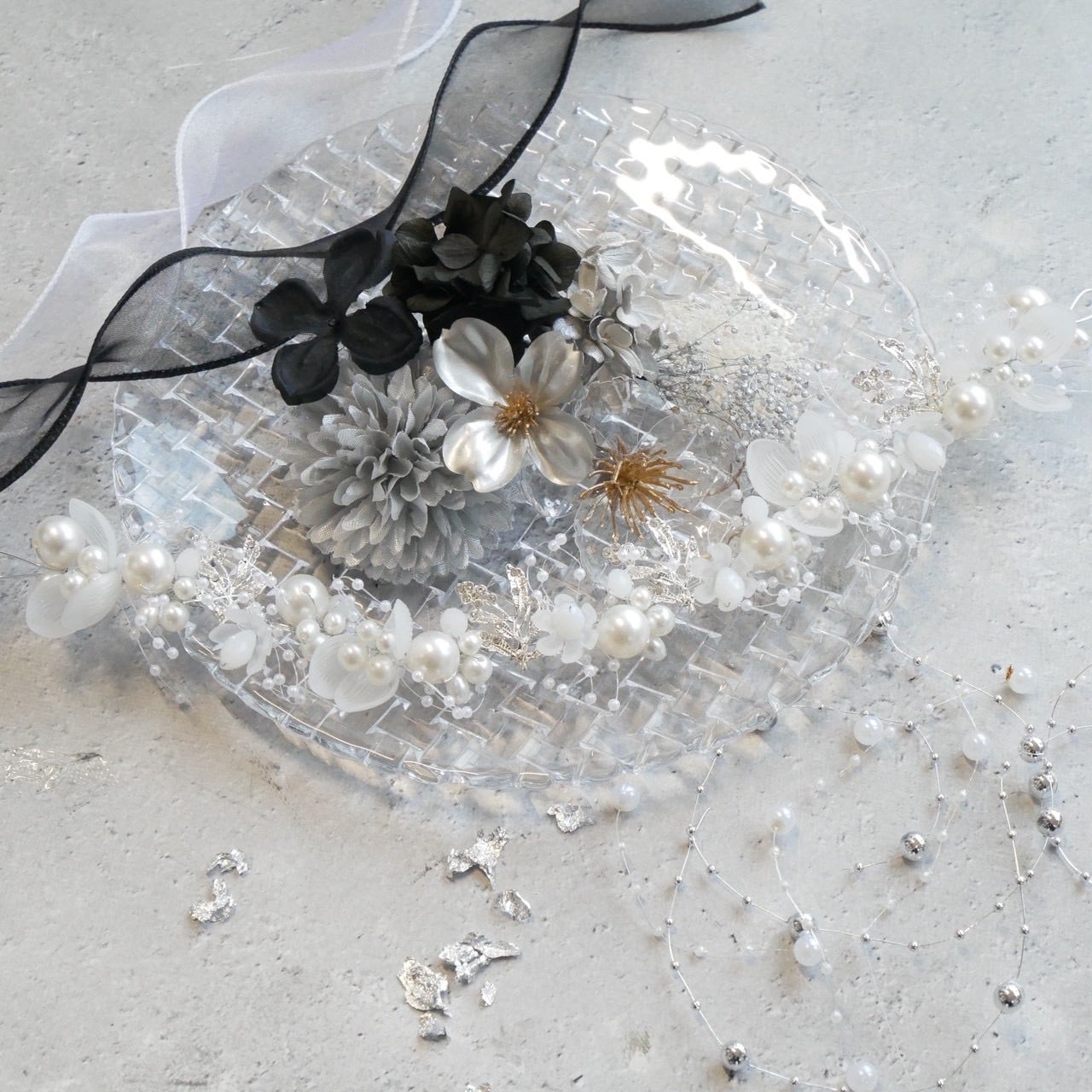 白パールのカチューシャに、シルバーの大輪マムとパールパーツをたっぷり組み合わせた、豪華さあふれる髪飾りセットです。