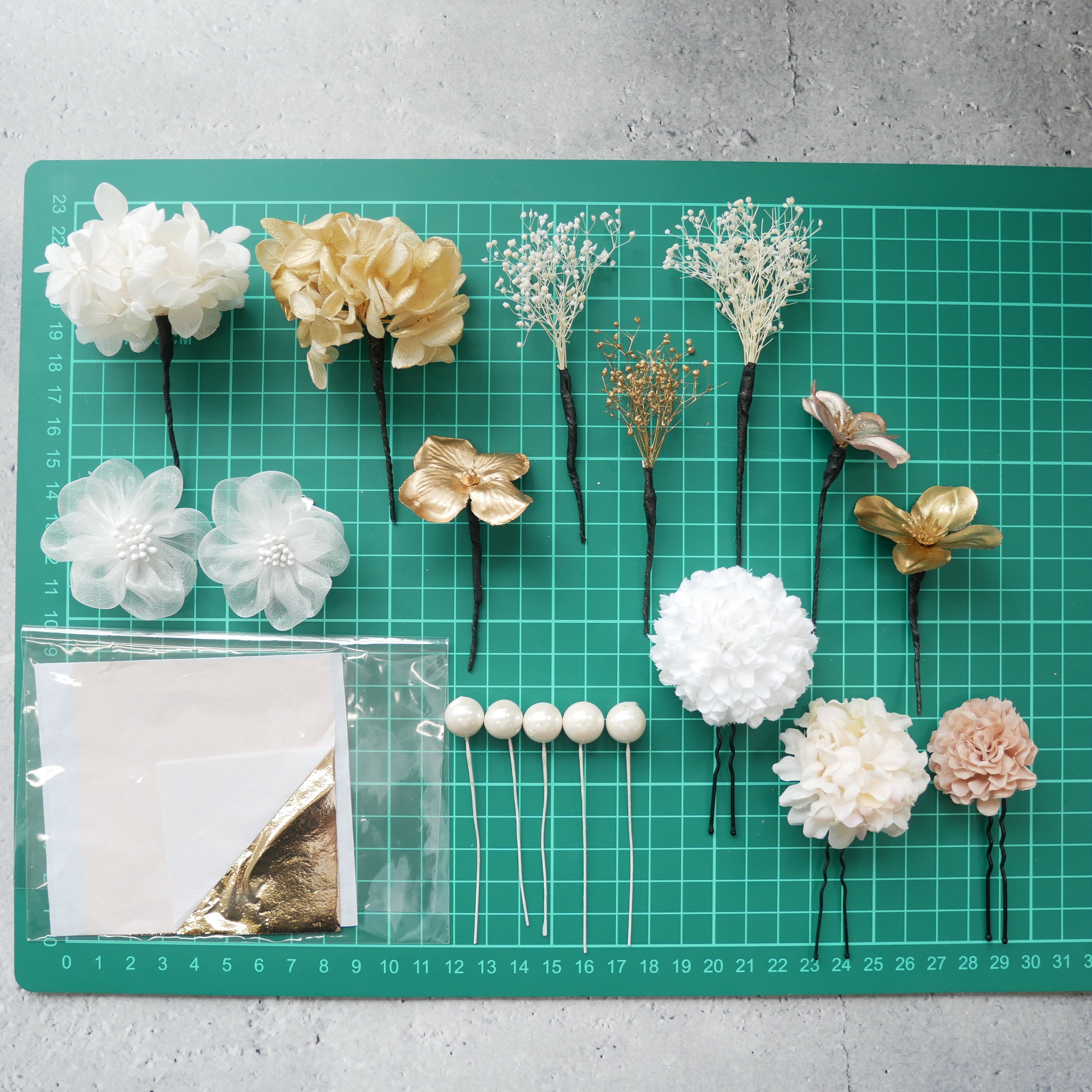 今流行りのオーガンジーフラワーをメインに合わせた髪飾りのセット。