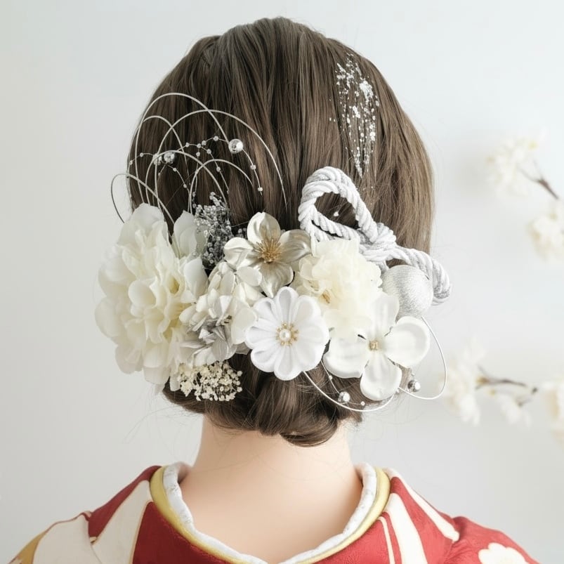 水引とパールがふんわりと広がり、後ろ姿まで印象的に仕上げてくれます。
