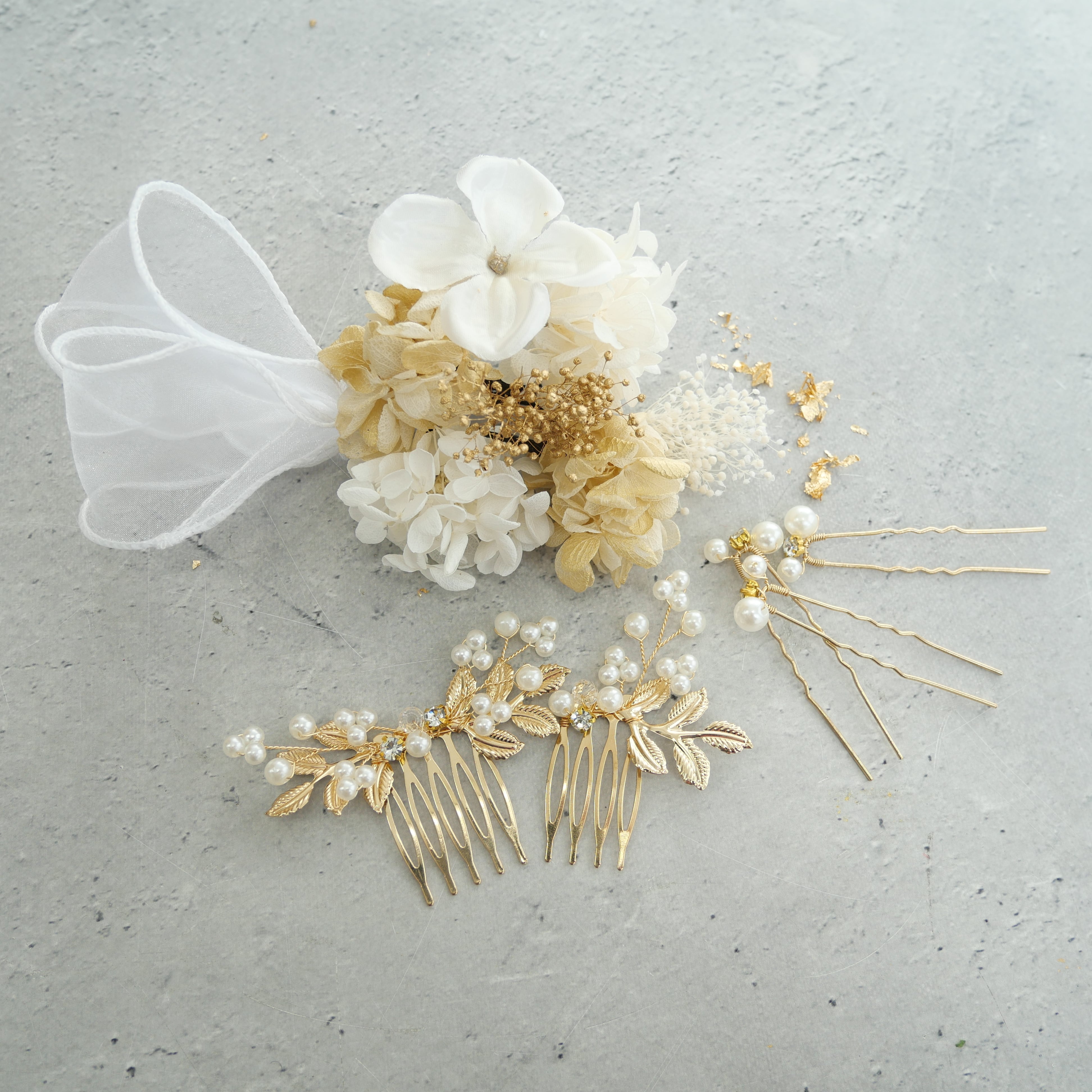 パールと繊細なゴールドパーツを添えたヘッドドレス。