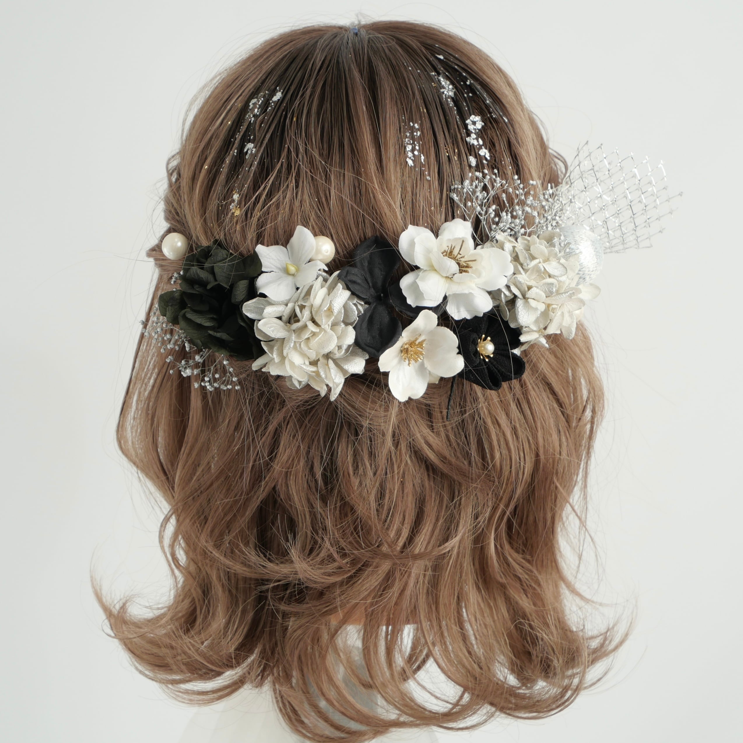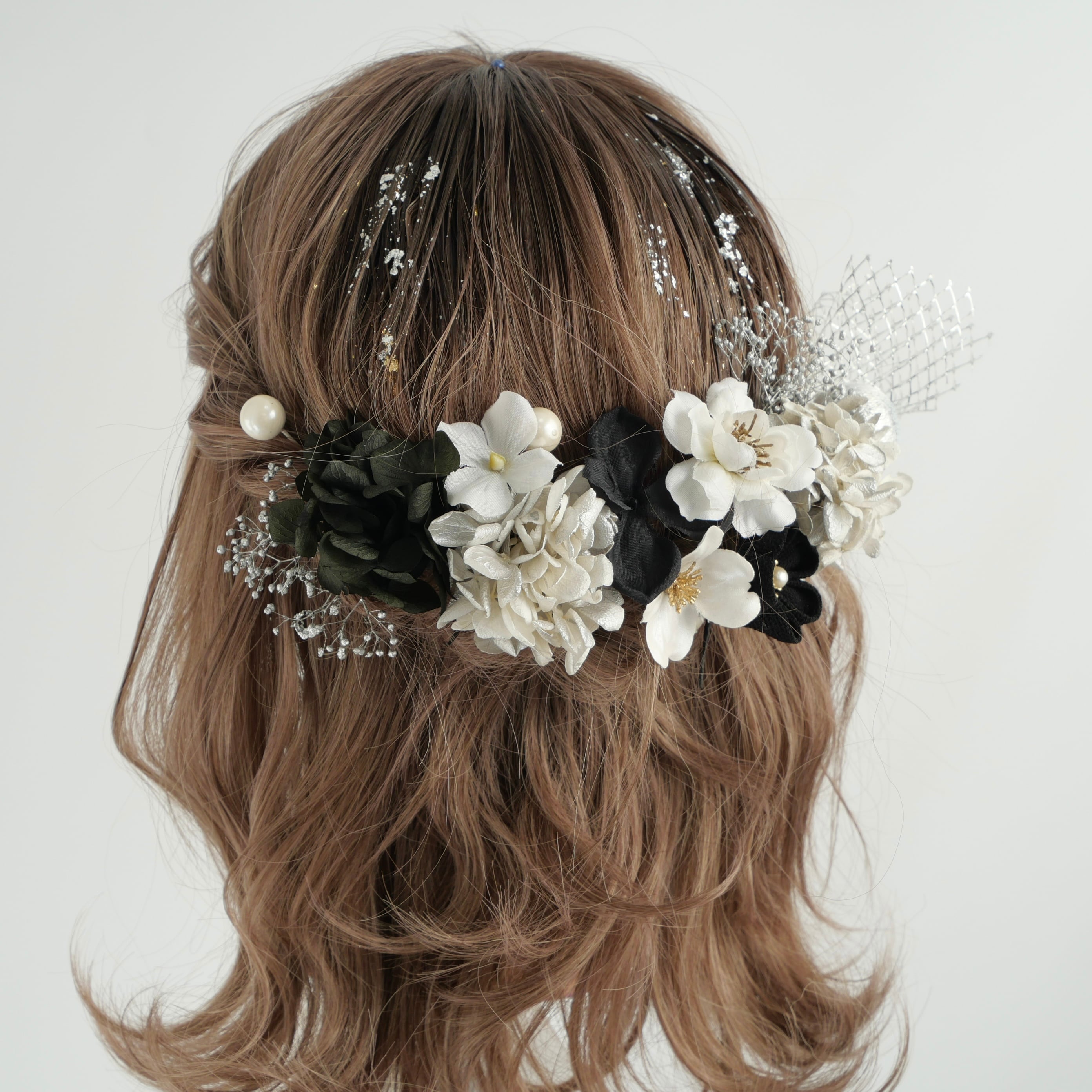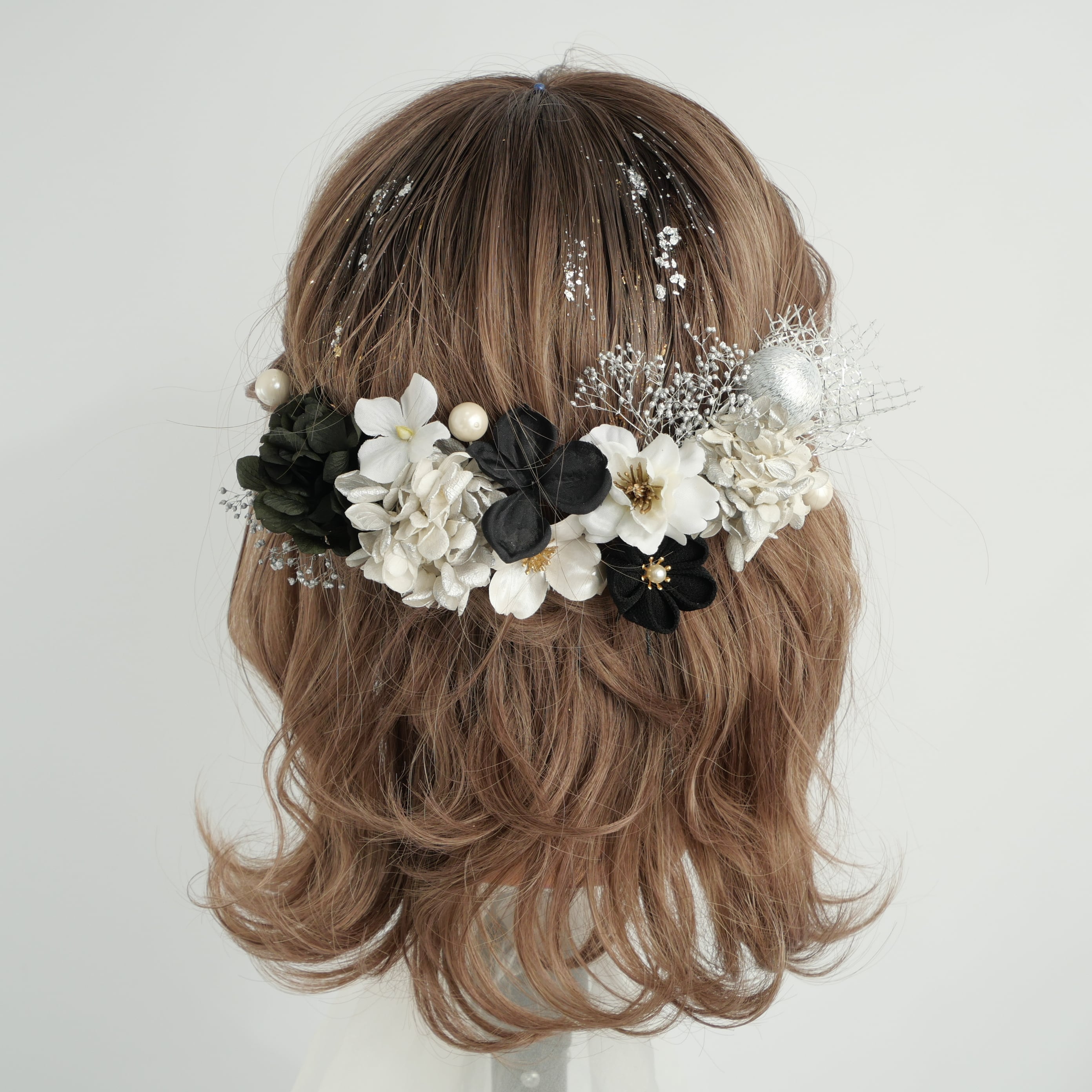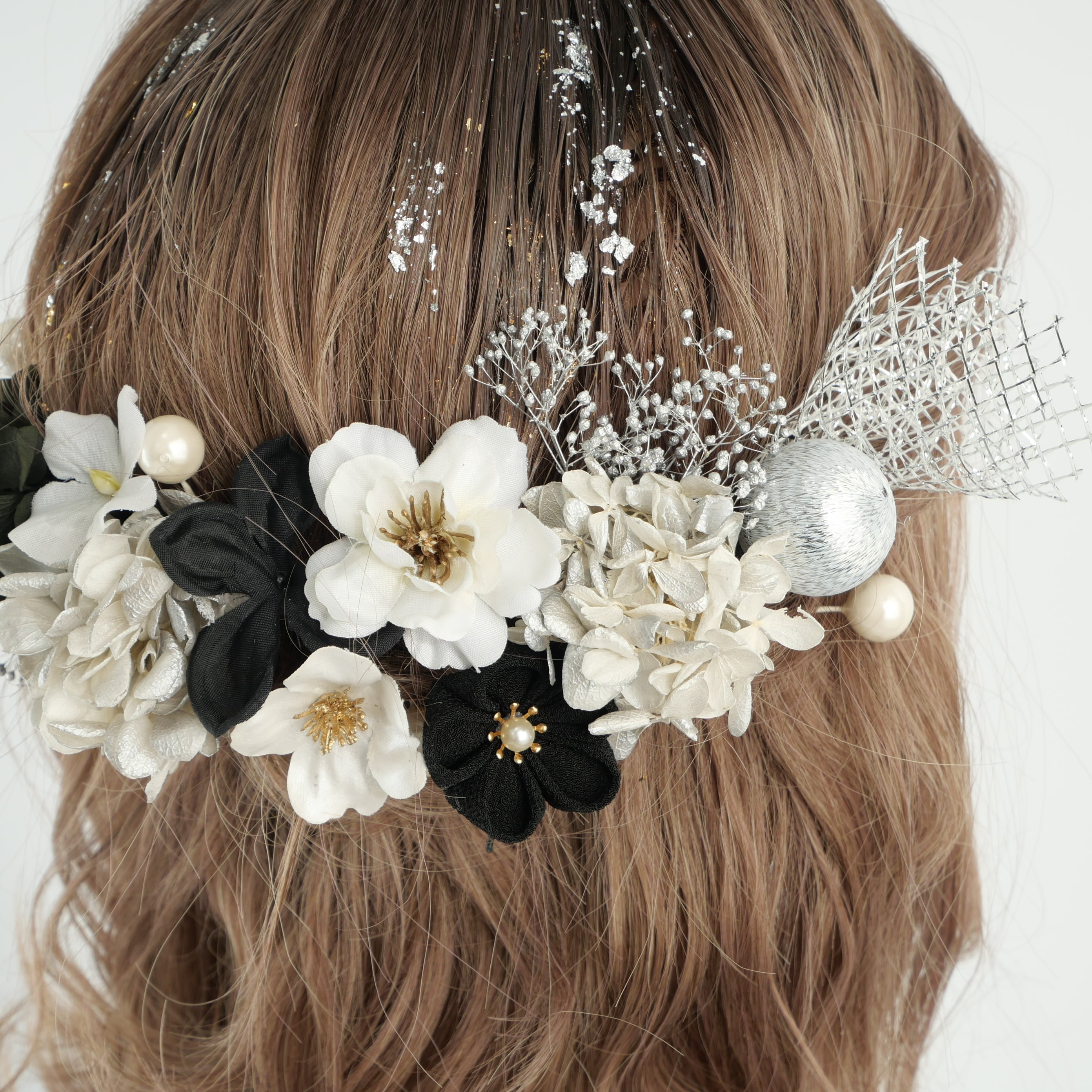 黒×シルバー×白を基調に、繊細な金箔をあしらった、上品で華やかな髪飾りです。