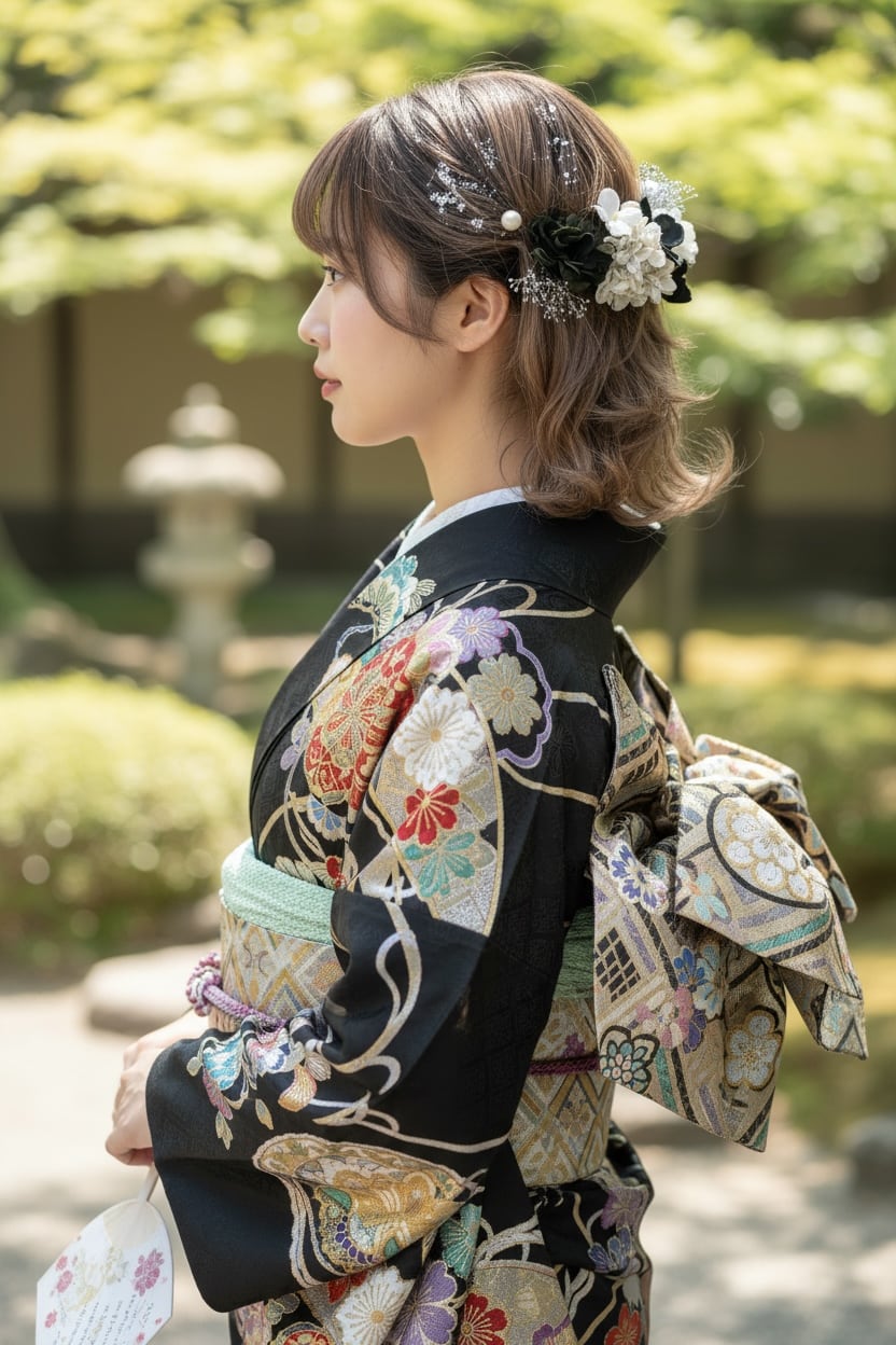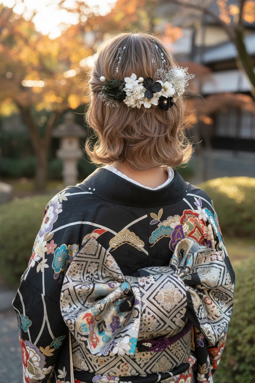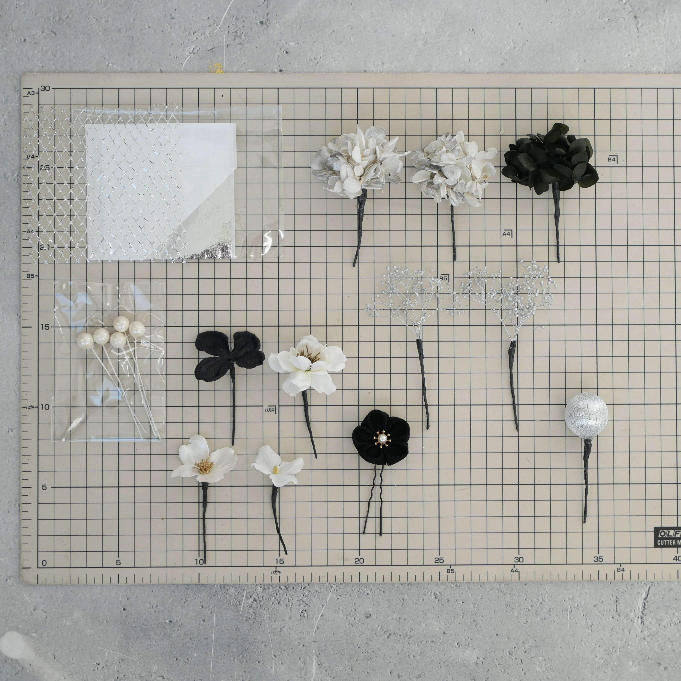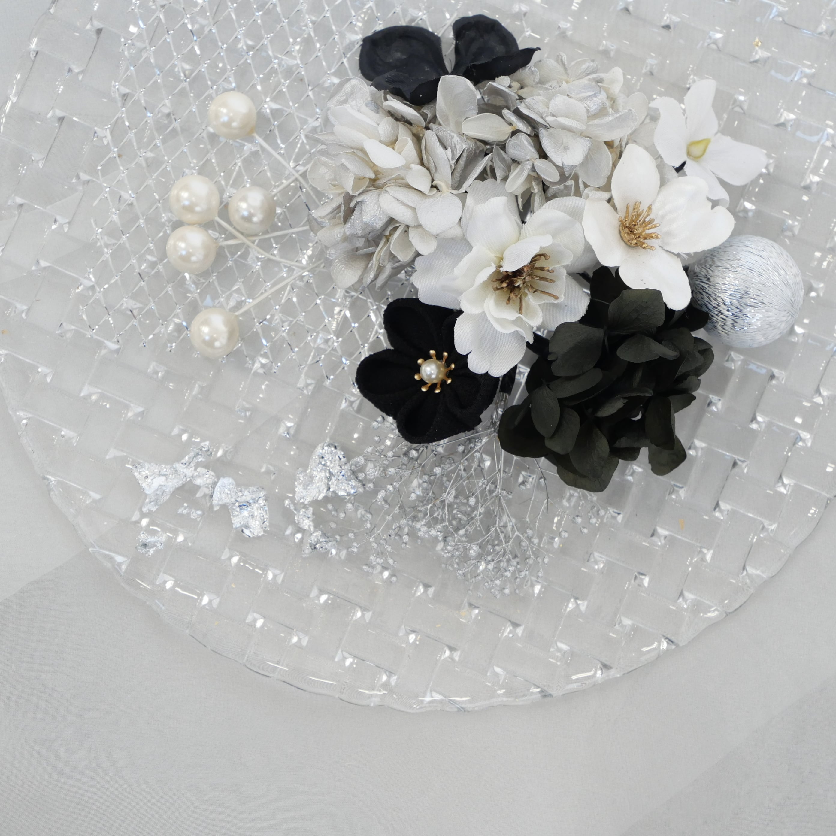黒×シルバー×白を基調に、繊細な金箔をあしらった、上品で華やかな髪飾りです。