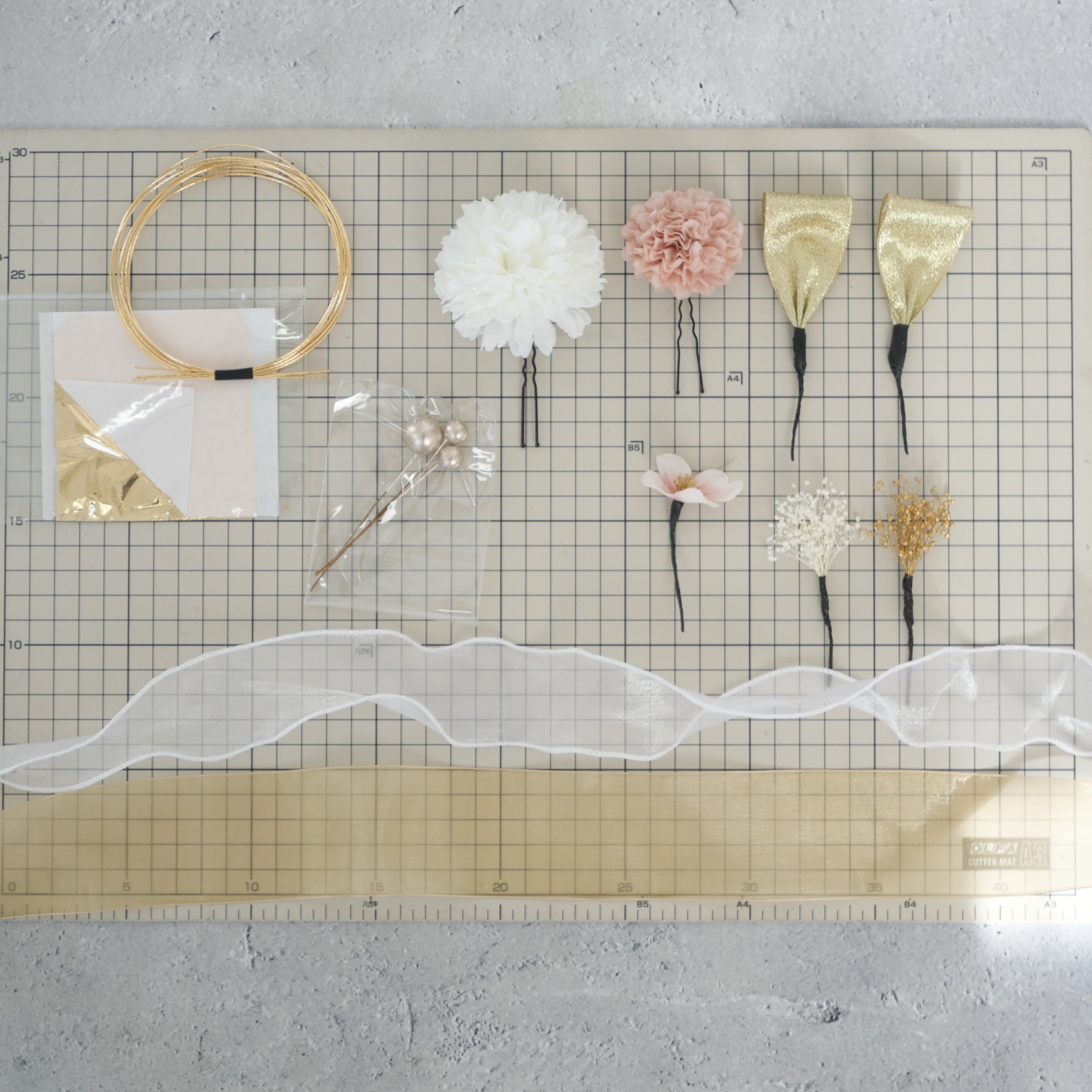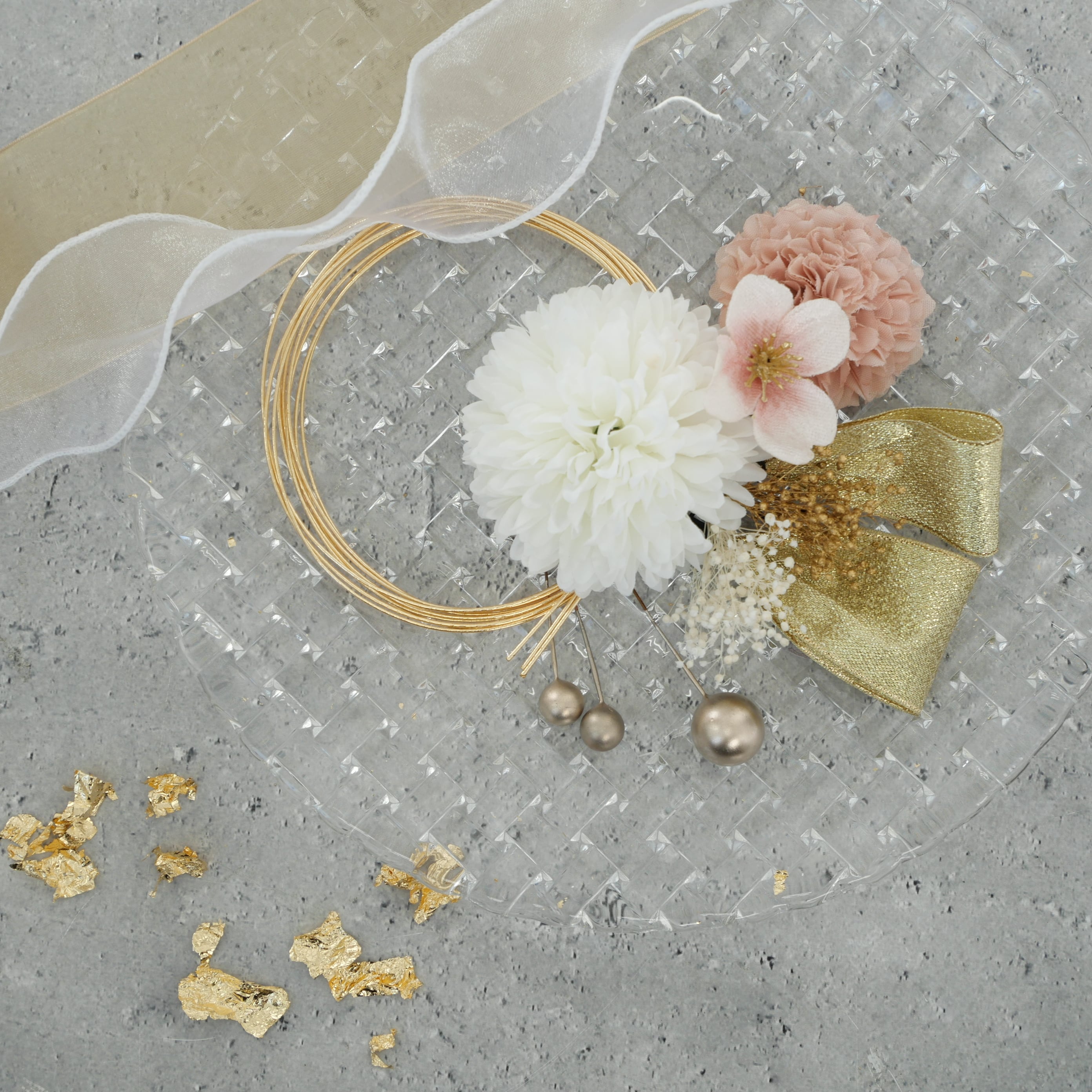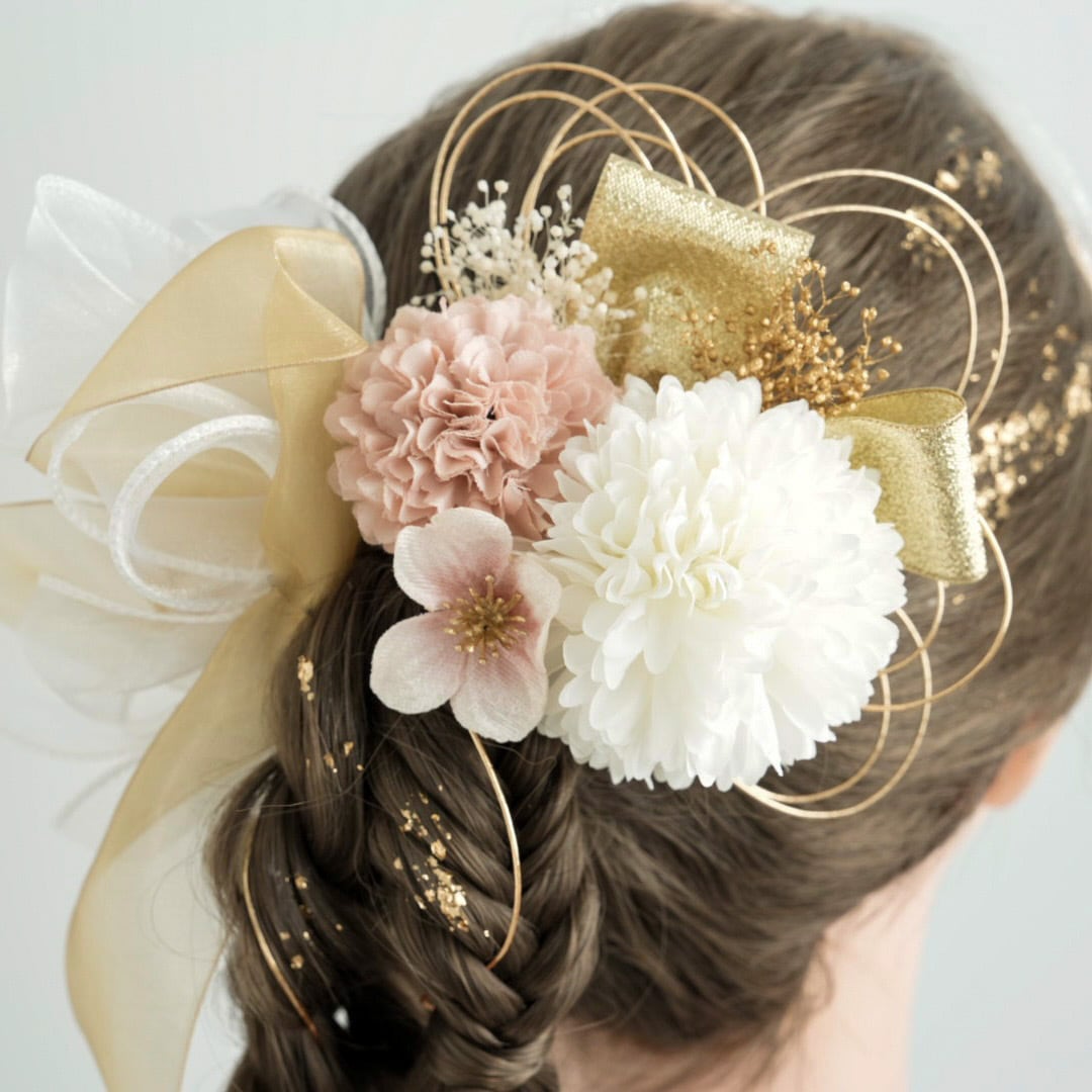 オーガンジーリボンを主役にピンクゴールドを基調にまとめた髪飾りです。