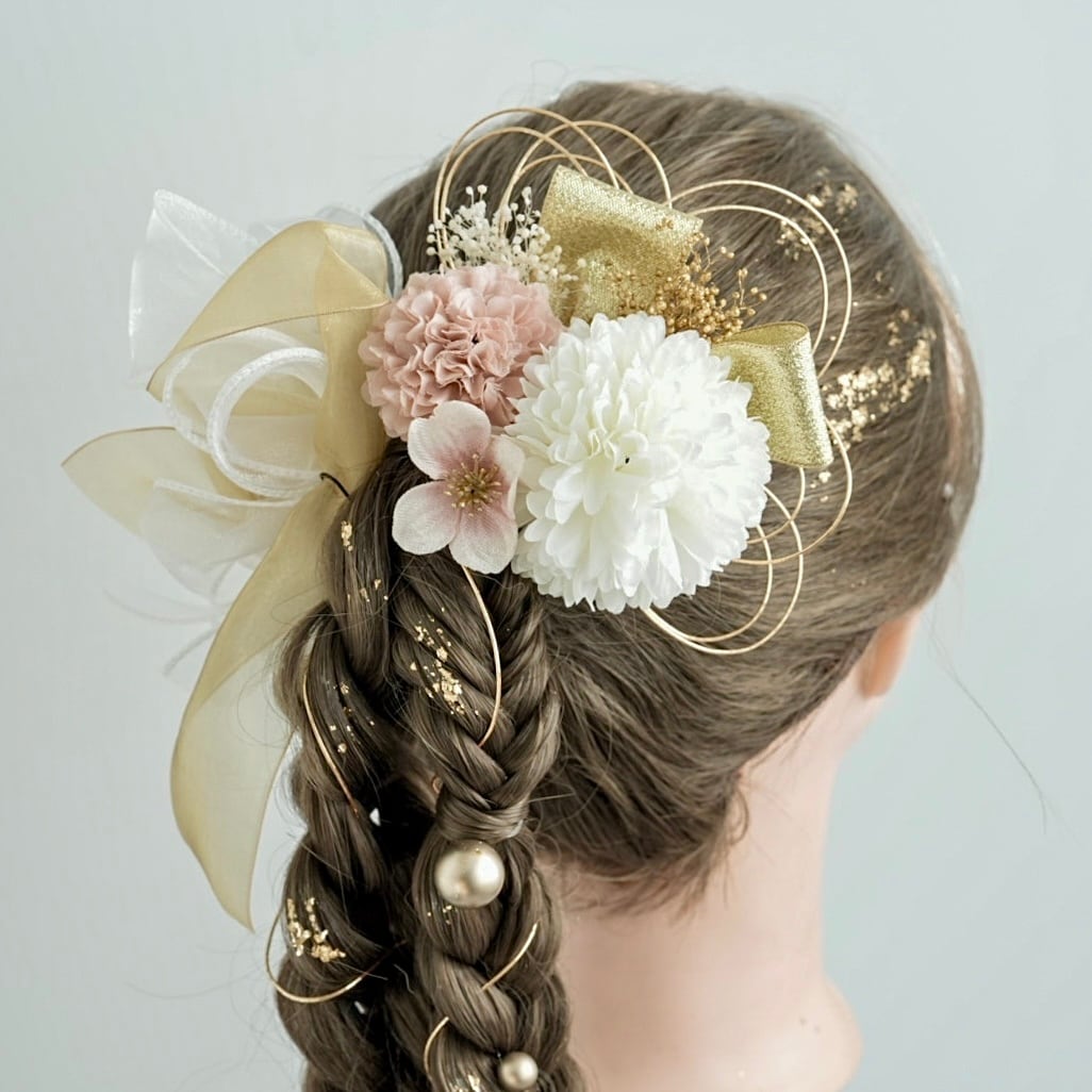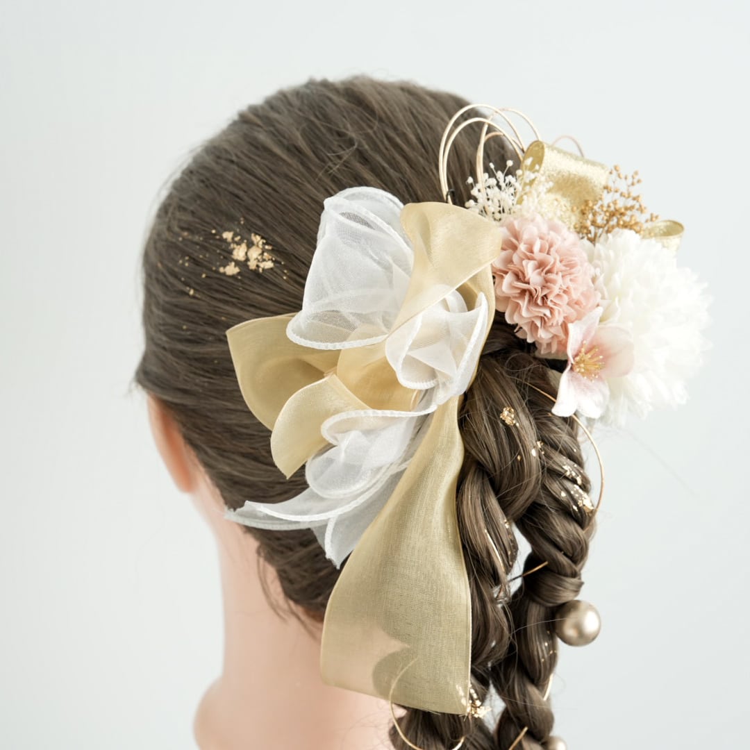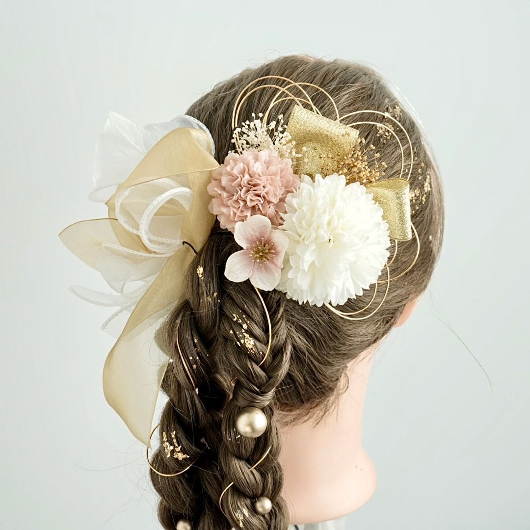 A542 カーリーリボン ドライフラワー ピンク ゴールド 髪飾り 卒業式 成人式 振袖 結婚式