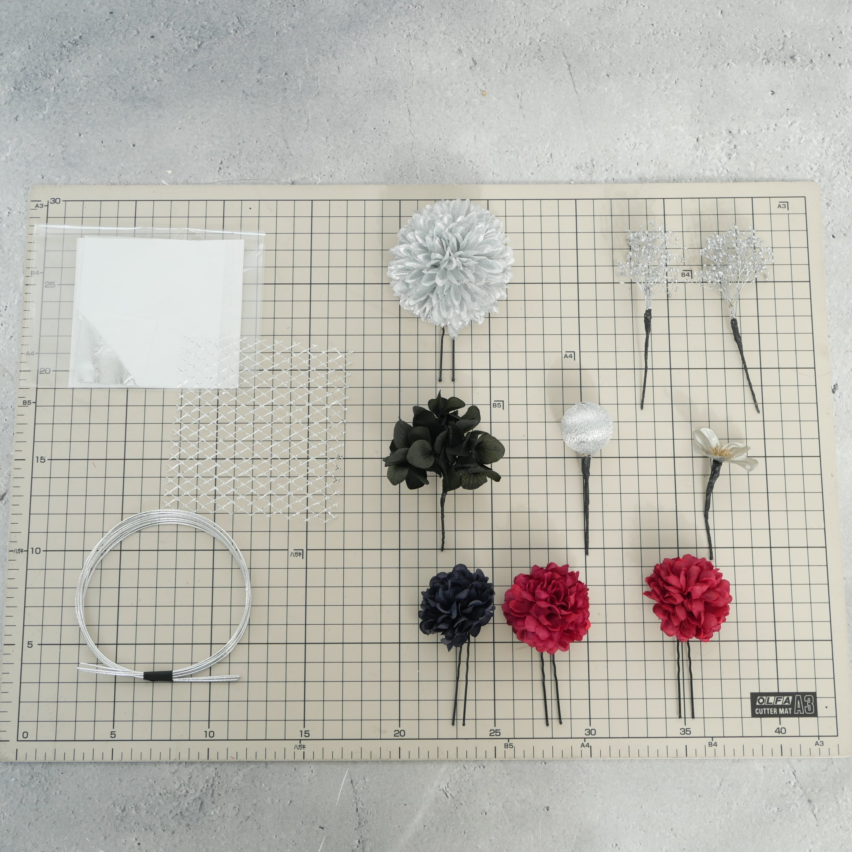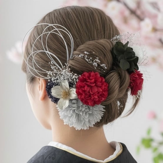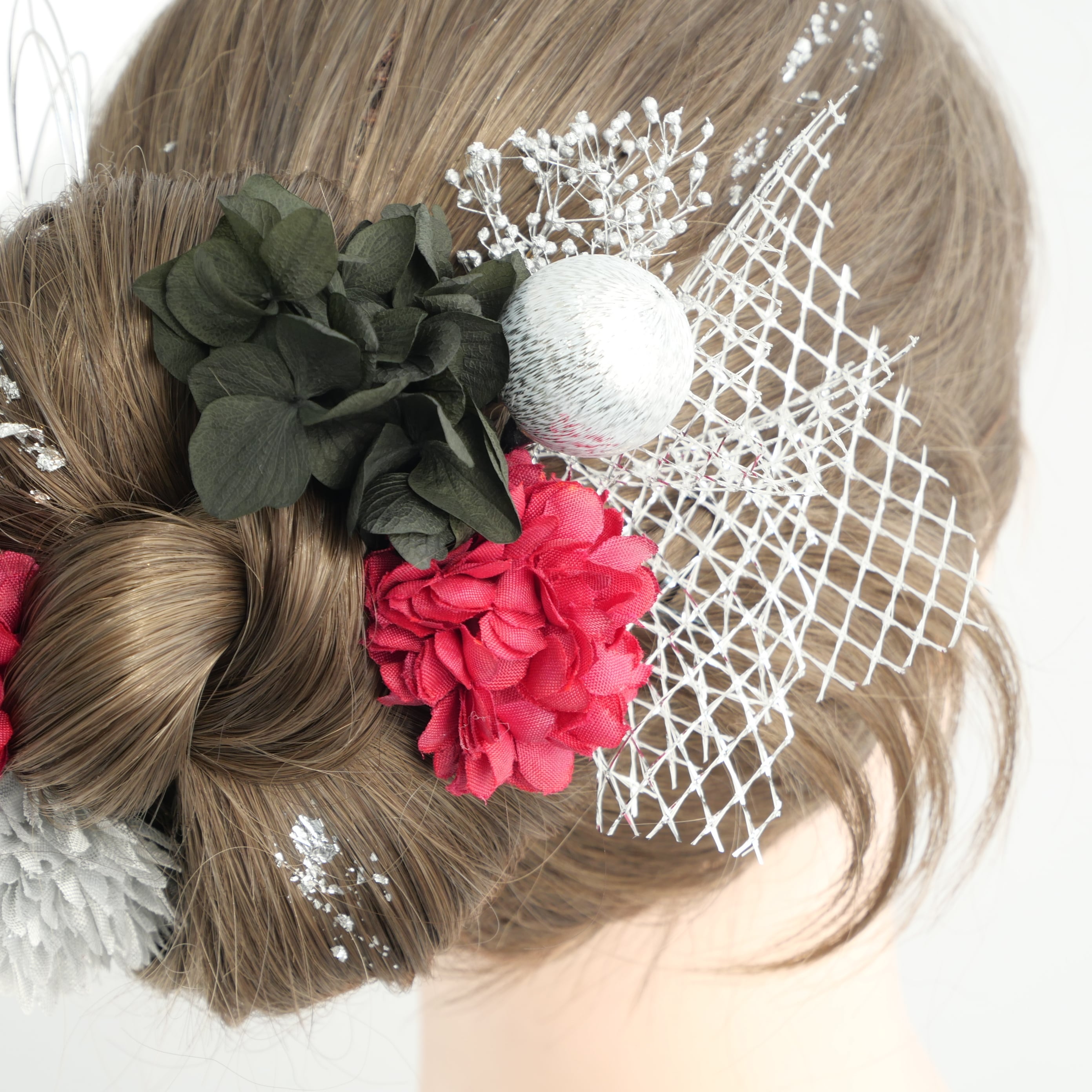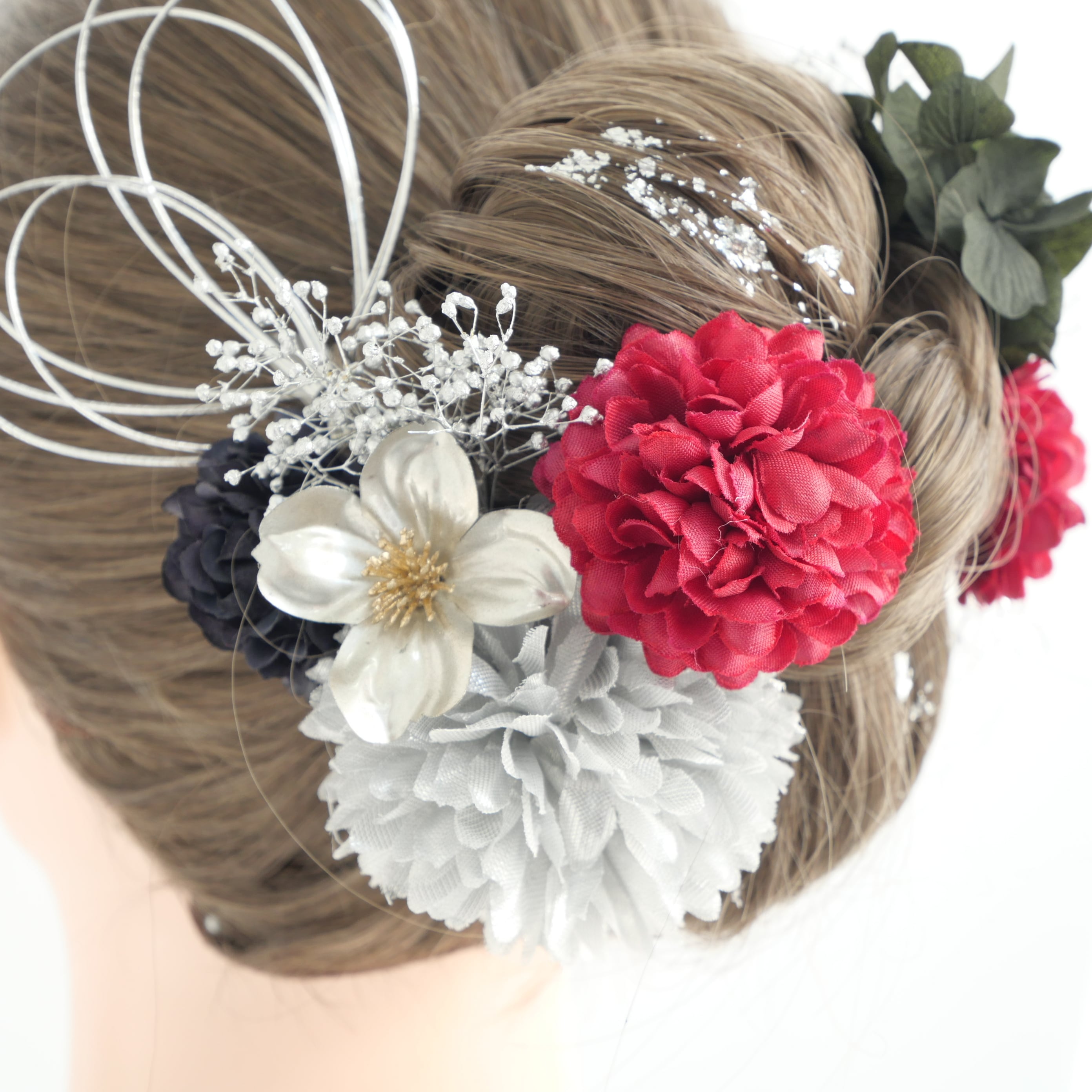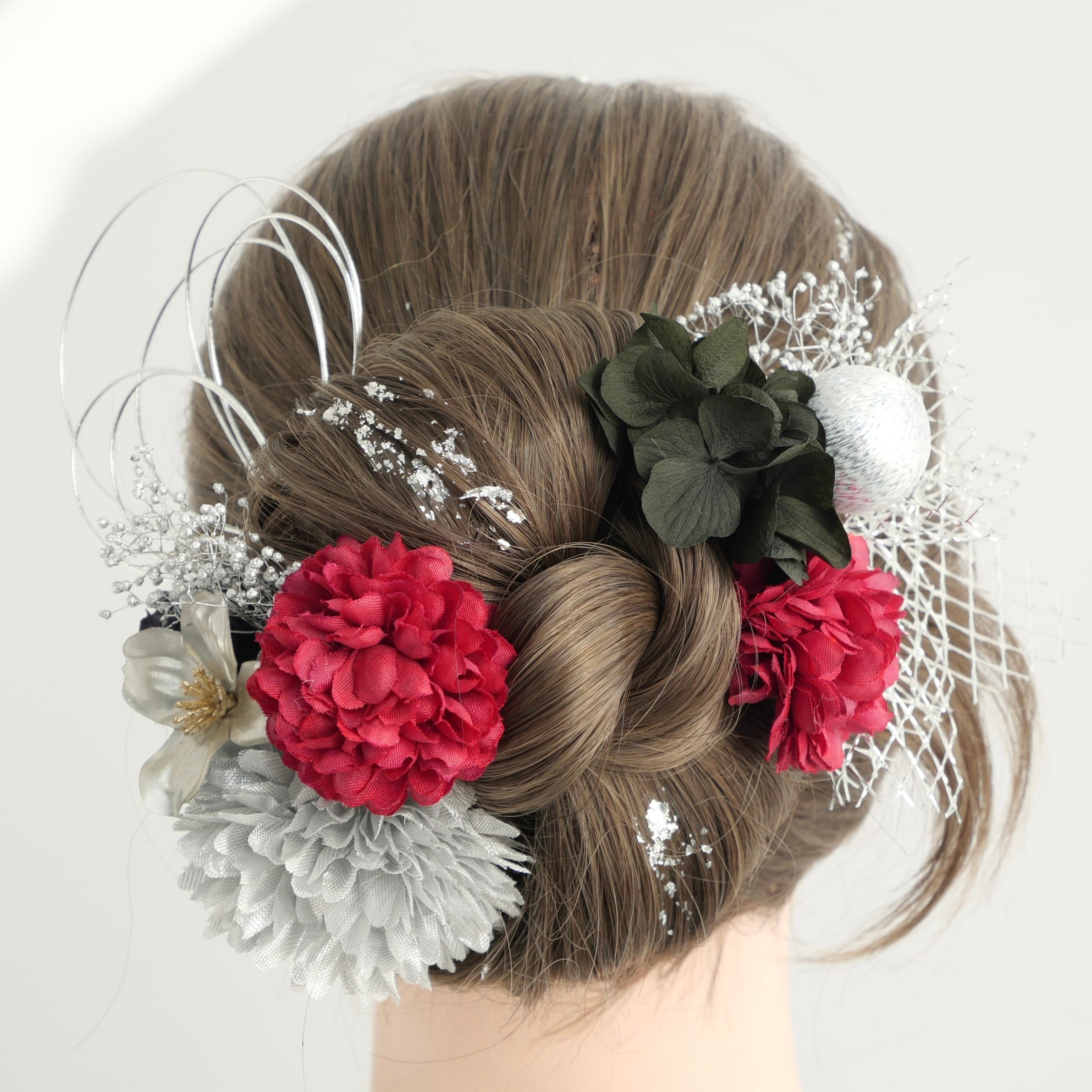A555 ドライフラワー マム 髪飾り 赤 黒 シルバー 卒業式 袴 成人式 振袖 結婚式 和装