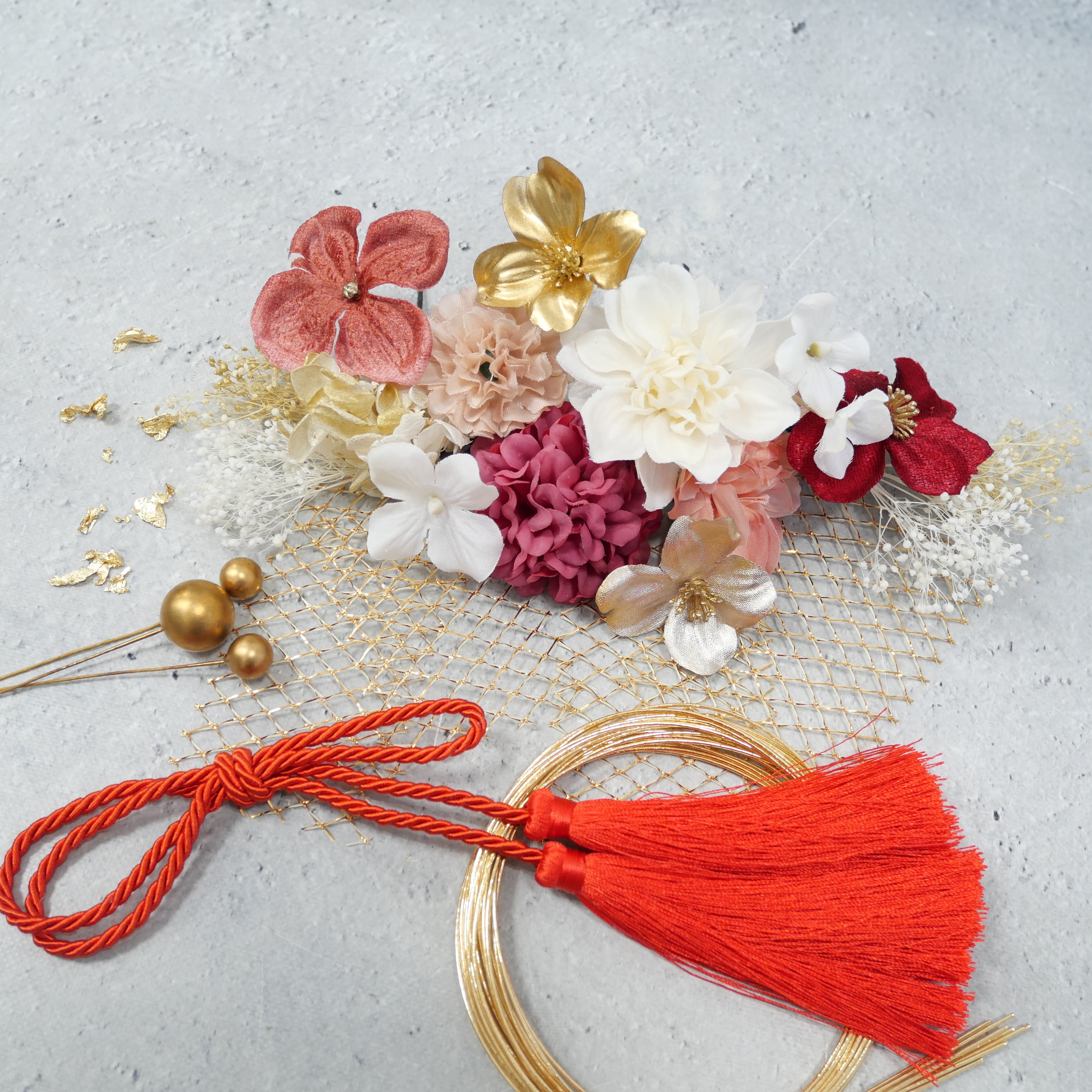 ブロンズの水引を立体的にあしらい、動きのあるデザインに仕上げました。赤や淡いピンク、ベージュの花々をバランスよく組み合わせ、やわらかく女性らしい印象に。ところどころに入れたゴールドパーツやブロンズ箔が、光を受けるたびにさりげなく輝き、特別な一日をより華やかに演出します。