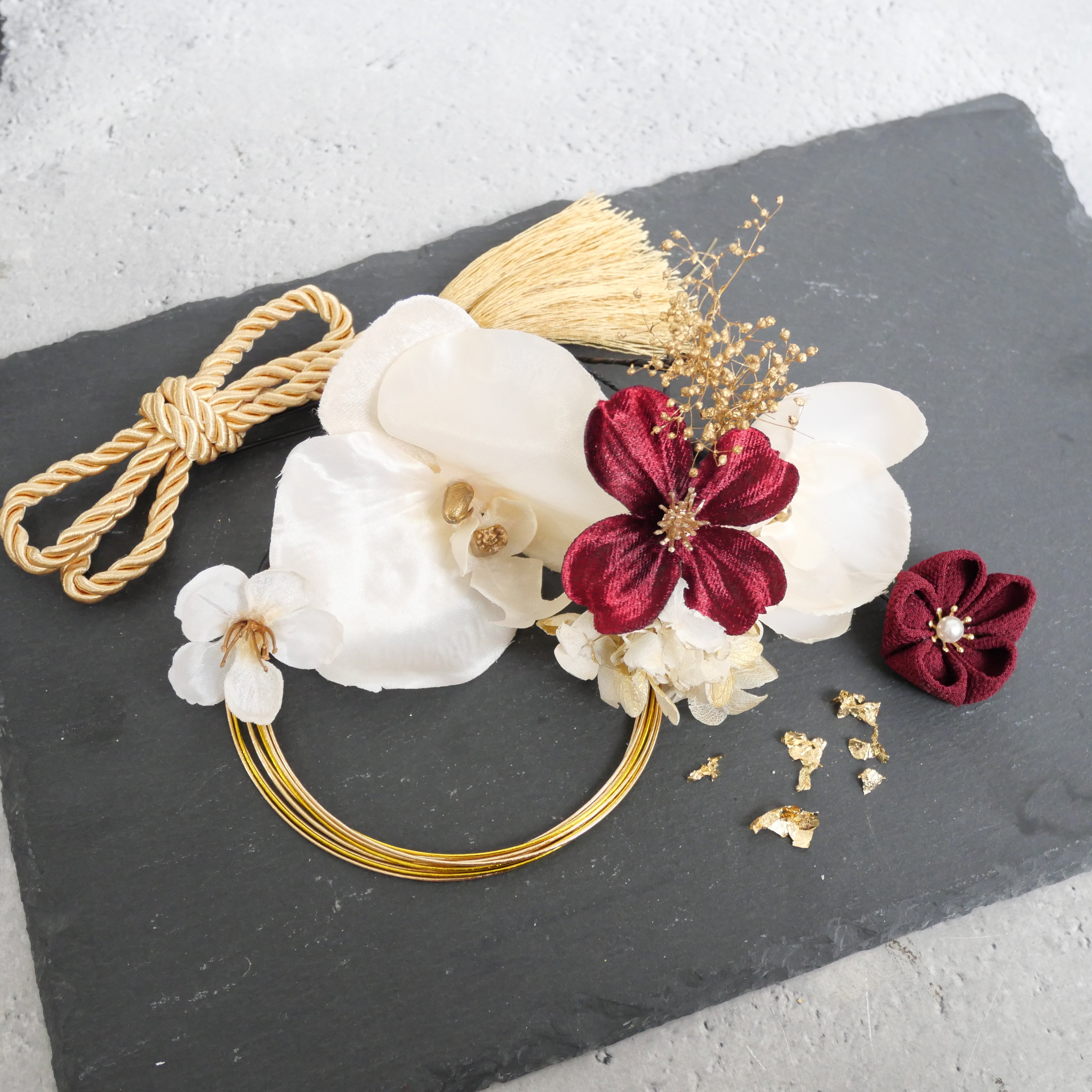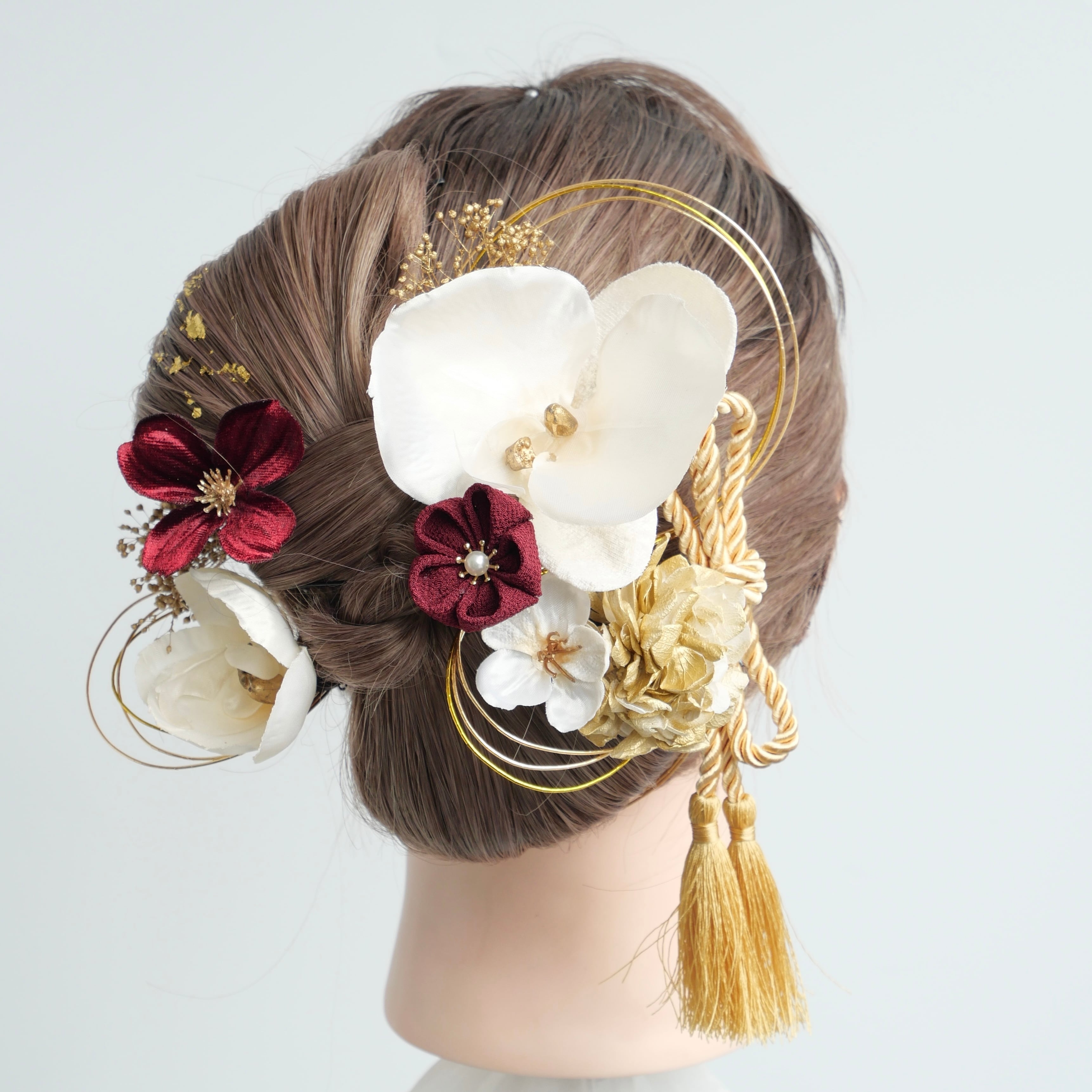 存在感のある白の胡蝶蘭を主役に、深みのあるボルドーの花をバランスよく組み合わせました。繊細なゴールドの水引とタッセルが、動くたびにやさしく揺れ、後ろ姿をより印象的に演出します。
