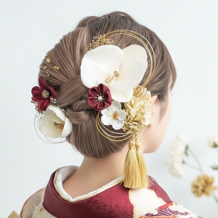 大人っぽさの中に可憐さも感じられるデザインで、振袖・袴・訪問着など幅広い和装に合わせていただけます。前撮りや成人式、卒業式、結婚式など特別な一日にぴったり。