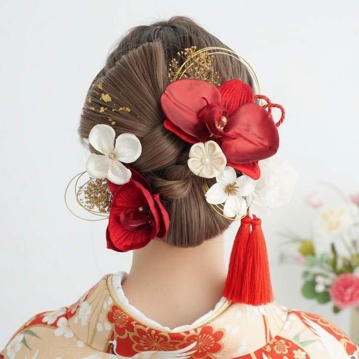 まとめ髪やシニヨンに差し込むだけで、華やかな和装ヘアが完成します。