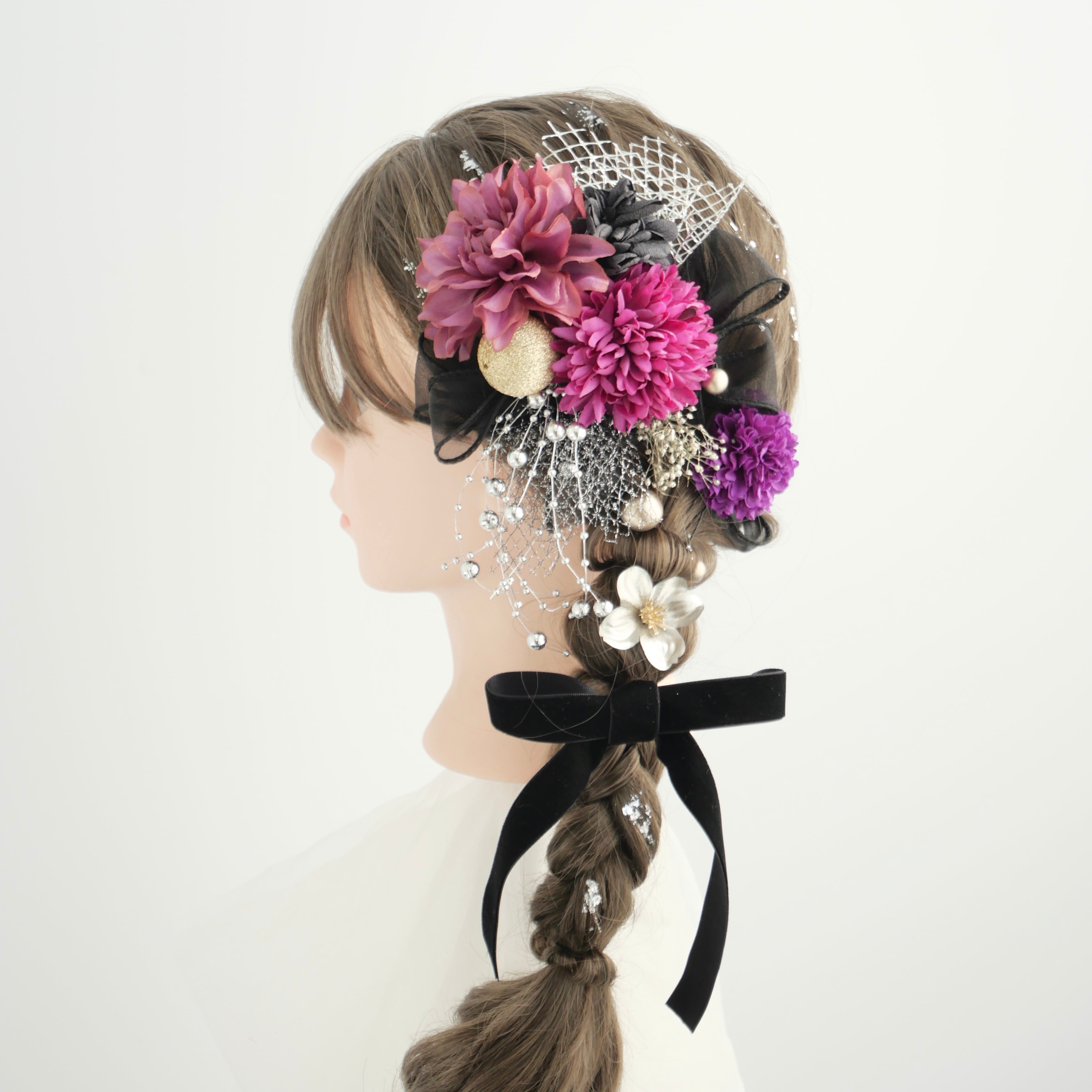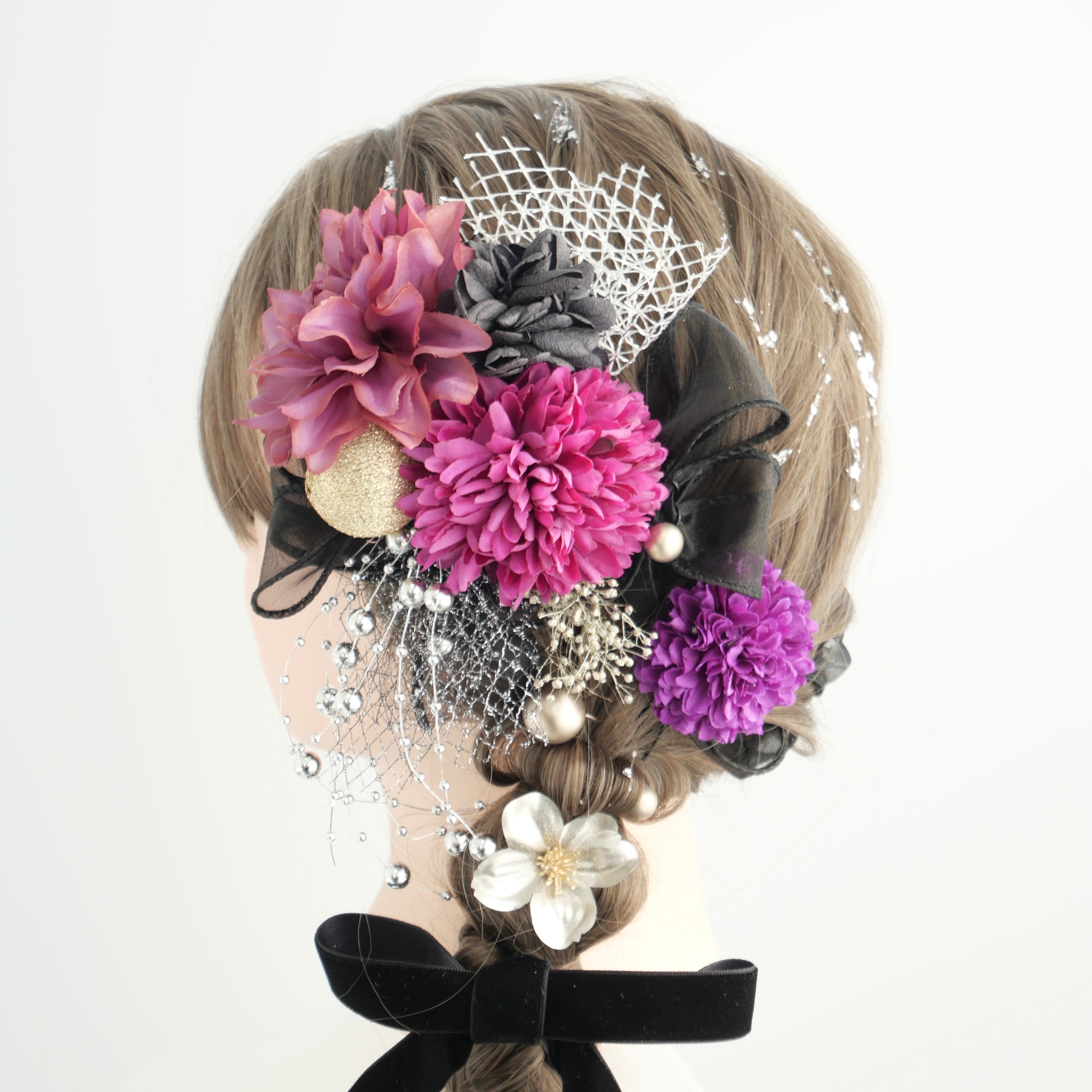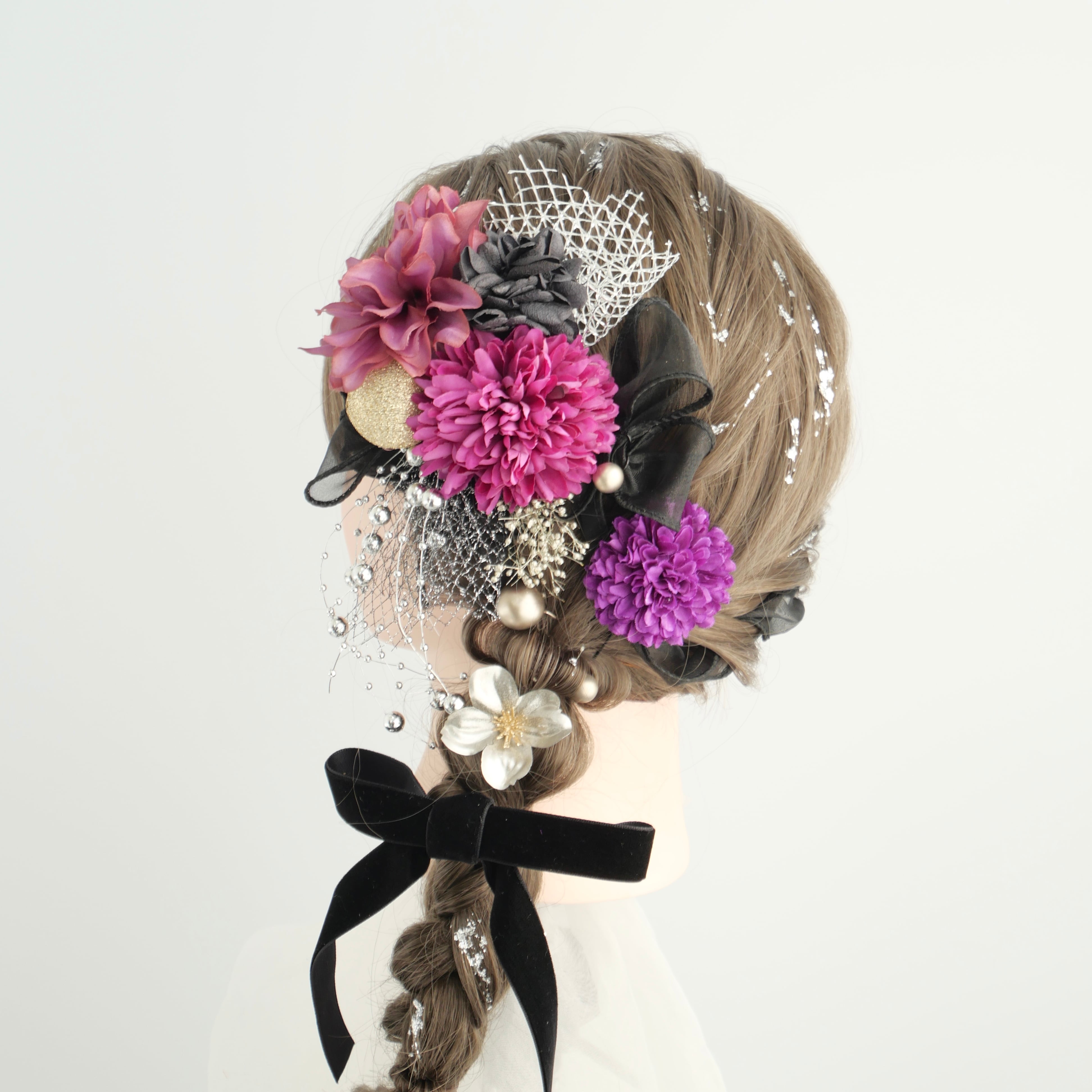 A362 紫 黒 ダリアの髪飾り 成人式 卒業式 前撮り