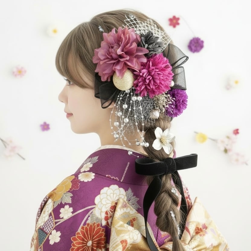 編みおろしやまとめ髪との相性も抜群で、成人式・卒業式・前撮りなど晴れの日にぴったり。