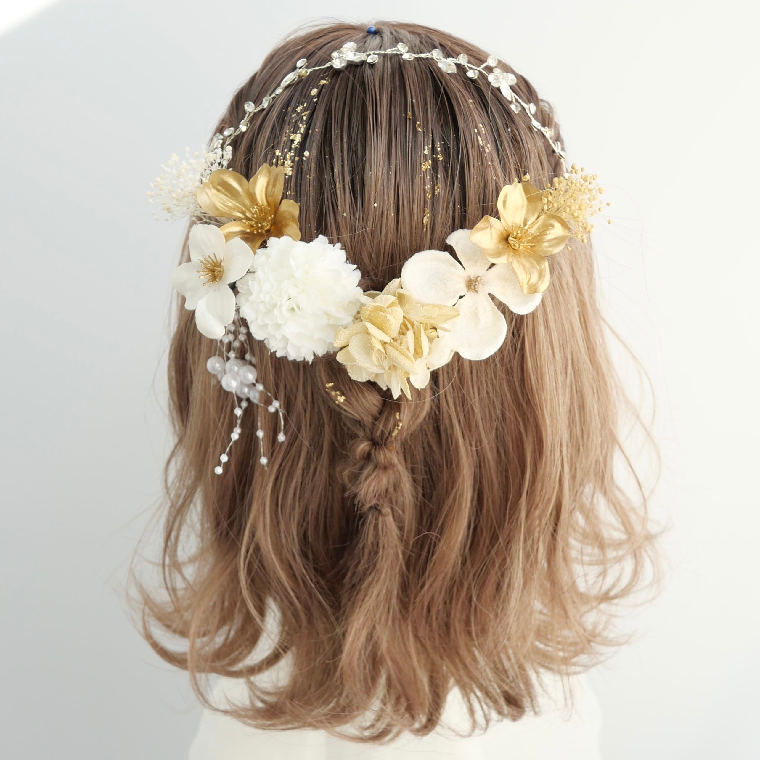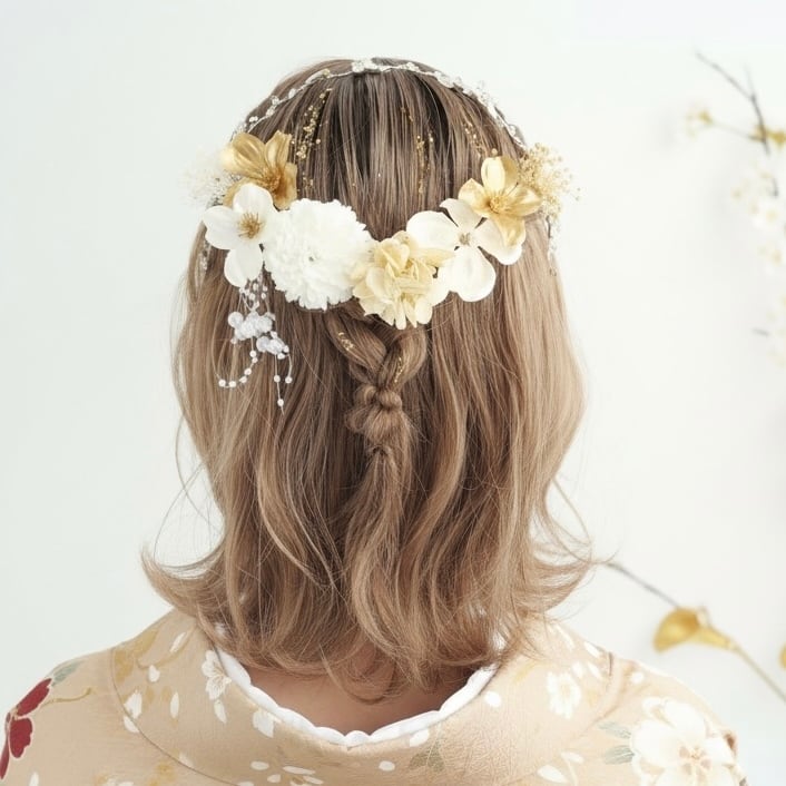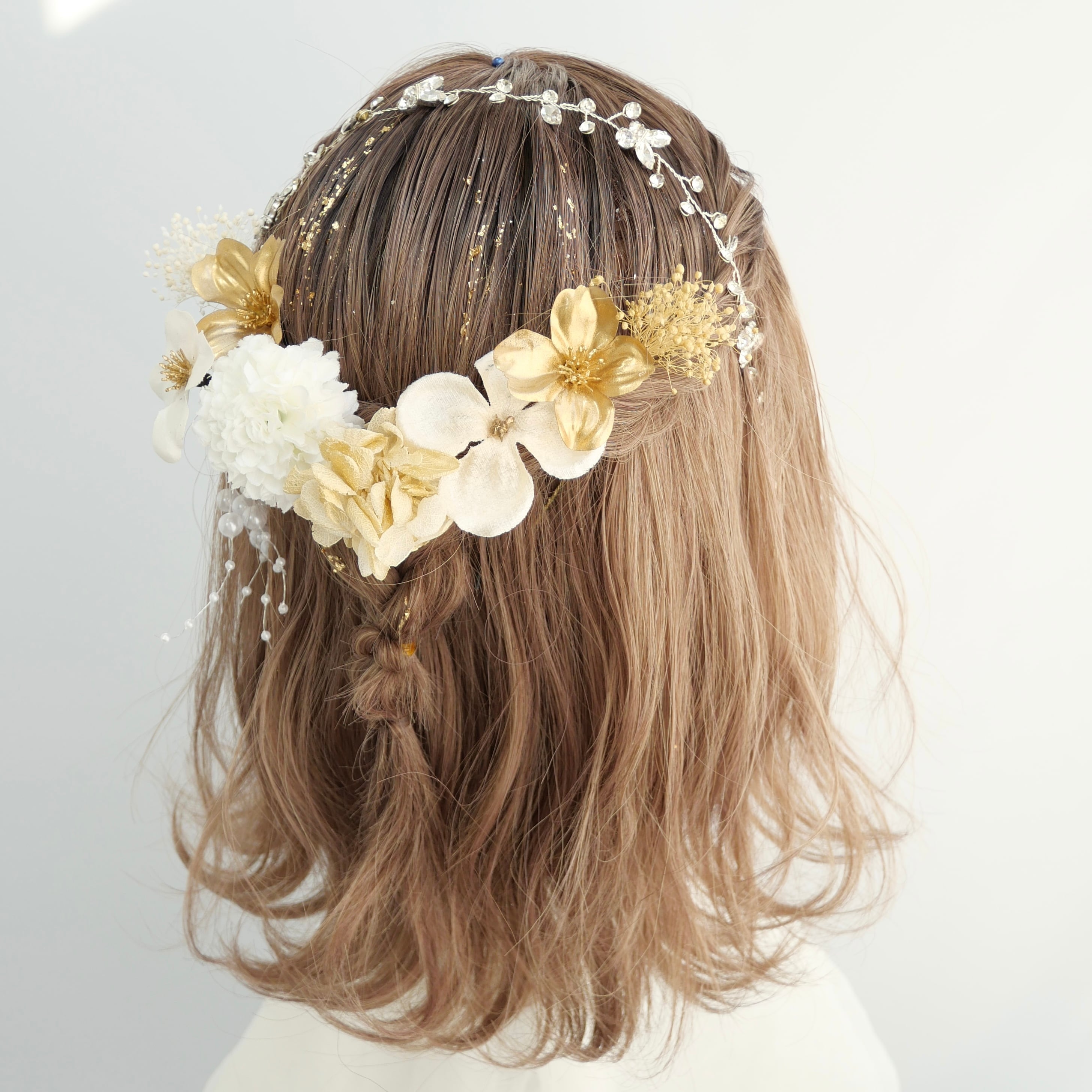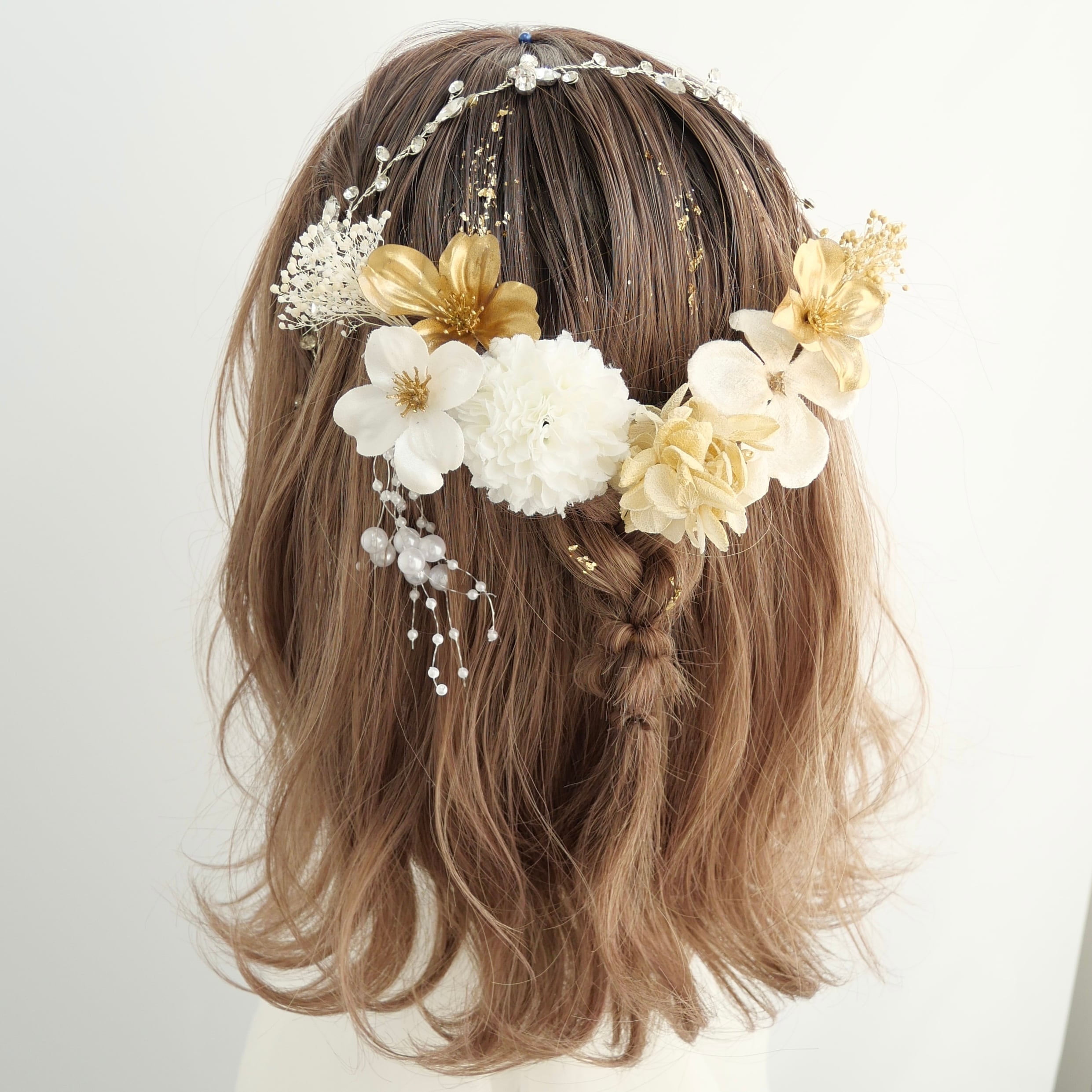 大ぶりのフラワーパーツを中心に、小花や繊細なゴールド素材をバランスよく組み合わせ、後ろ姿をぱっと明るく印象的に。