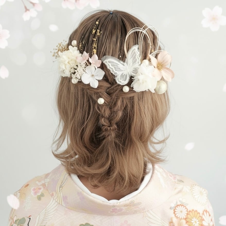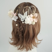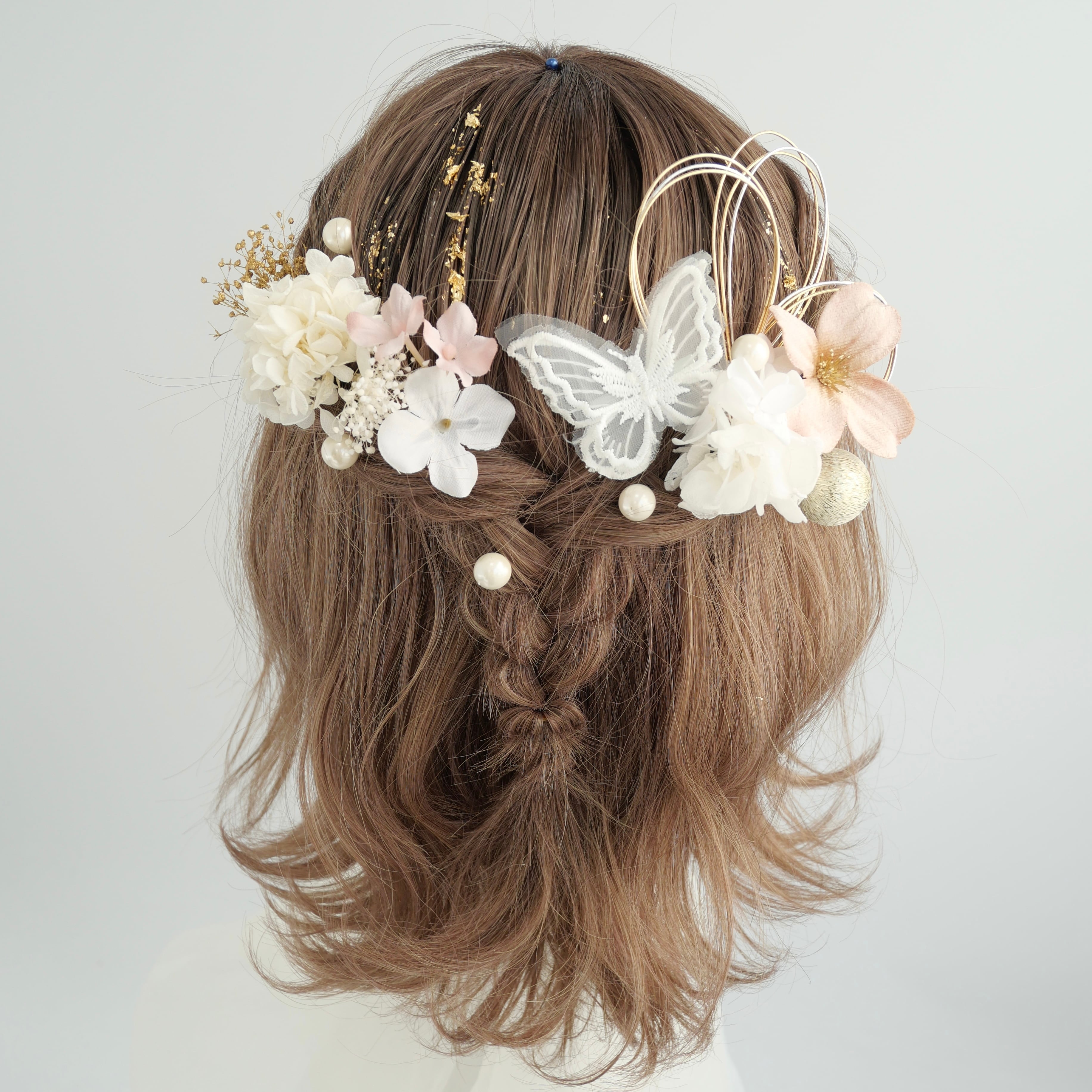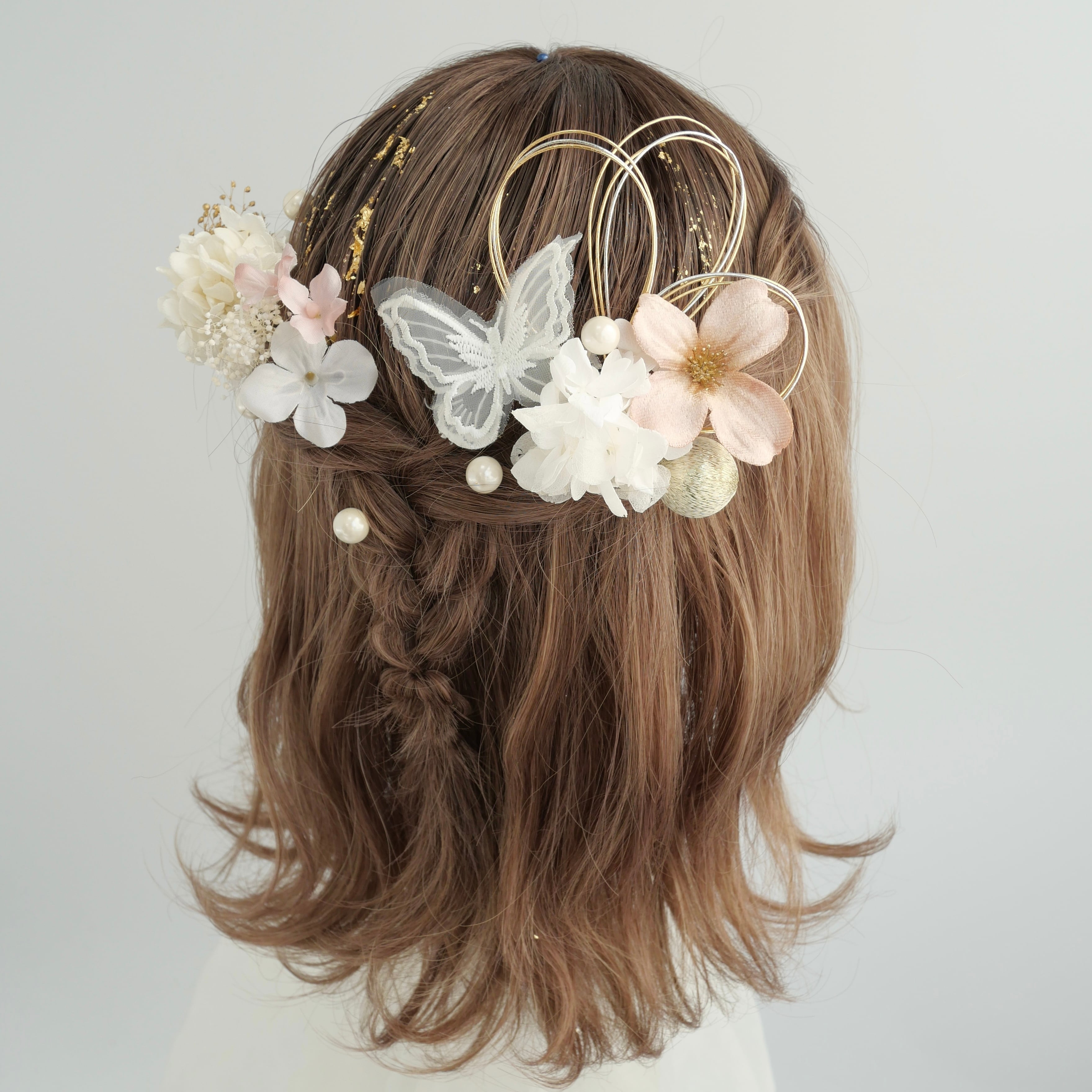 立体感のあるフラワーパーツに、繊細なレース蝶モチーフ、ブロンズの水引を組み合わせ、可憐さと華やかさをバランスよく演出。パールやブロンズ箔が光を受けてさりげなく輝き、後ろ姿まで美しく彩ります。