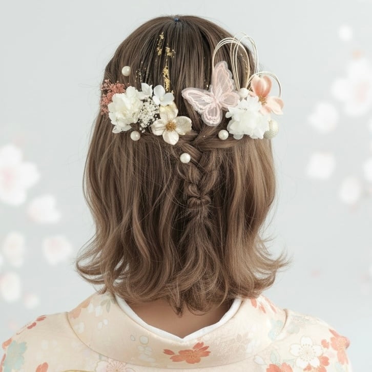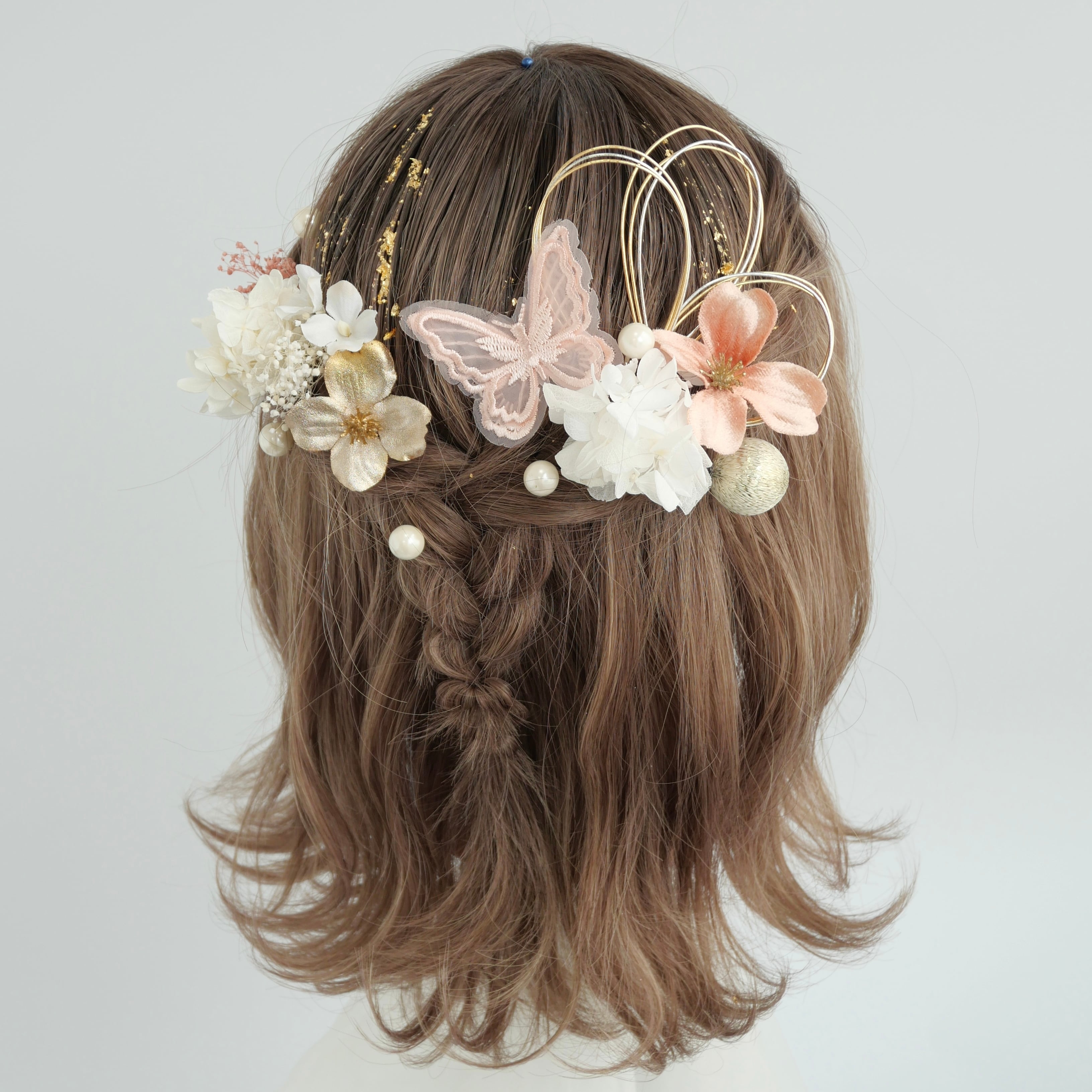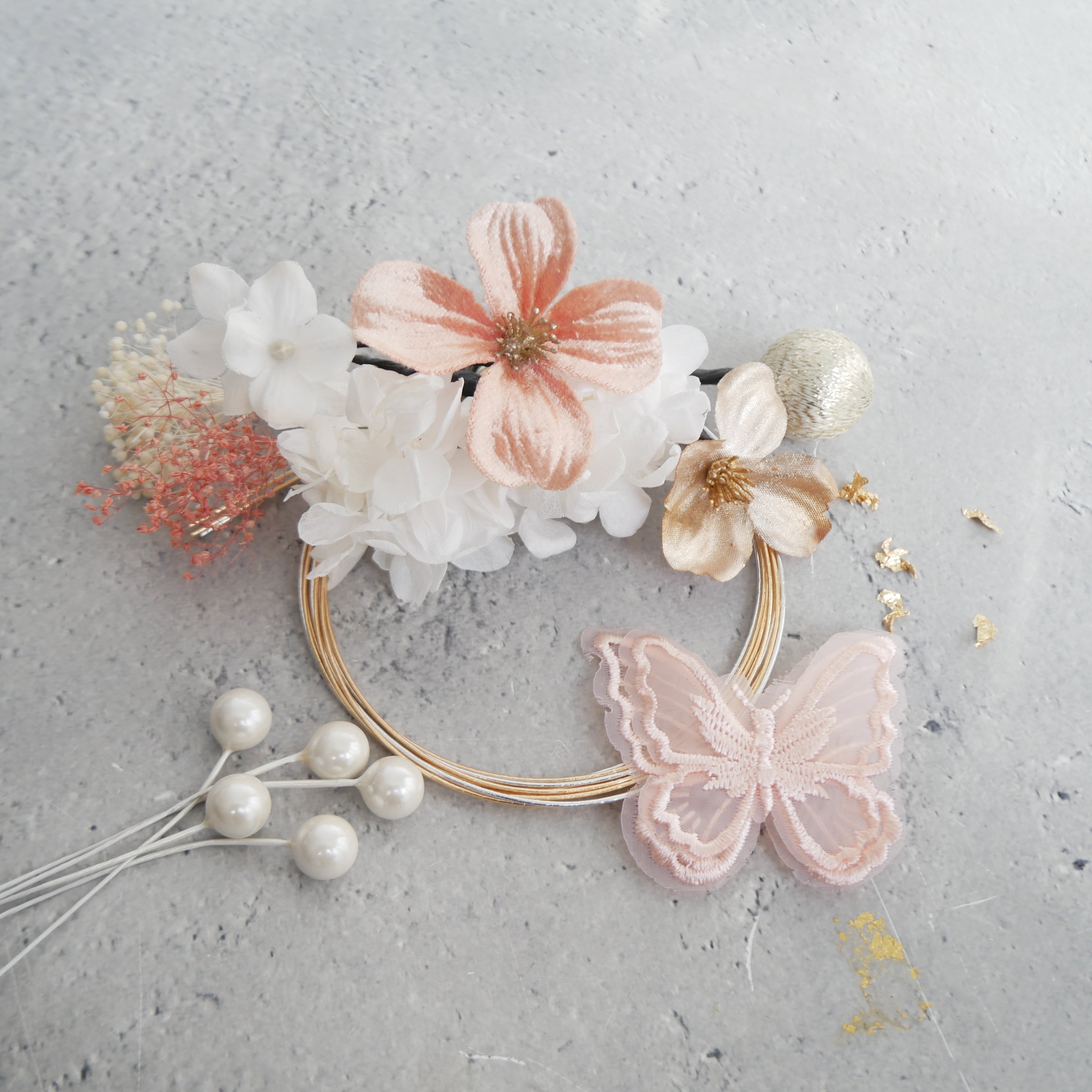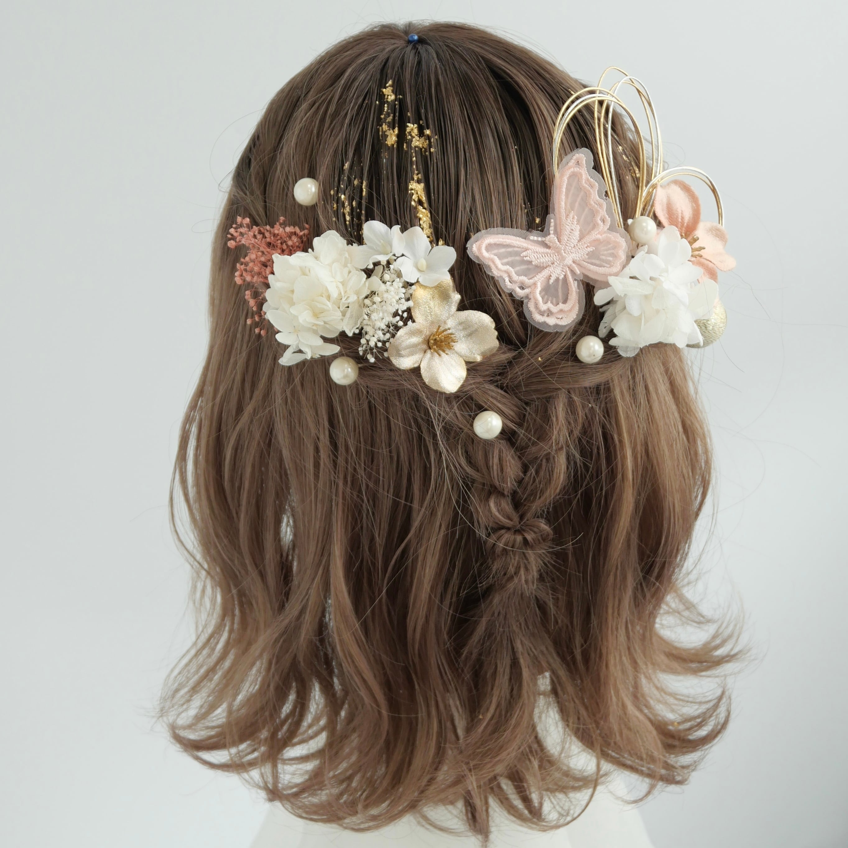 立体感のあるフラワーパーツに、繊細なレース蝶モチーフ、ブロンズの水引を組み合わせ、可憐さと華やかさをバランスよく演出。パールやブロンズ箔が光を受けてさりげなく輝き、後ろ姿まで美しく彩ります。