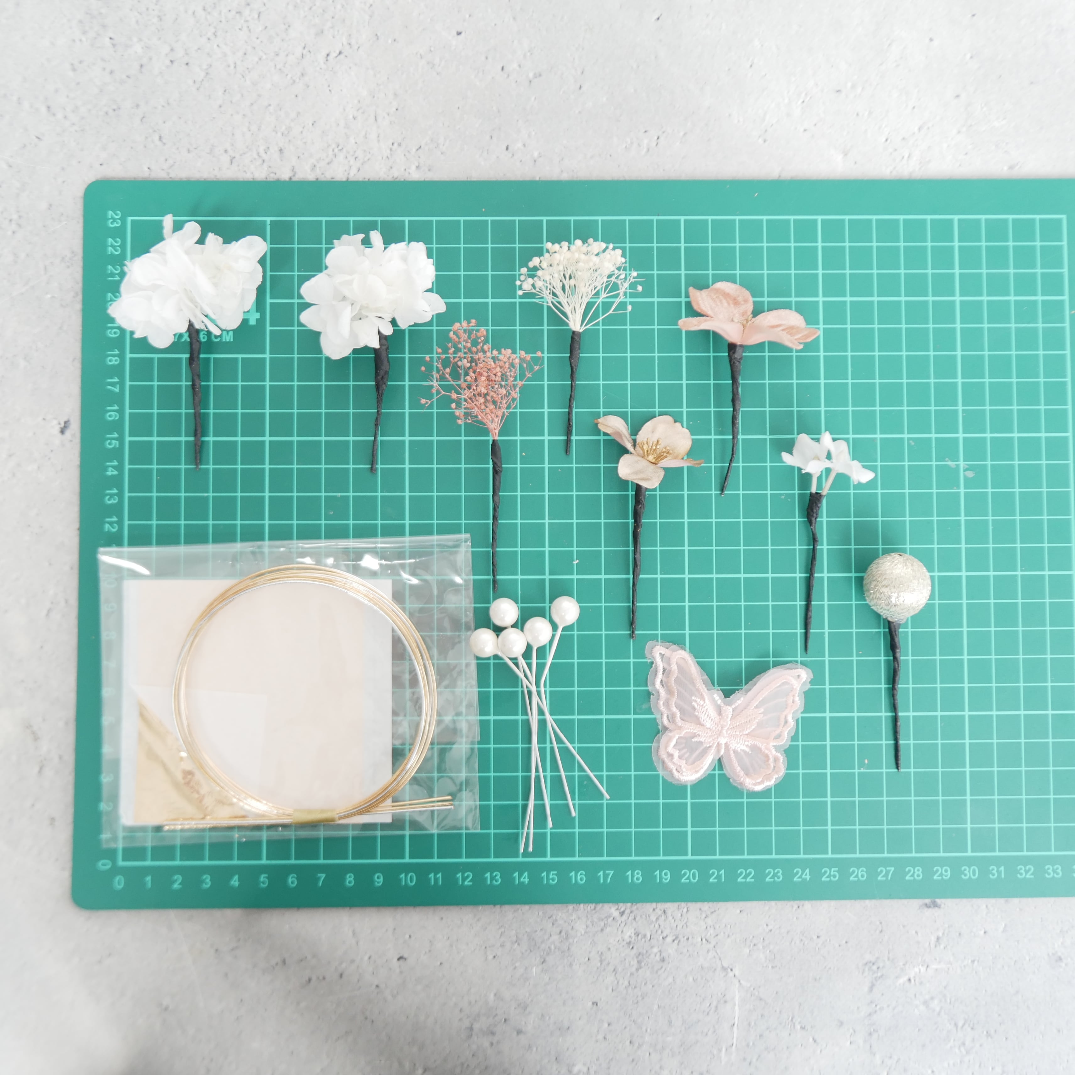 やわらかな白とピンクを基調にまとめた、華やかで上品なヘアアクセサリーセットです。