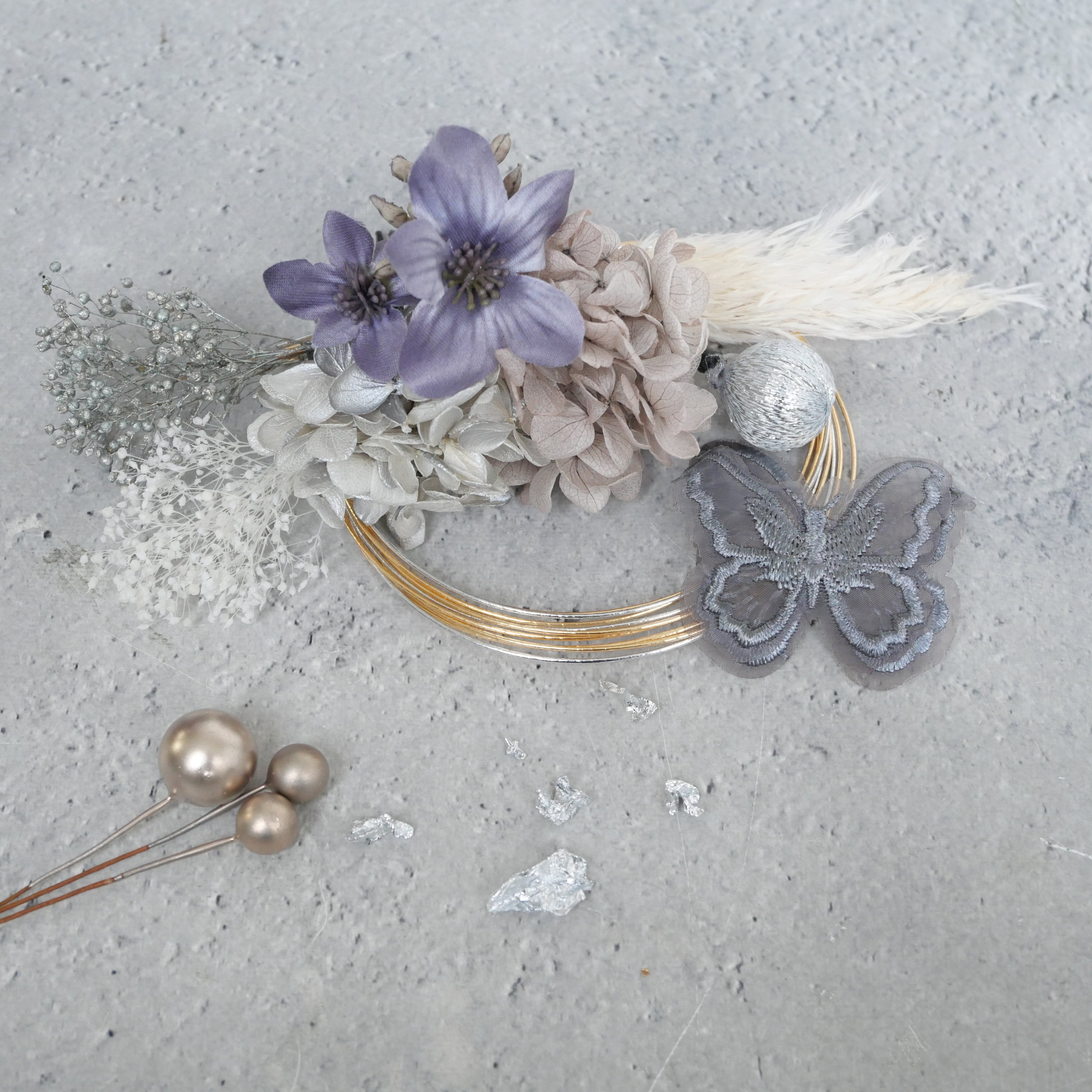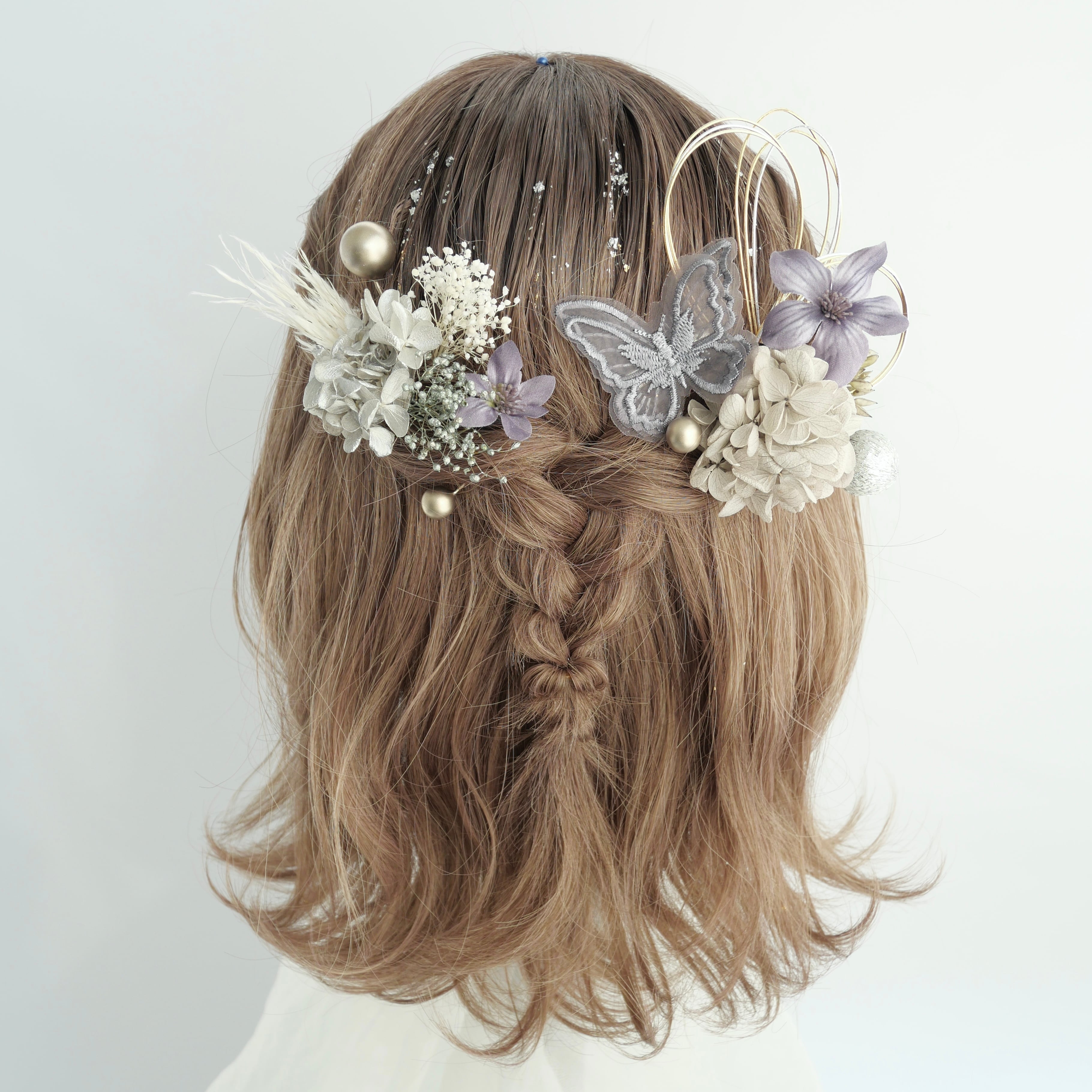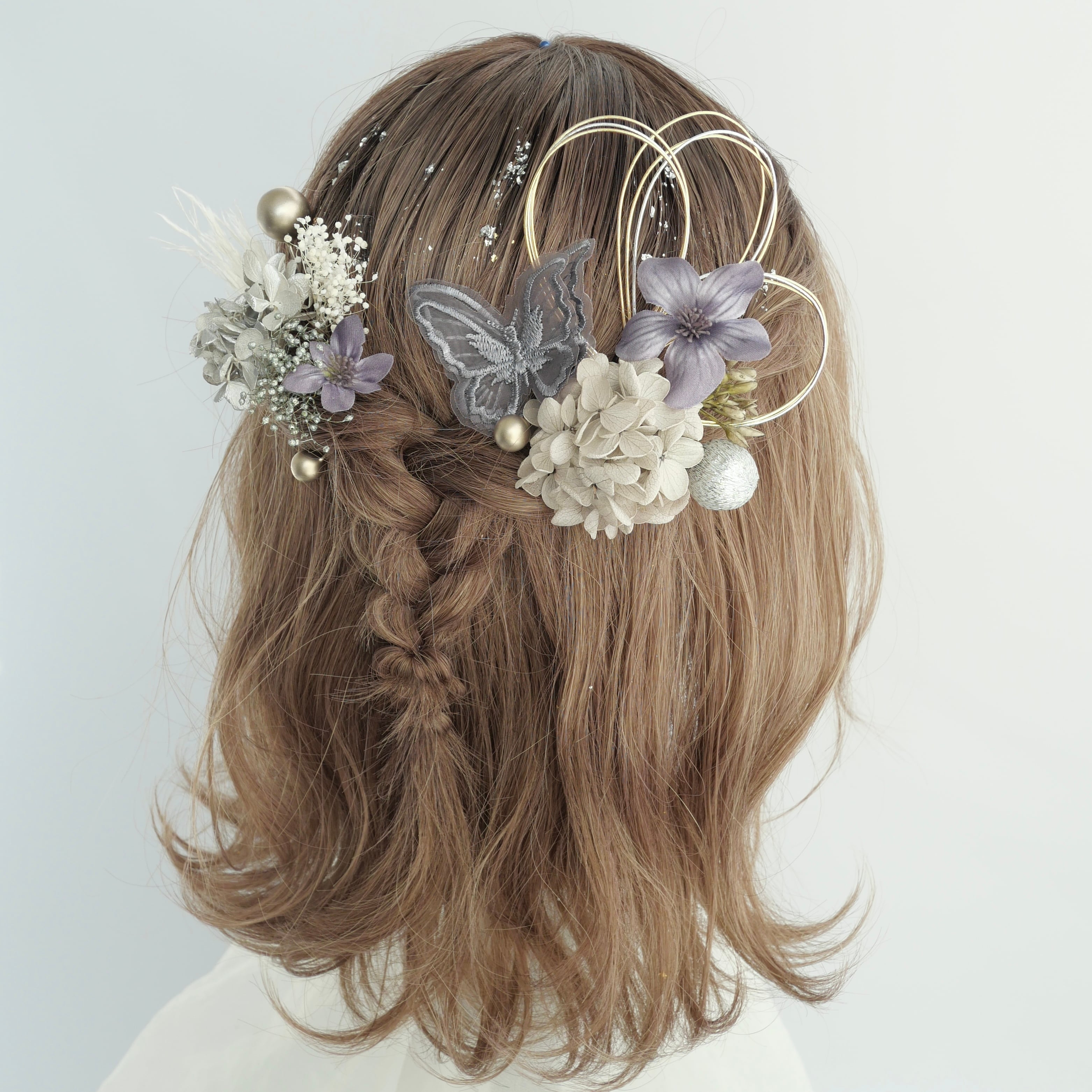 繊細なレース蝶モチーフを主役に、ニュアンスカラーのフラワーパーツやかすみ草、ブロンズの水引をバランスよく組み合わせました。落ち着いた色味の中に、ブロンズの和玉や箔がさりげなく輝き、後ろ姿を華やかに演出します。